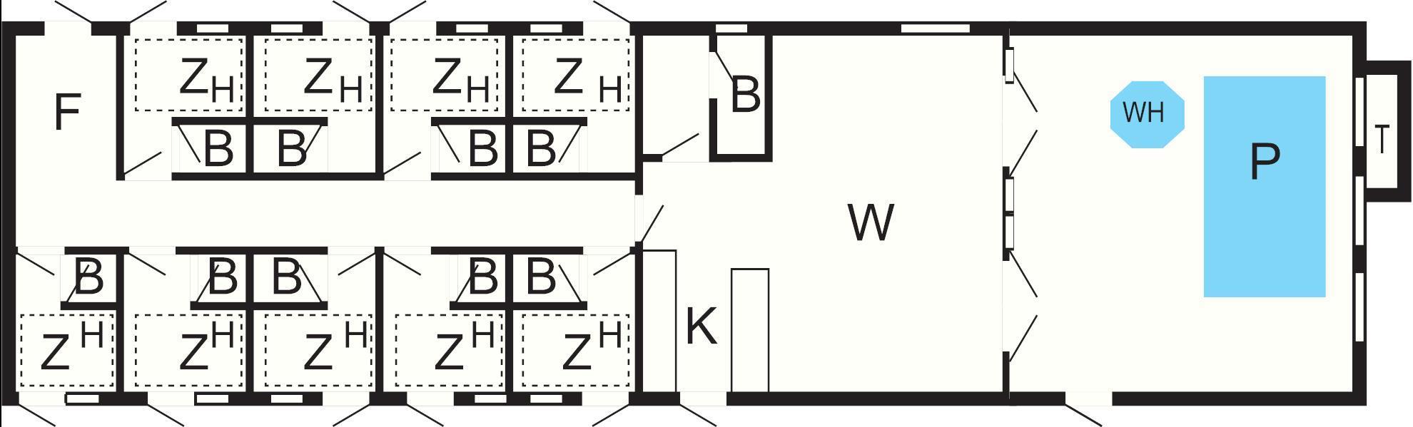 Diese äußerst geräumige Unterkunft mit 450 m2 großer Wohnfläche bietet Platz für z.B. sehr große Familienfeiern. Dafür stehen insgesamt neun gute Schlafzimmer, alle mit jeweils einem Doppelbett und einem Hems mit zwei weiteren Schlafplätzen zur Verfügung. Jedes Zimmer hat zudem ein eigenes Bad und eine kleine Teeküche. Alle Zimmer verfügen über einen eigenen Fernseher.
