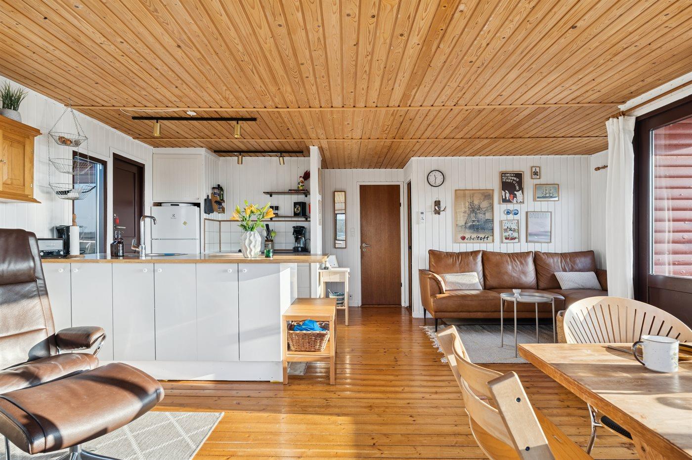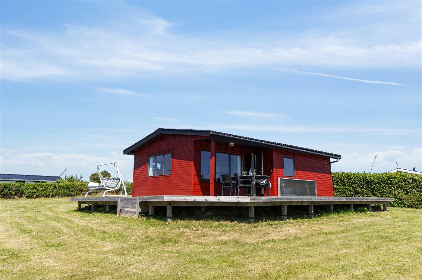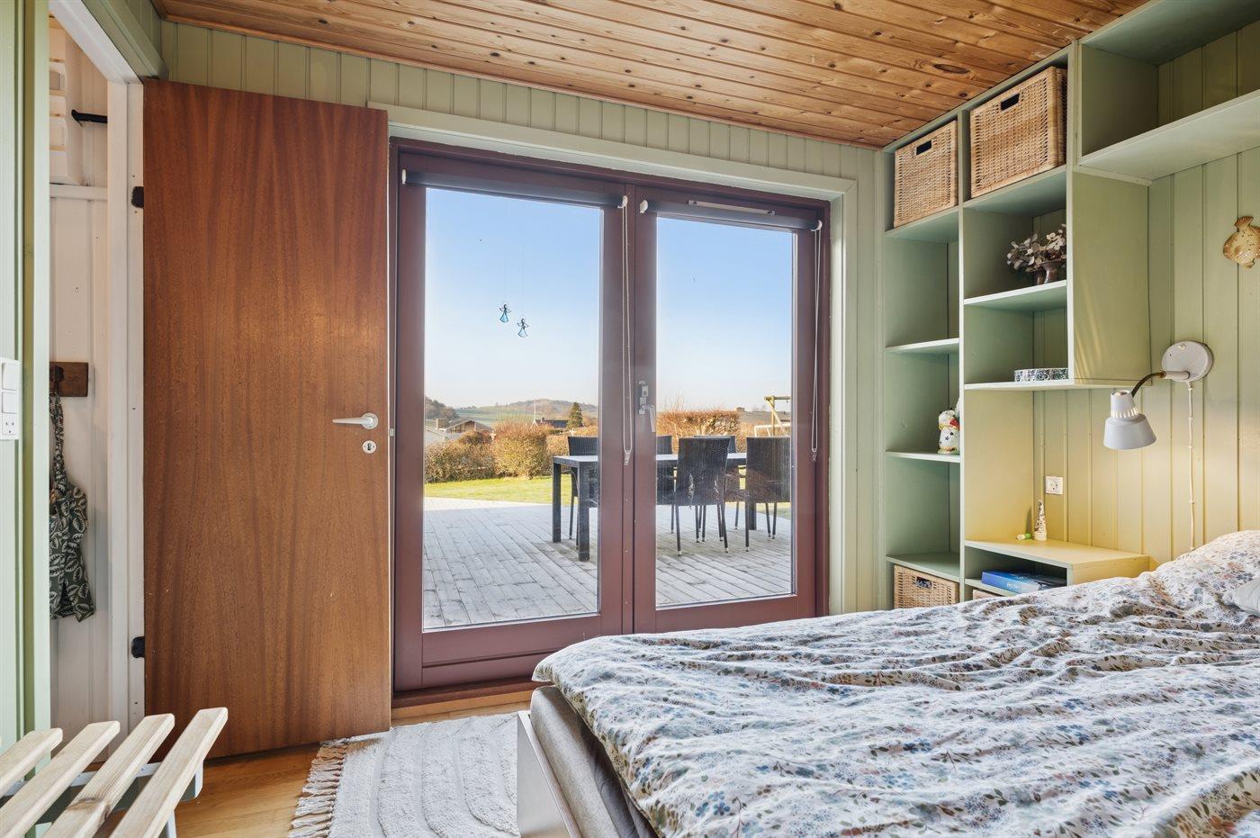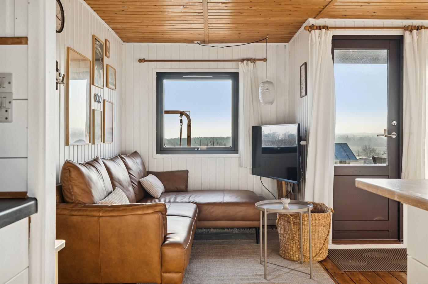 Hoch in den Hügeln von Dråby liegt dieses gemütliche Ferienhaus mit Blick über die Umgebung und das Wasser.