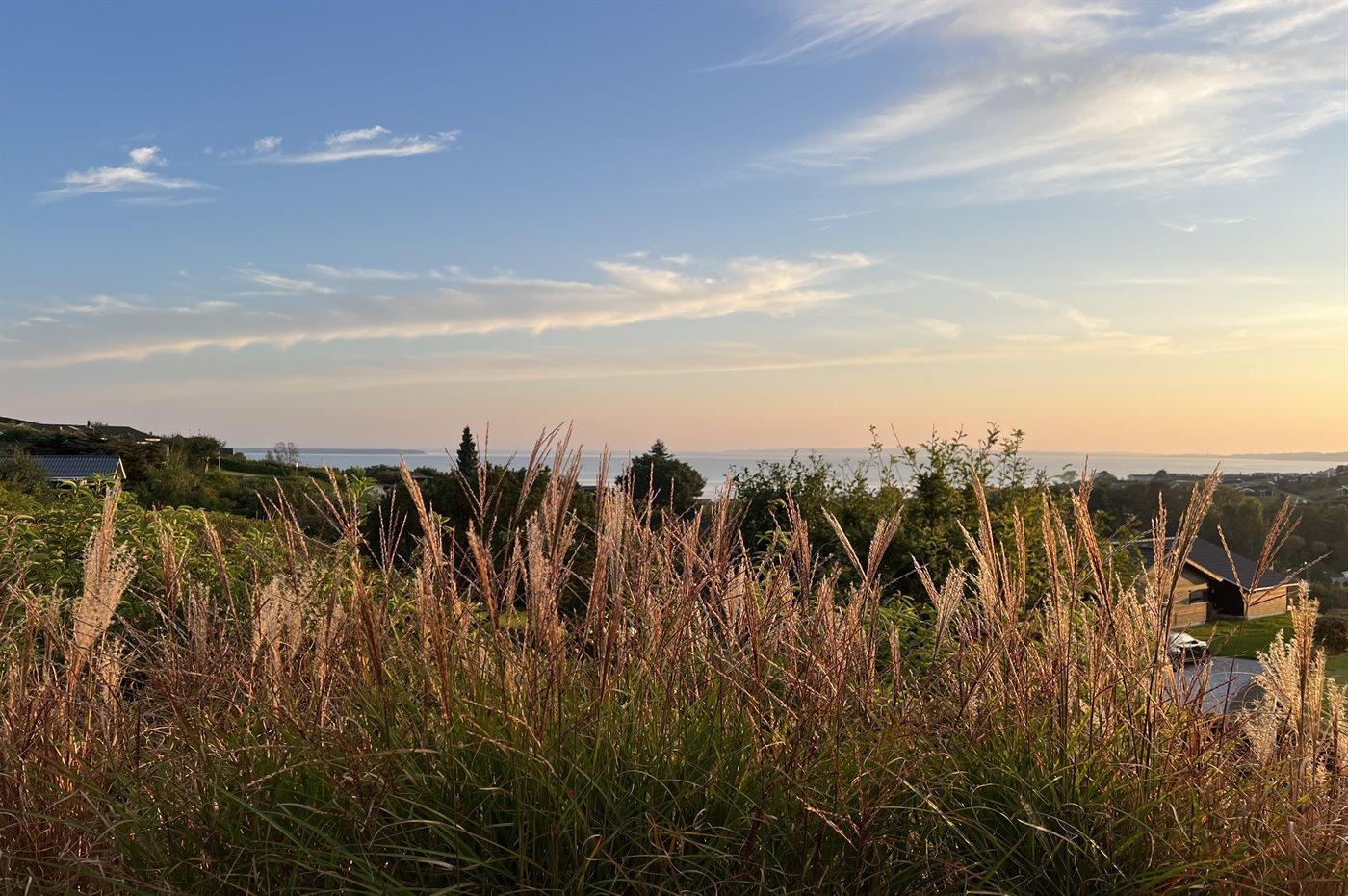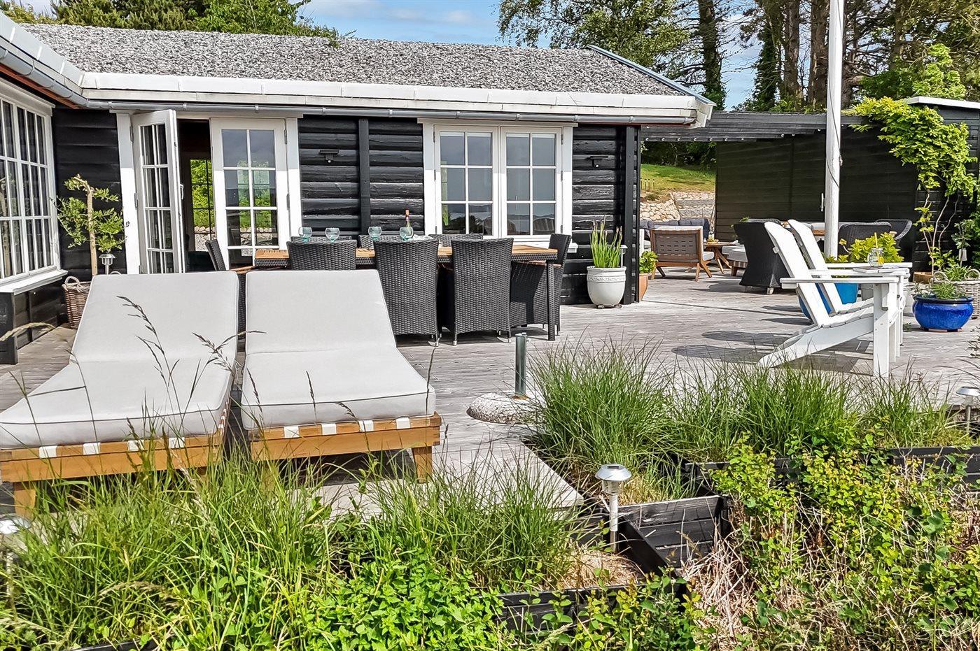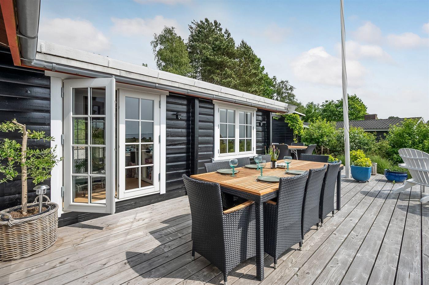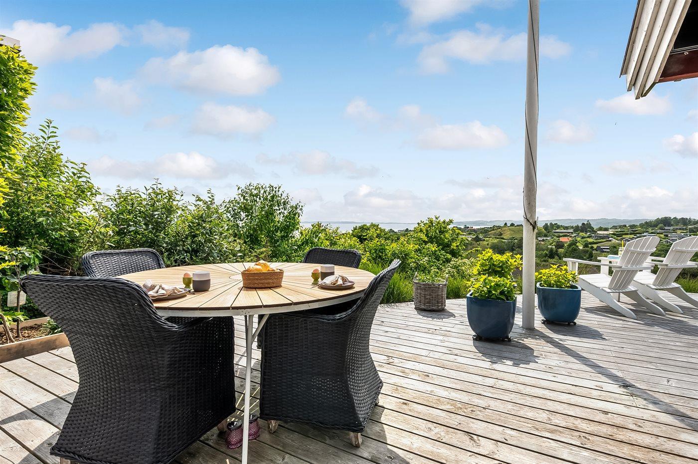 Gemütliches Ferienhaus in Ebeltoft mit Meerblick, großer Terrasse und ruhiger Lage für erholsame Tage am Wasser.