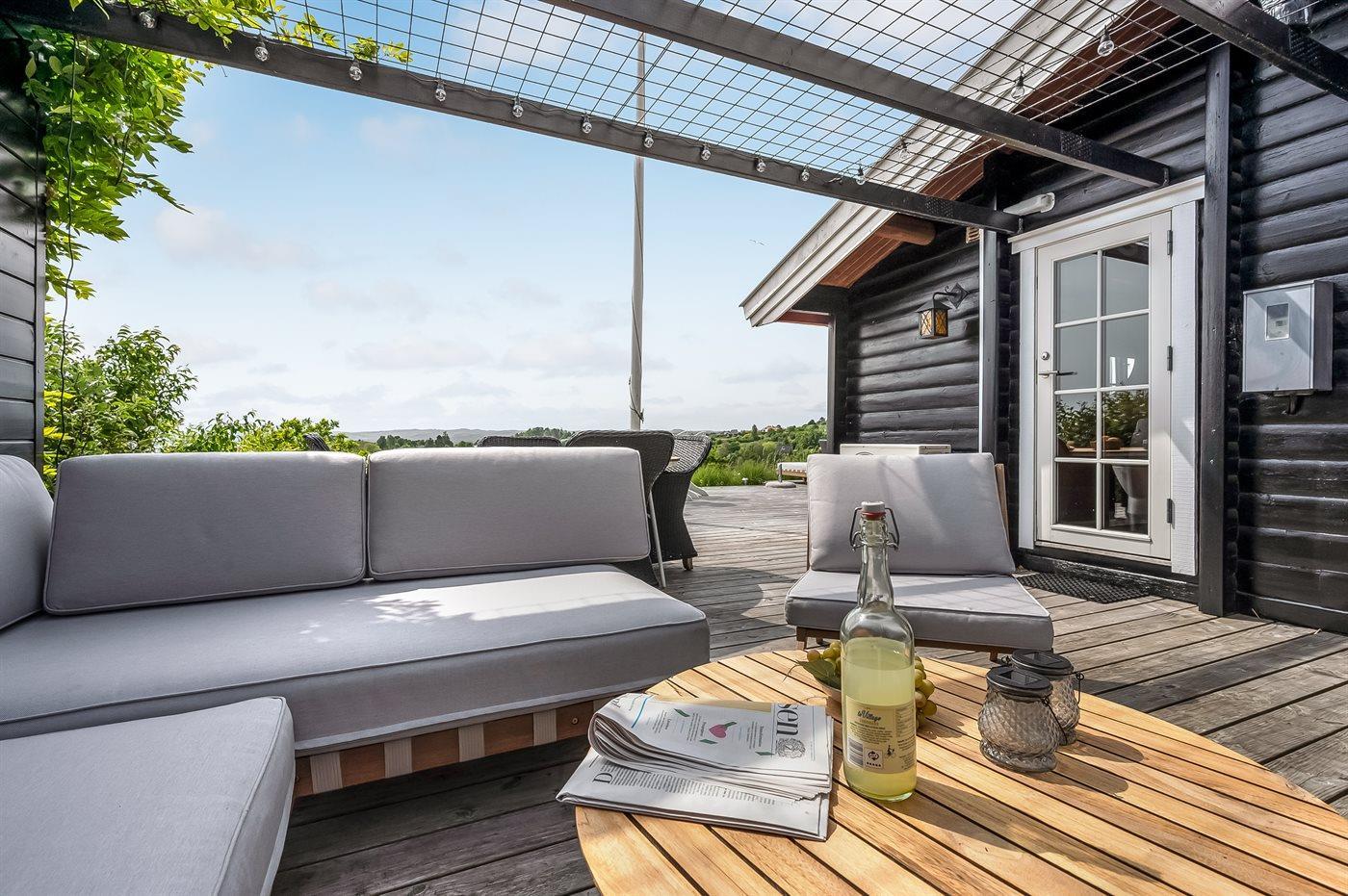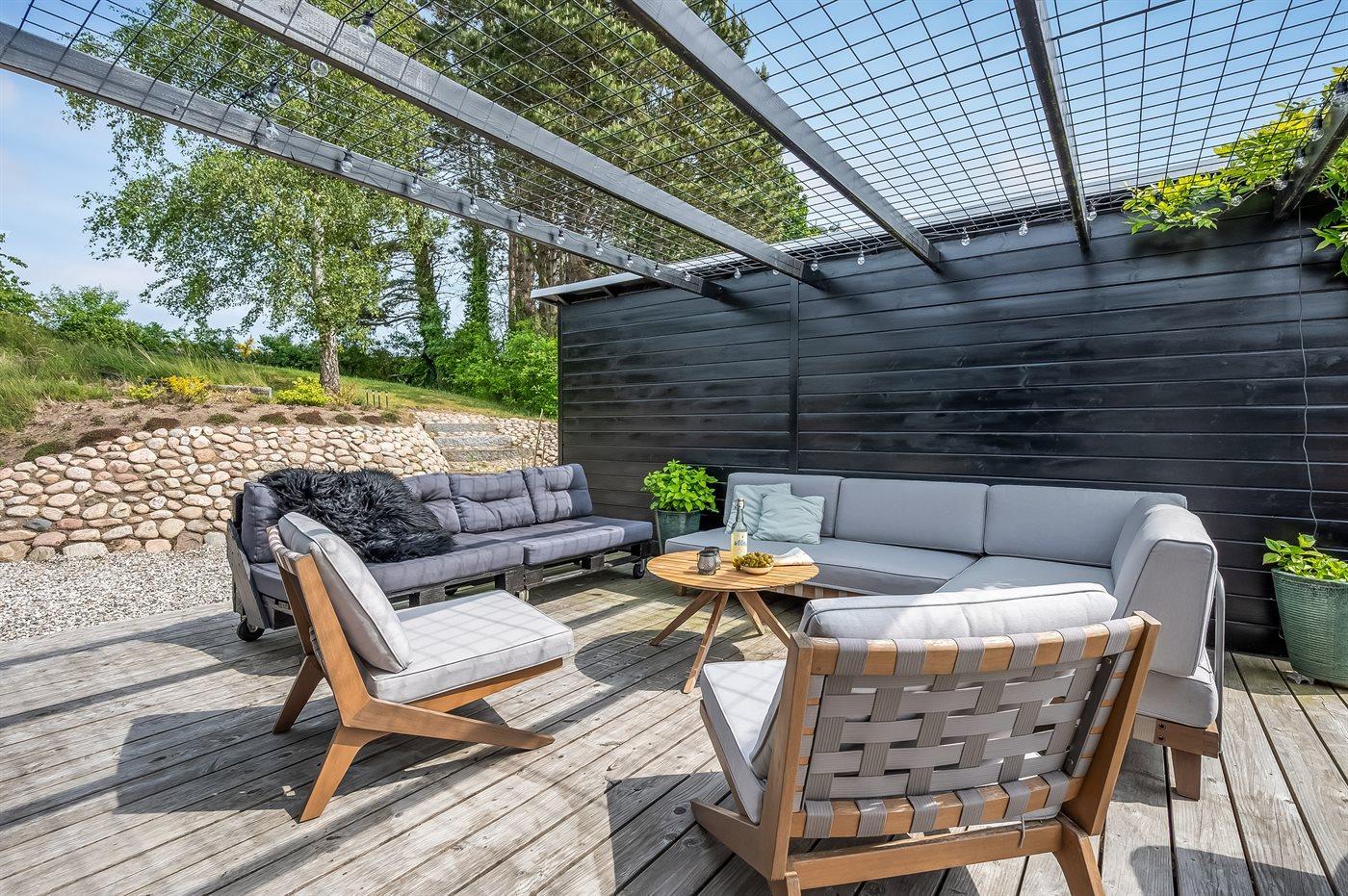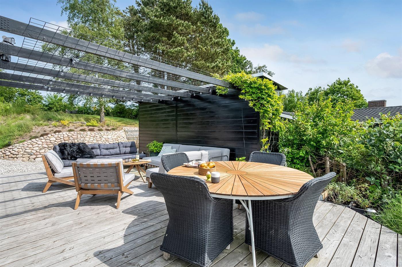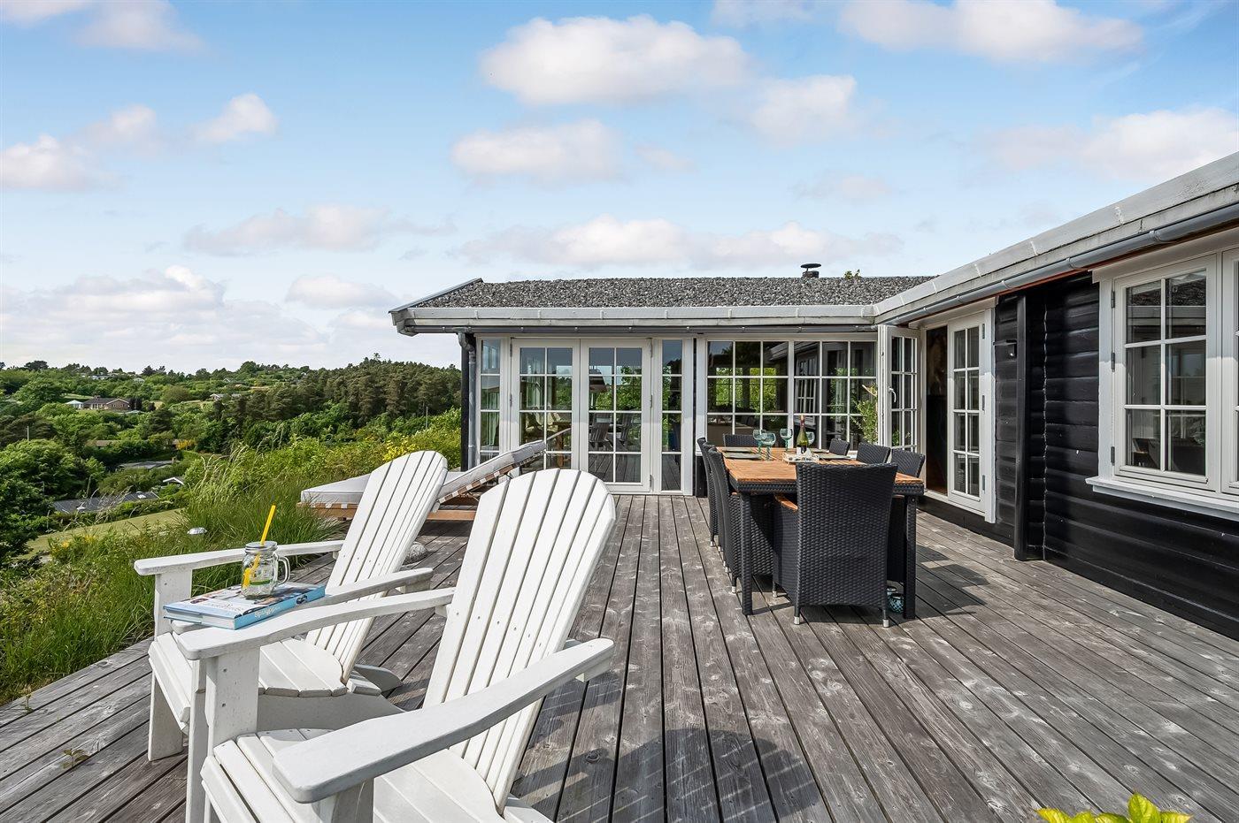 Gemütliches Ferienhaus in Ebeltoft mit Meerblick, großer Terrasse und ruhiger Lage für erholsame Tage am Wasser.