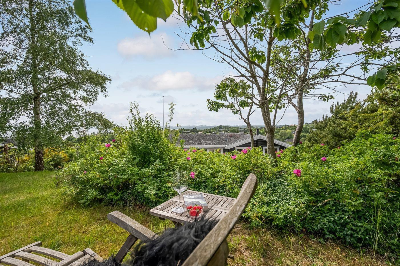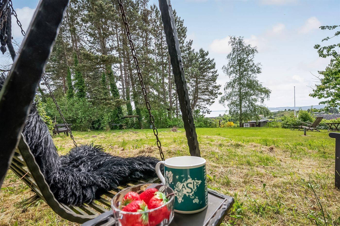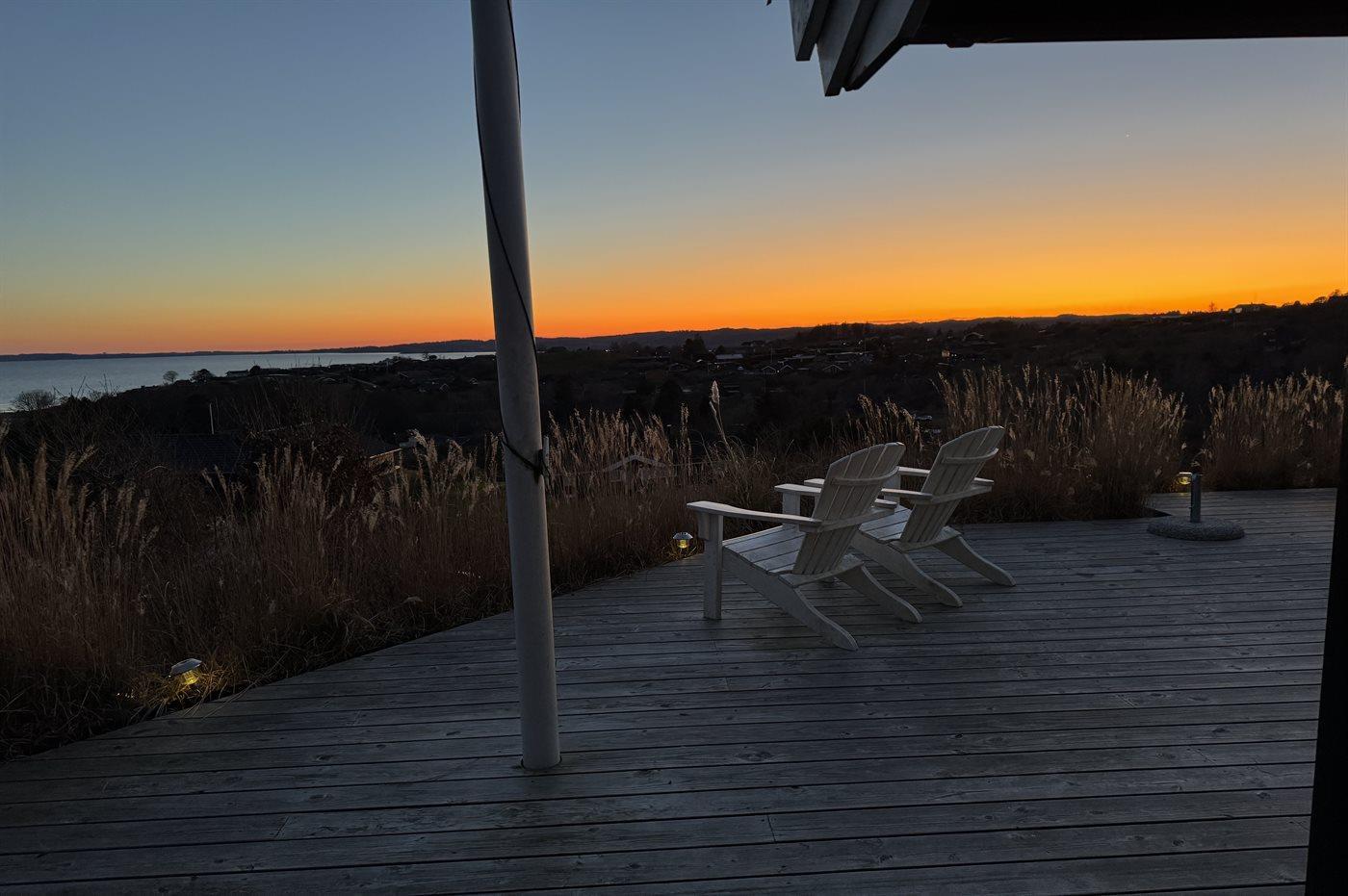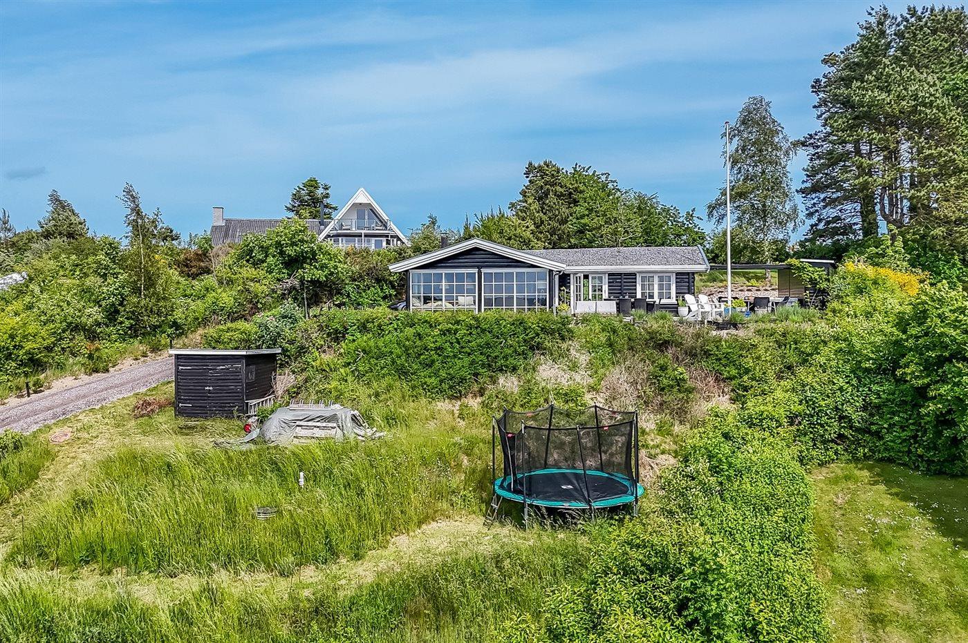 Mit einer phantastischen Aussicht über das Wasser, wo die Stadt Ebeltoft im Hintergrund zu ahnen ist, liegt dieses gemütliche und gepflegte Ferienhaus. Die Aussicht können Sie sowohl vom Haus als auch von der großen Terrasse aus genießen. Das Haus liegt ungestört – in schöner und ruhiger Umgebung und aufgrund der hohen Lage können Sie die schöne Aussicht auf die Umgebung genießen.