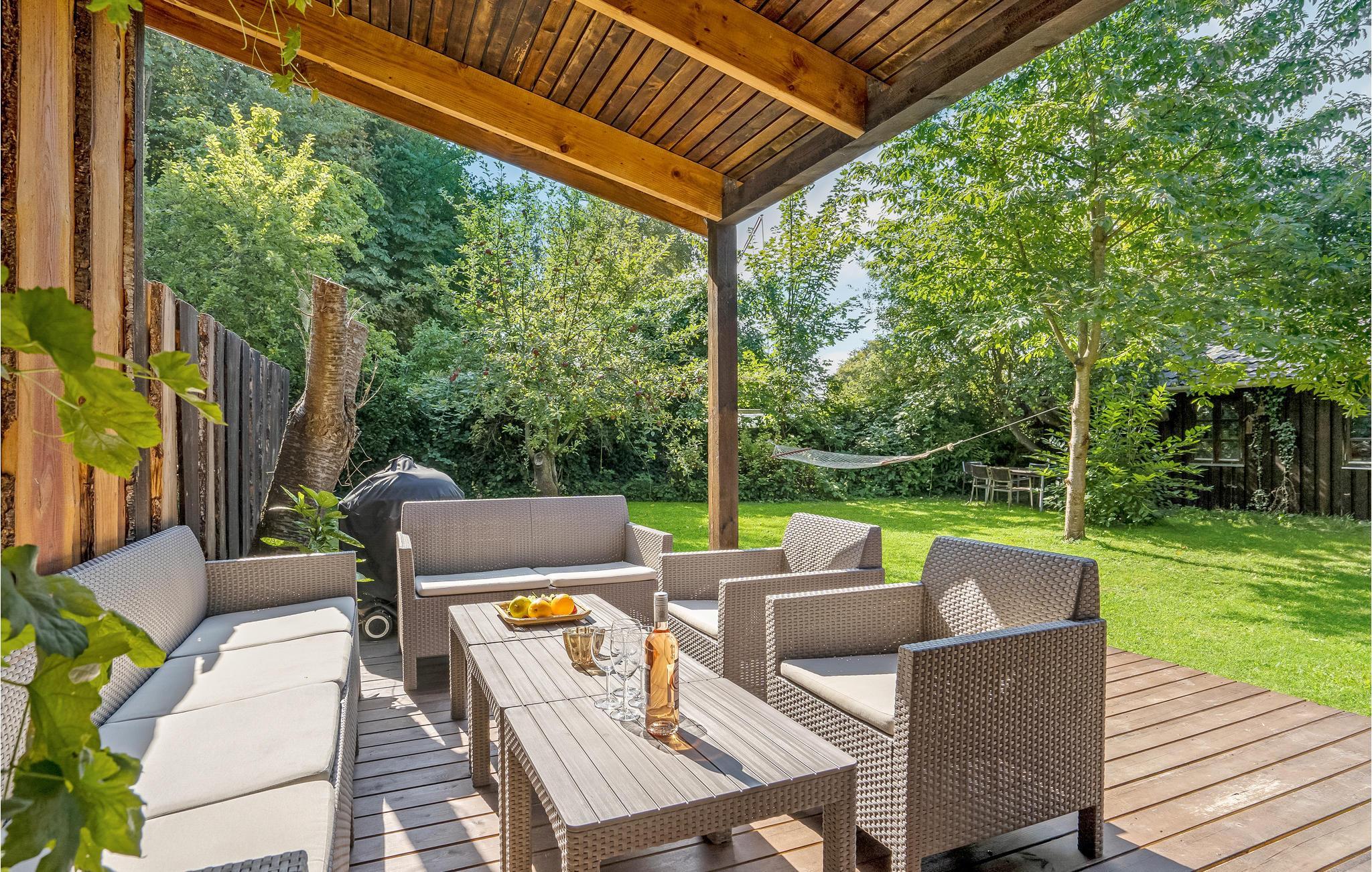 Der private Garten bietet ideale Bedingungen, um den Urlaub im Freien zu verbringen. Entlang des Hauses verlaufen mehrere Terrassen, die viel Platz zum Sonnenbaden, gemeinsame Mahlzeiten oder einem Glas Wein am Abend bieten.