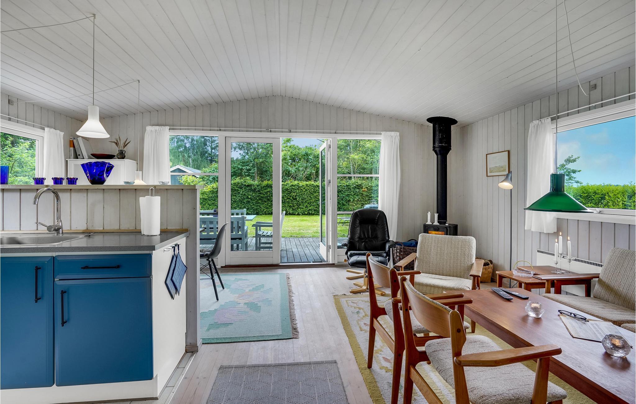 Schönes und gepflegtes Ferienhaus mit eingezäuntem Gartengrundstück und Aussicht nach Westen auf Wiesen und Äcker. Das Haus liegt ruhig und 150 m von herrlichen Sandstrand in Elkenøre. Mit drei guten Schlafzimmern, einem Wohnzimmer mit Kaminofen und einer praktischen Küche in offener Verbindung zum Wohnbereich gibt es gute Bedingungen für einen schönen Urlaub. Eine Glasfassade zur überdachten Terrasse macht alles hell, diese Terrasse ist auf einer Seite abgeschirmt.