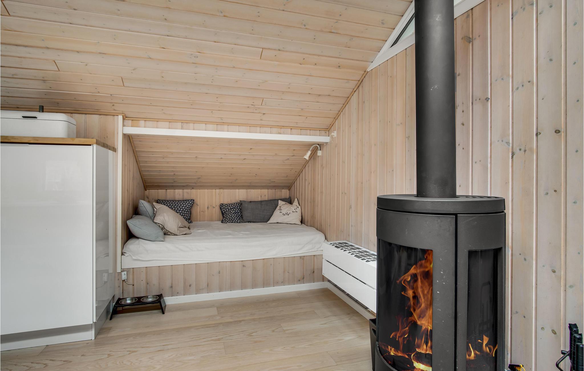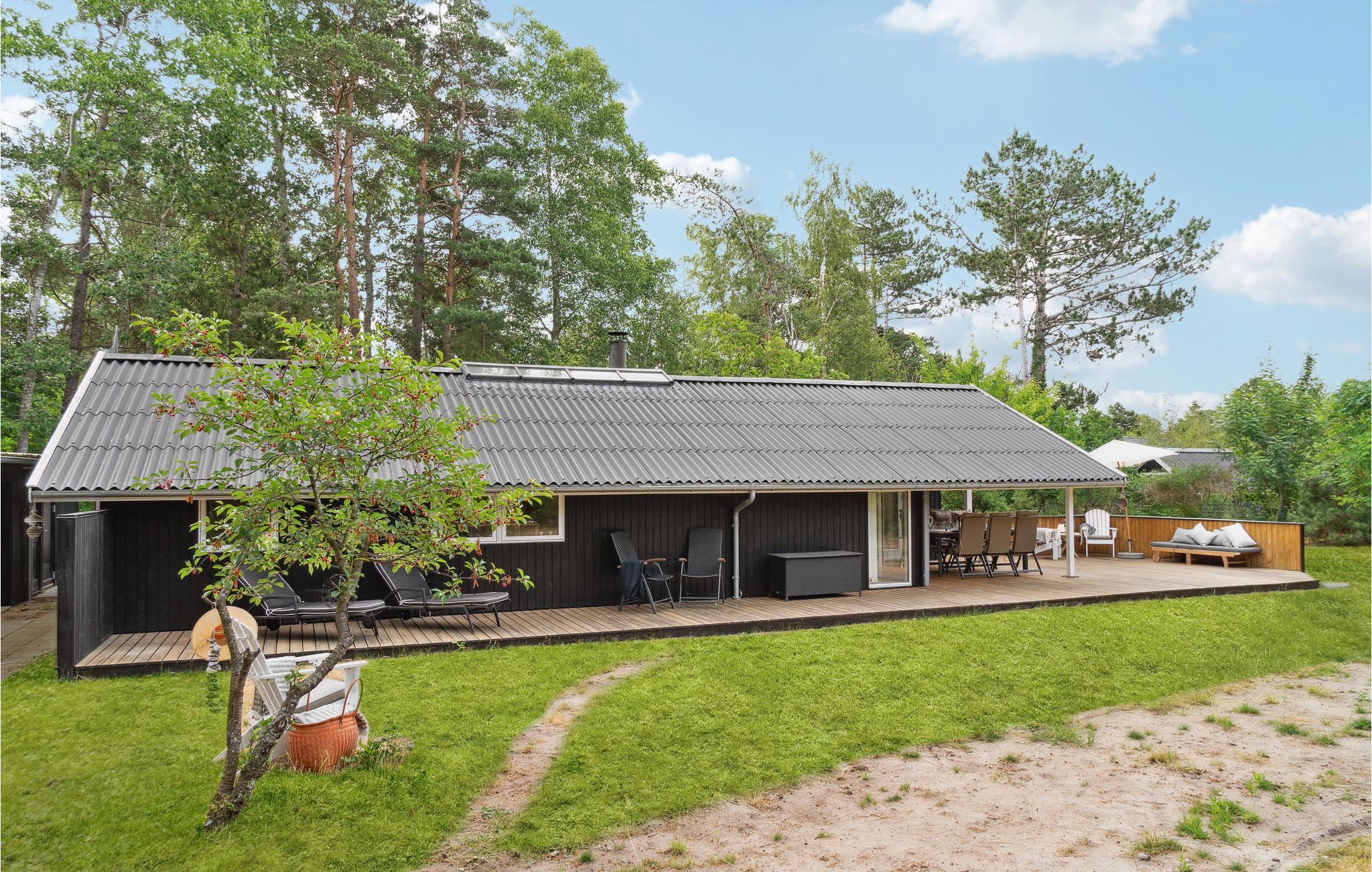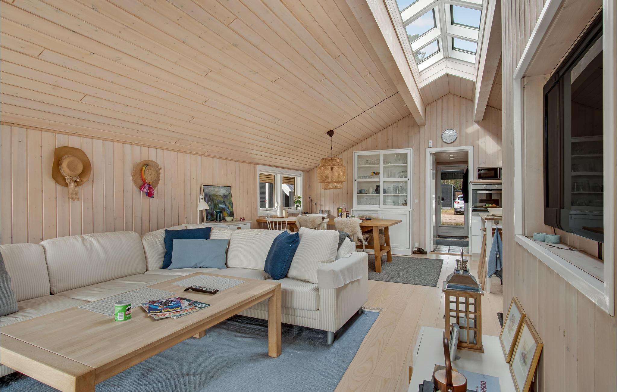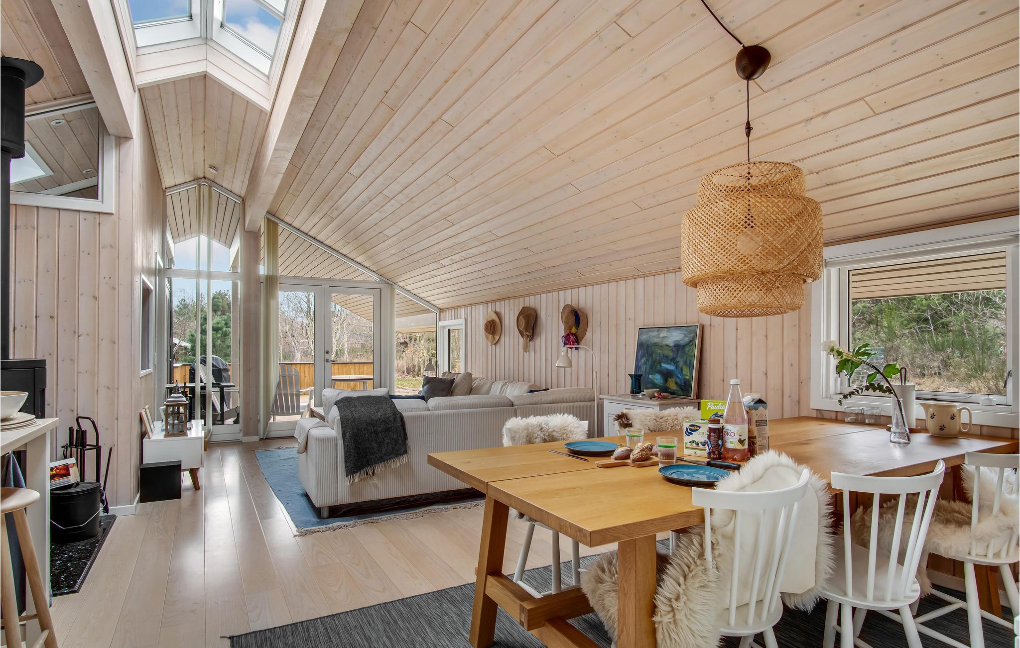 In idyllischer Lage umgeben von Bäumen erwartet Sie dieses einladende Ferienhaus. Die helle und moderne Einrichtung lädt dazu ein, in vollen Zügen mit Ihren Lieben zu entspannen. Holzverkleidete Wände und die geschmackvollen Möbel sorgen für den wohnlichen Charme der Räume. Genießen Sie gemeinsame Mahlzeiten am langen Esstisch mit wunderbarem Blick in den Garten. Nach einem schönen Tag am Meer oder einem spannenden Ausflug in der Umgebung können Sie es sich in der einladenden Sofalandschaft mit Blick ins Freie bequem machen und zusammen Spiele spielen. Besonders gemütlich wird es, wenn Sie im Kaminofen anfeuern und beim Knistern der Flammen noch lange gemütlich plaudern.