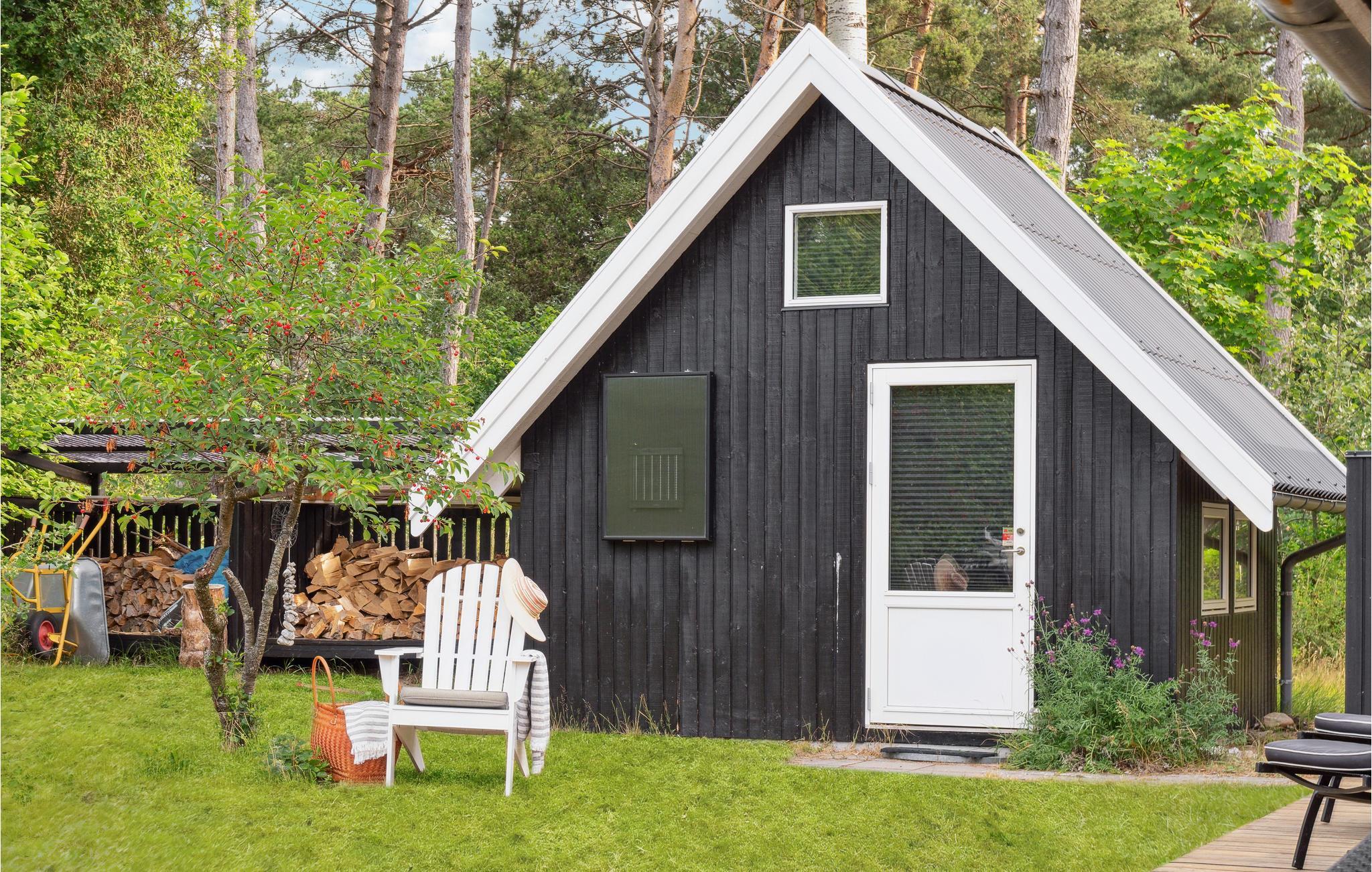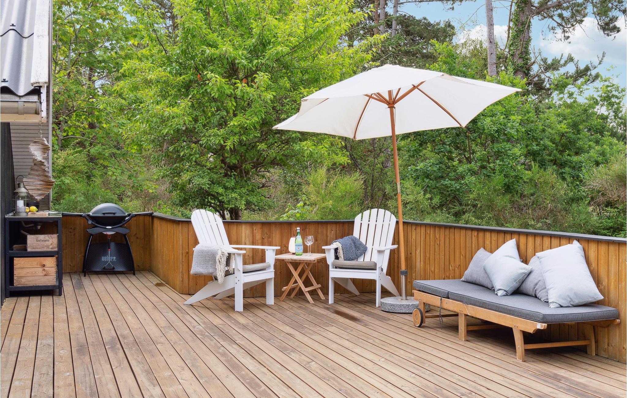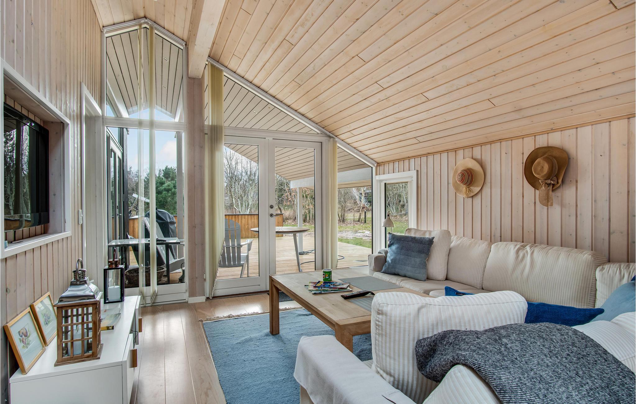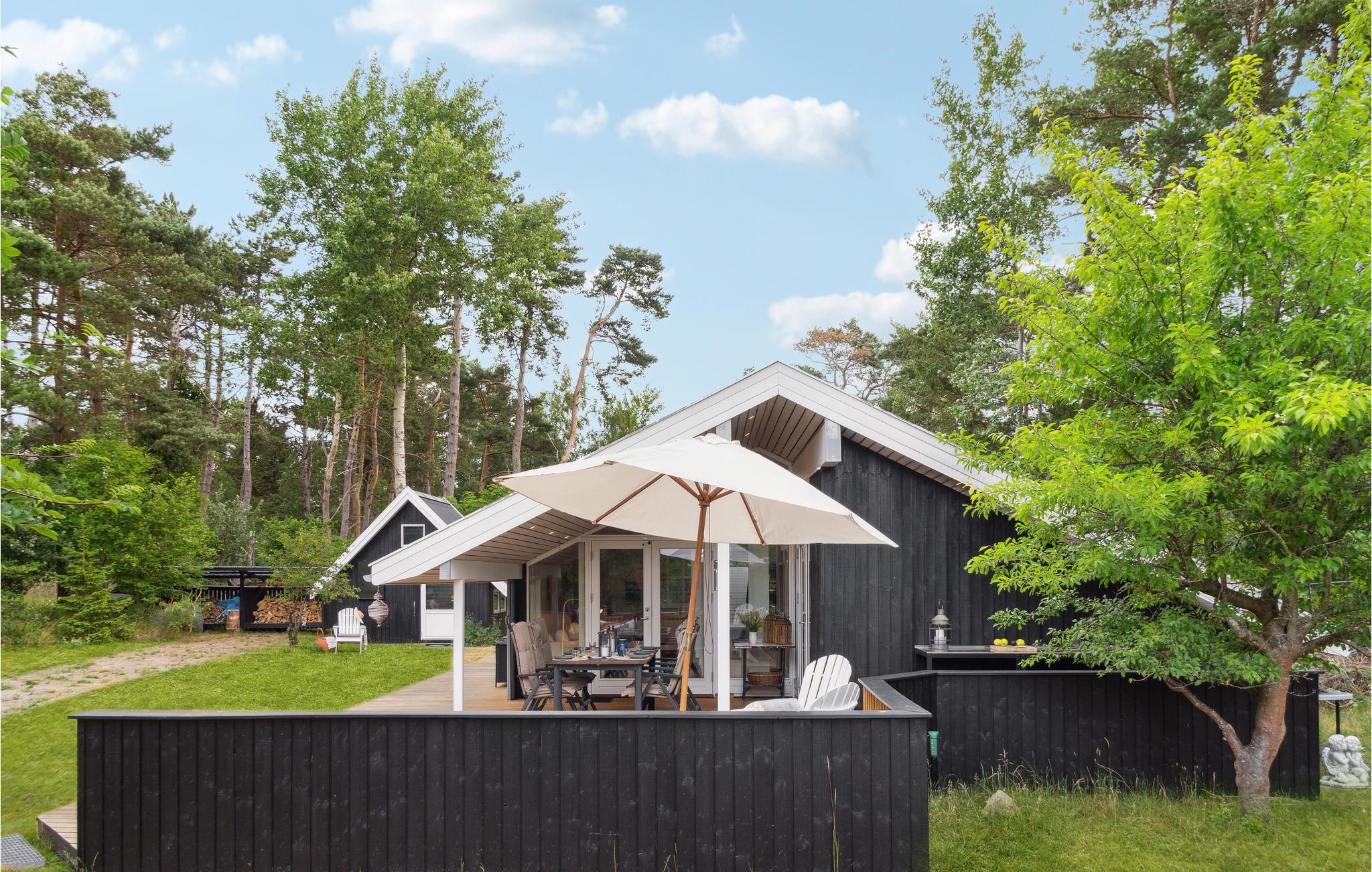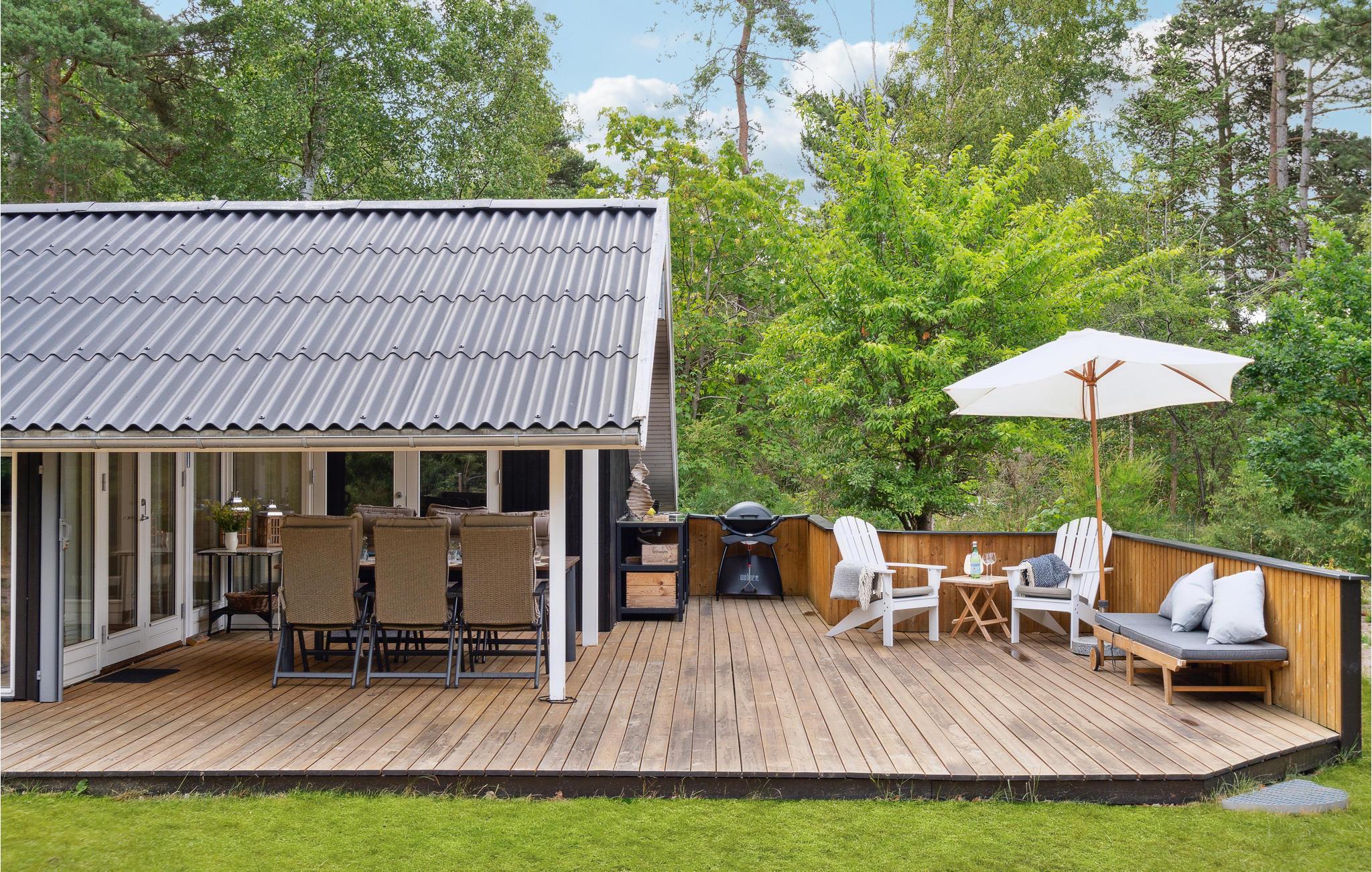 In idyllischer Lage umgeben von Bäumen erwartet Sie dieses einladende Ferienhaus. Die helle und moderne Einrichtung lädt dazu ein, in vollen Zügen mit Ihren Lieben zu entspannen. Holzverkleidete Wände und die geschmackvollen Möbel sorgen für den wohnlichen Charme der Räume. Genießen Sie gemeinsame Mahlzeiten am langen Esstisch mit wunderbarem Blick in den Garten. Nach einem schönen Tag am Meer oder einem spannenden Ausflug in der Umgebung können Sie es sich in der einladenden Sofalandschaft mit Blick ins Freie bequem machen und zusammen Spiele spielen. Besonders gemütlich wird es, wenn Sie im Kaminofen anfeuern und beim Knistern der Flammen noch lange gemütlich plaudern.