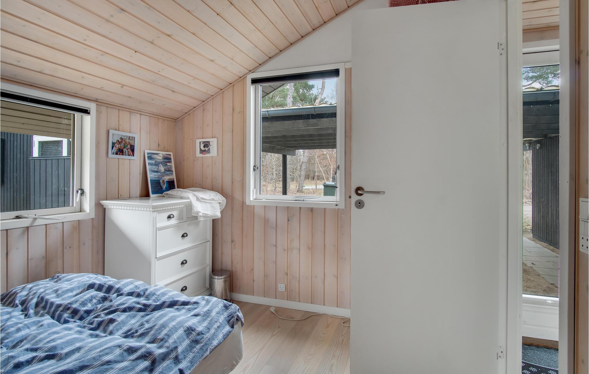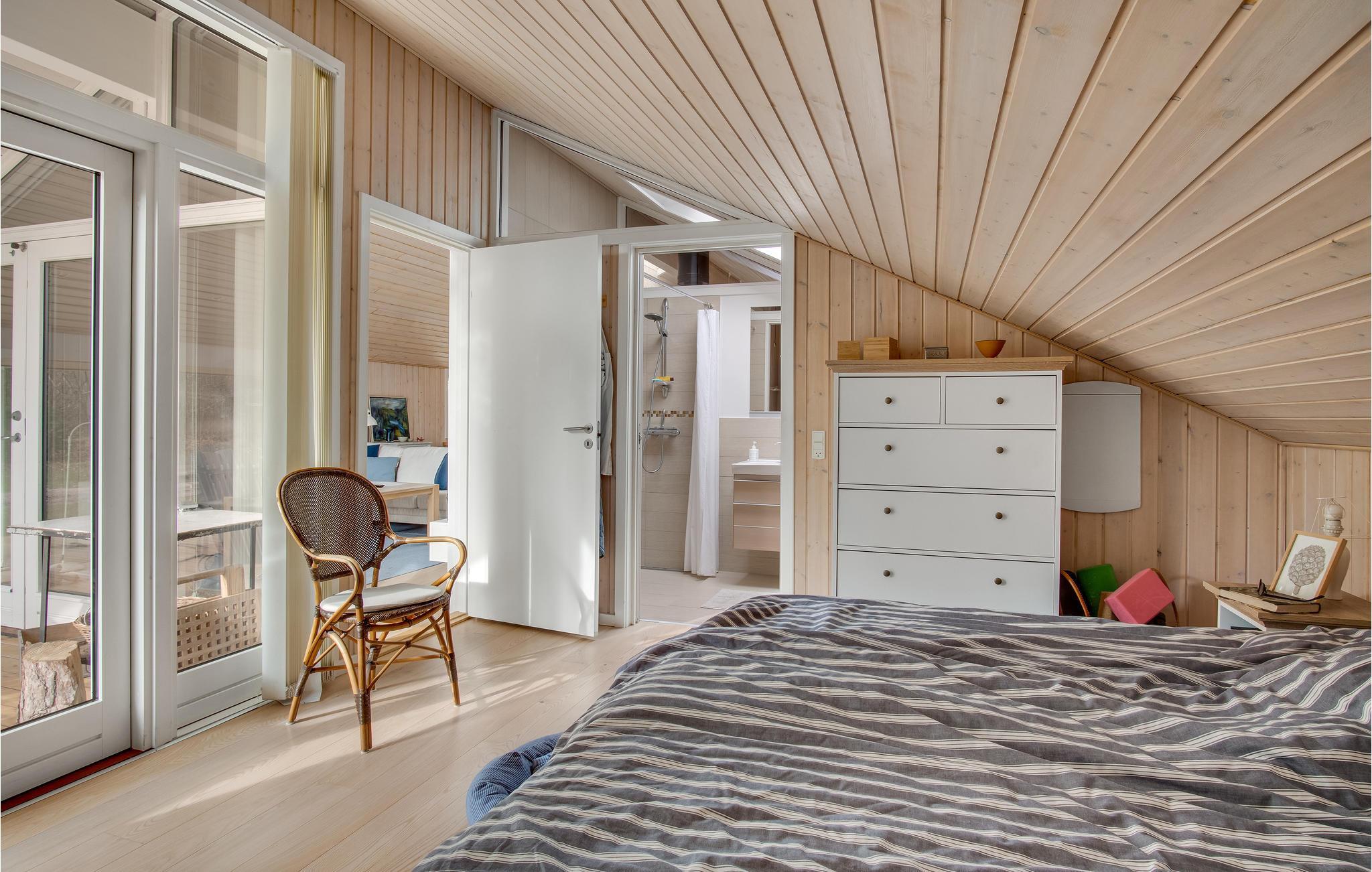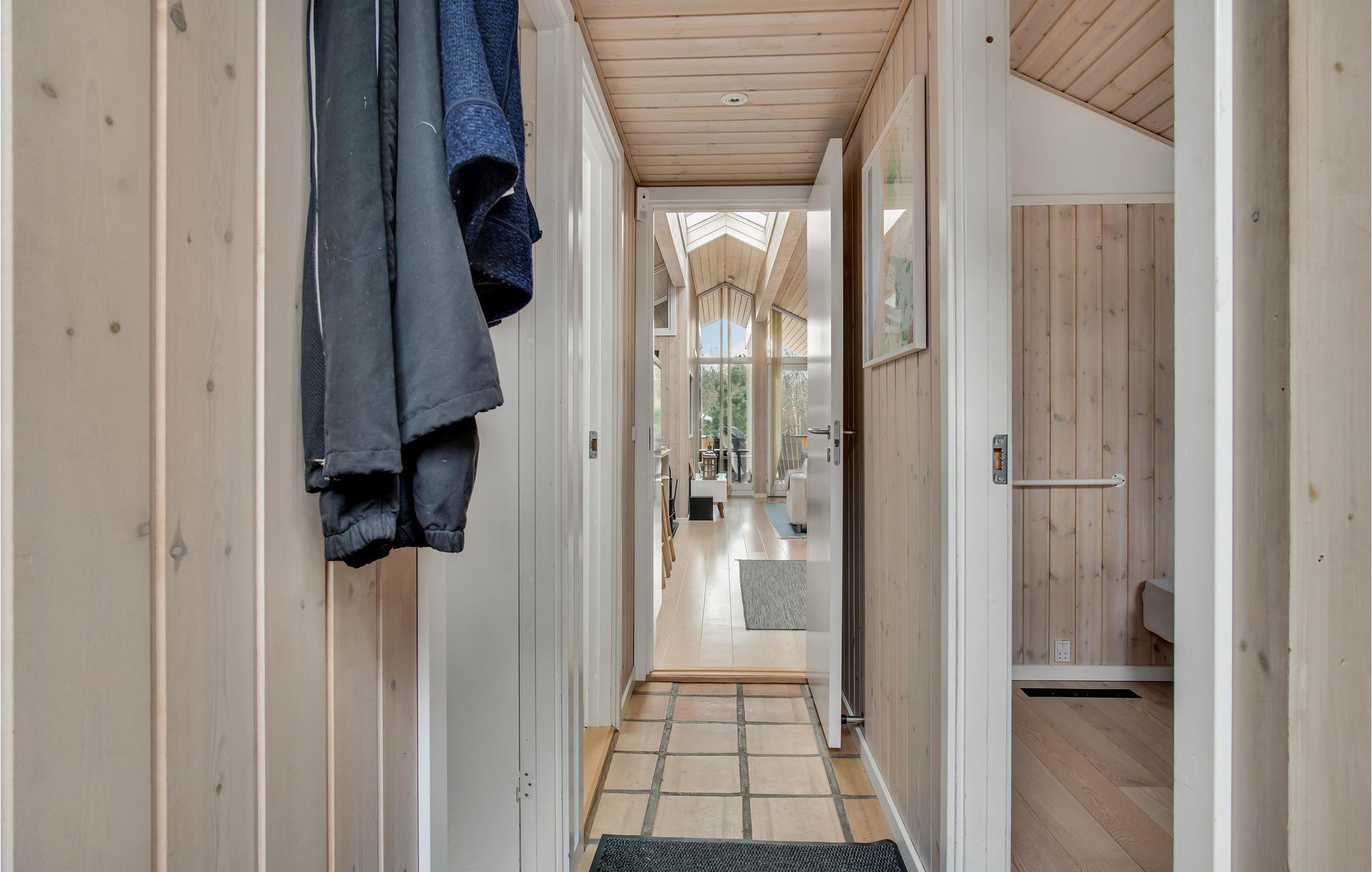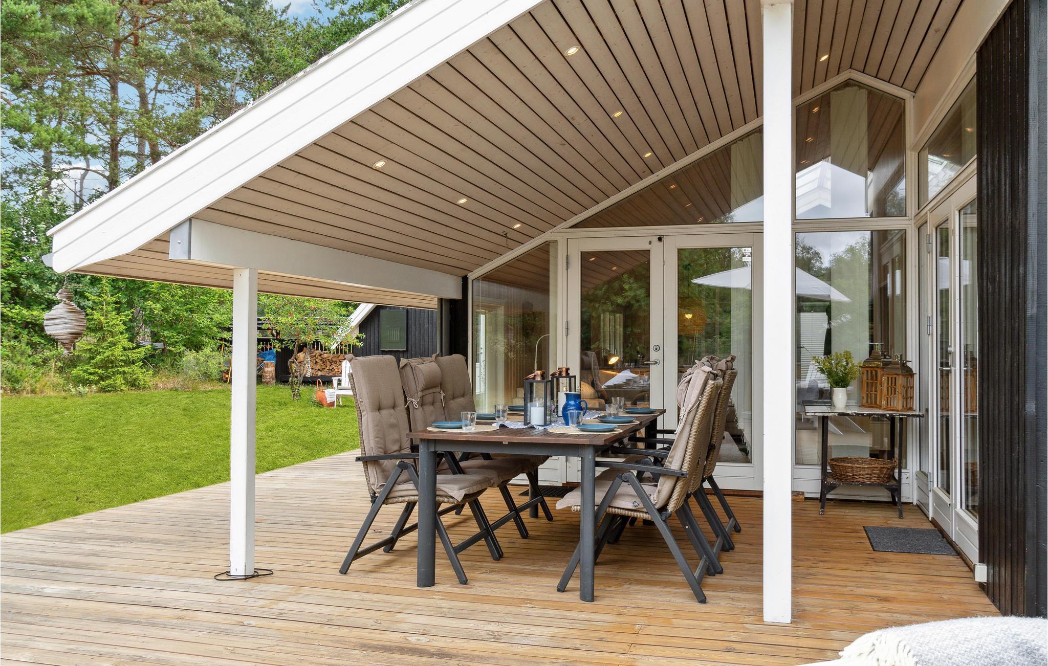 In idyllischer Lage umgeben von Bäumen erwartet Sie dieses einladende Ferienhaus. Die helle und moderne Einrichtung lädt dazu ein, in vollen Zügen mit Ihren Lieben zu entspannen. Holzverkleidete Wände und die geschmackvollen Möbel sorgen für den wohnlichen Charme der Räume. Genießen Sie gemeinsame Mahlzeiten am langen Esstisch mit wunderbarem Blick in den Garten. Nach einem schönen Tag am Meer oder einem spannenden Ausflug in der Umgebung können Sie es sich in der einladenden Sofalandschaft mit Blick ins Freie bequem machen und zusammen Spiele spielen. Besonders gemütlich wird es, wenn Sie im Kaminofen anfeuern und beim Knistern der Flammen noch lange gemütlich plaudern.