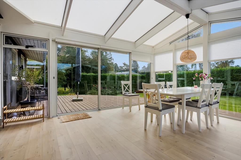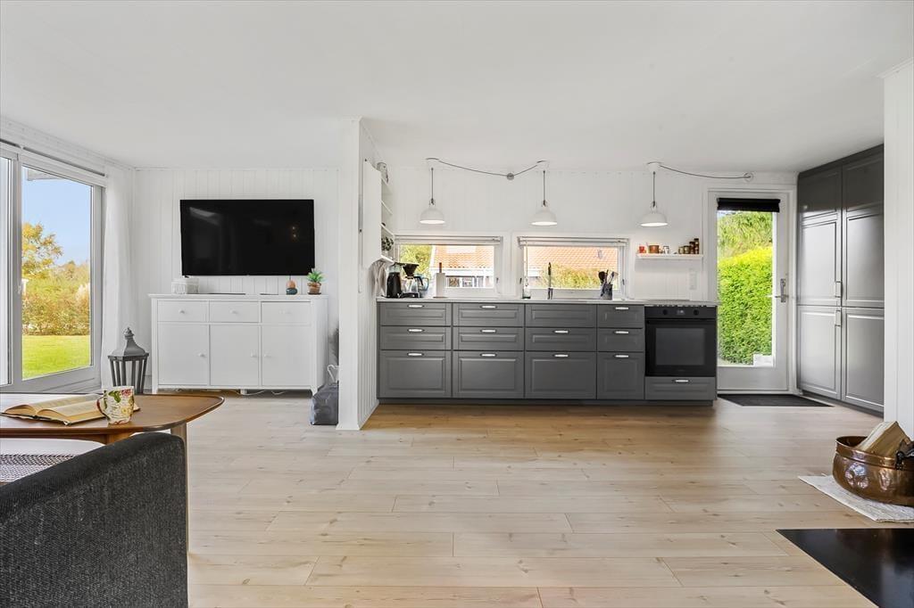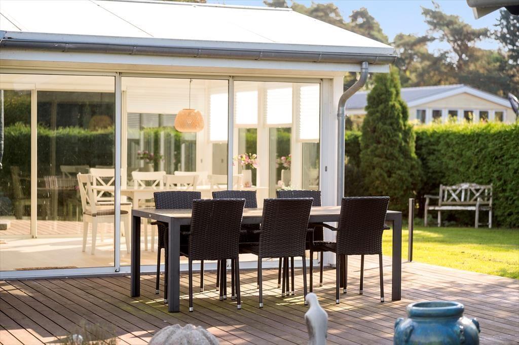 Willkommen in deinem Ferienhaus: Über den großen und hellen Wintergarten gelangt man in das Wohn- und Esszimmer mit offener Küche. Die Küche ist ausgestattet mit Kühlschrank, Gefrierschrank und Elektroherd mit Backofen. Das Wohnzimmer ist hell und modern eingerichtet und bietet Zugang zum 19 m² großen Wintergarten, von dem aus man in den gemütlichen Garten gelangt.