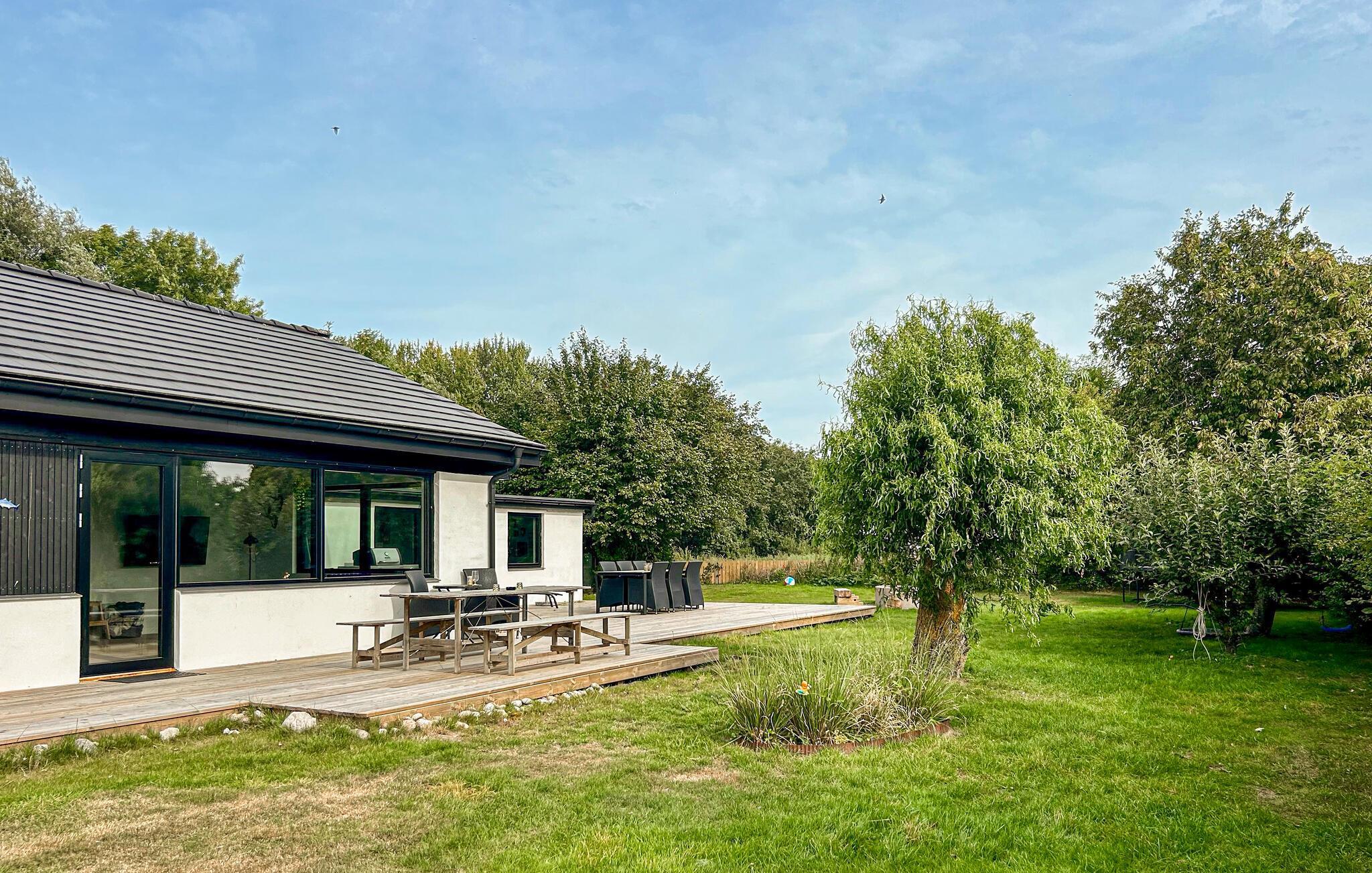 Attraktives Ferienhaus auf Endelave mit Meerblick, großer Terrasse und moderner Ausstattung für erholsame Urlaubstage.