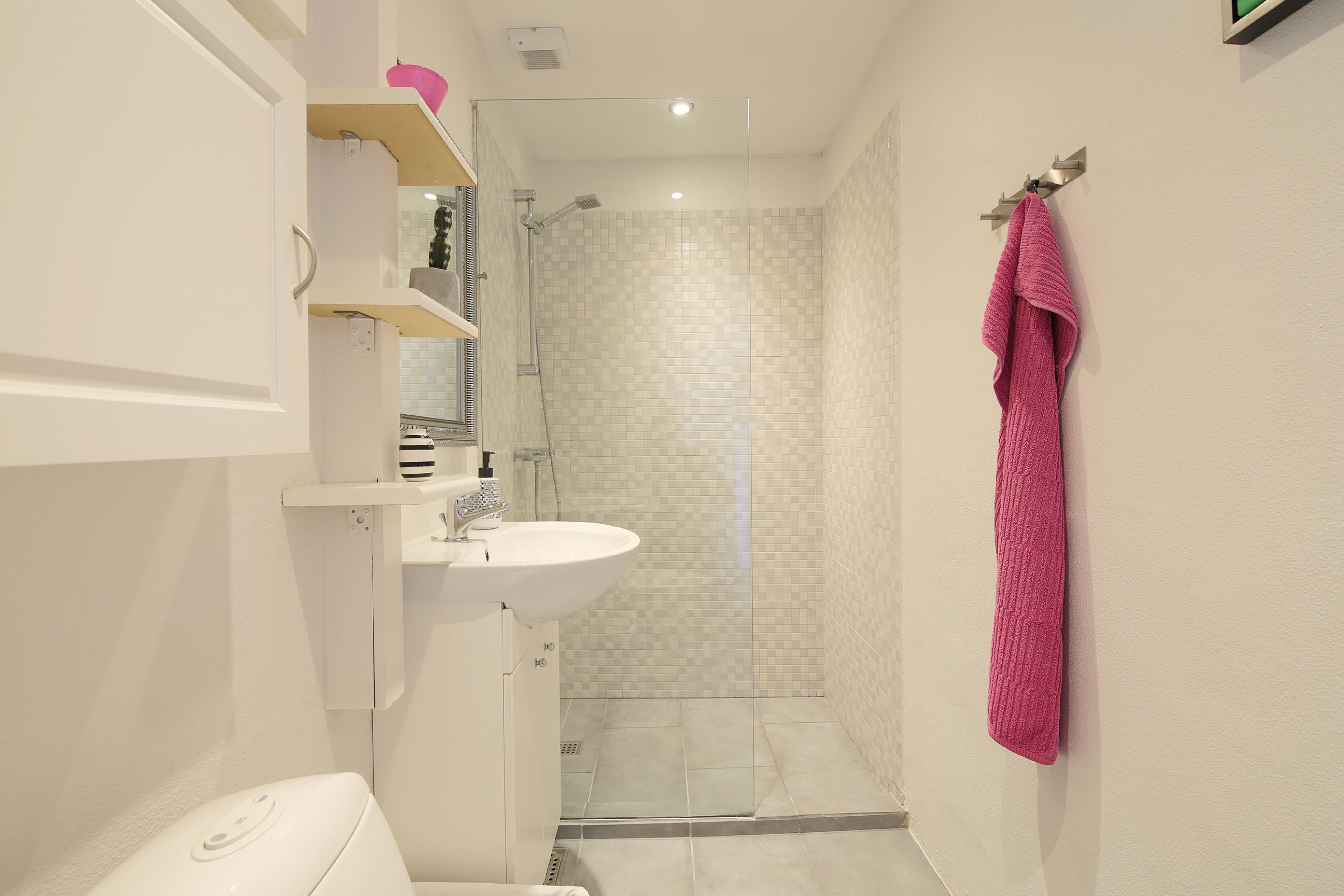 Das Badezimmer hat eine Duschkabine, Handwaschbecken und Toilette.
