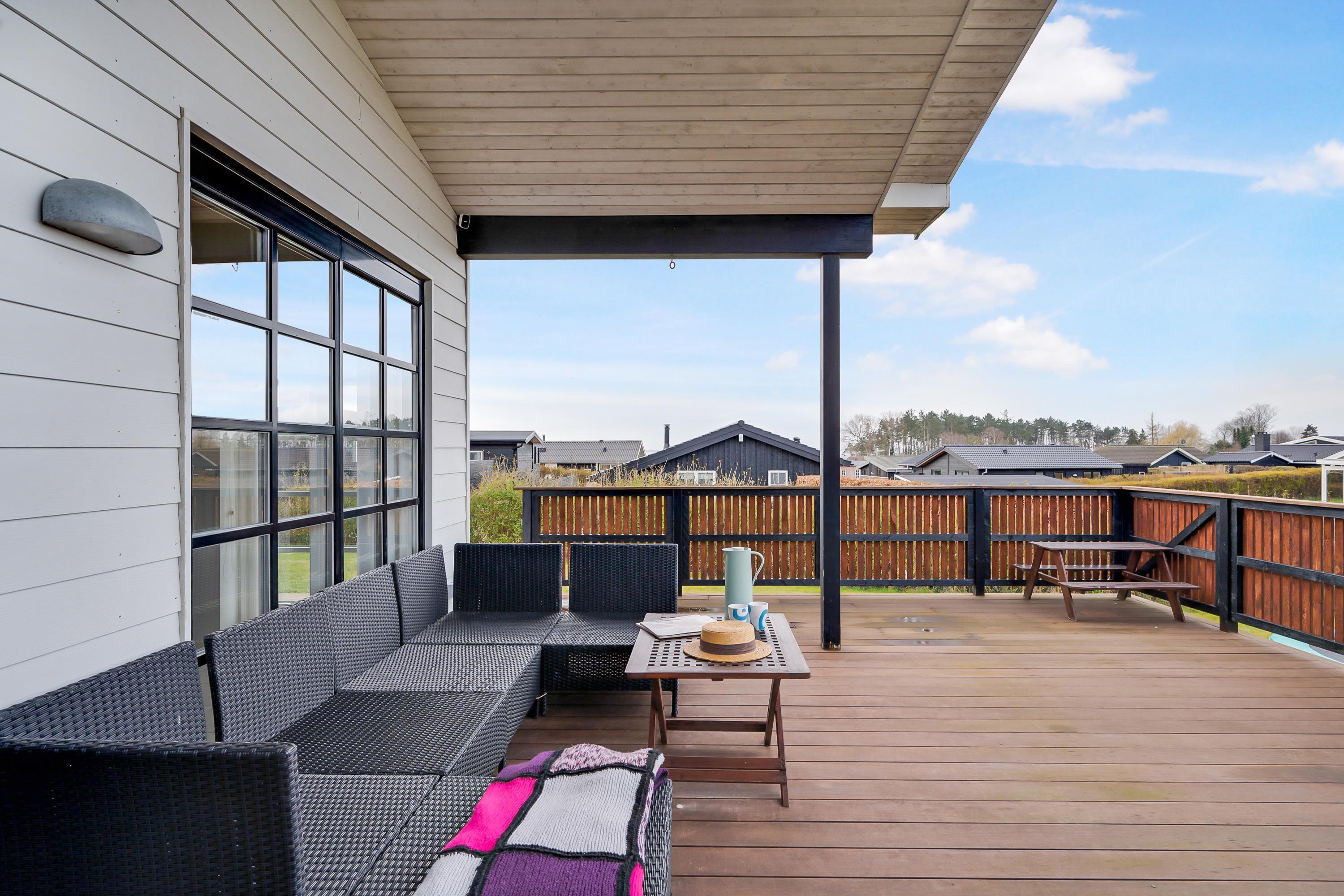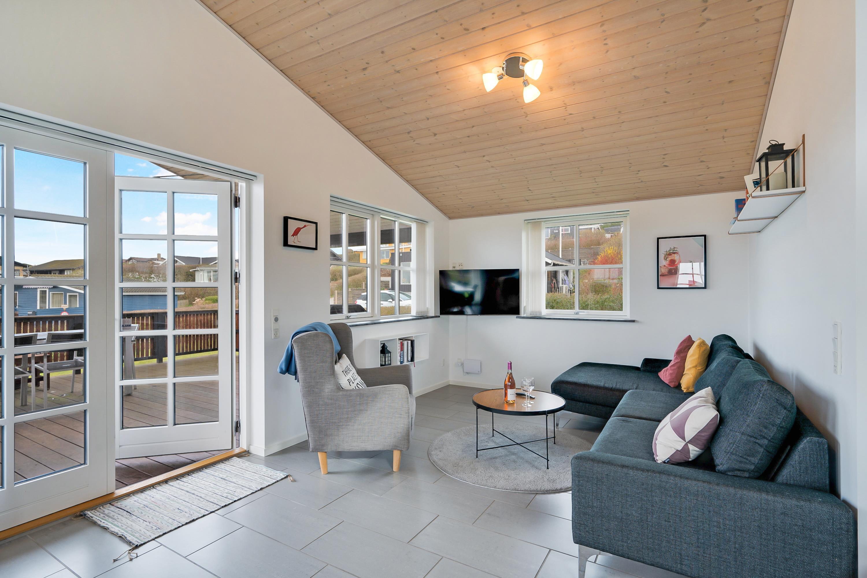 Charmantes Ferienhaus nahe Følle Strand mit Meerblick, großer Terrasse, Garten und Trampolin für entspannte Urlaubstage.