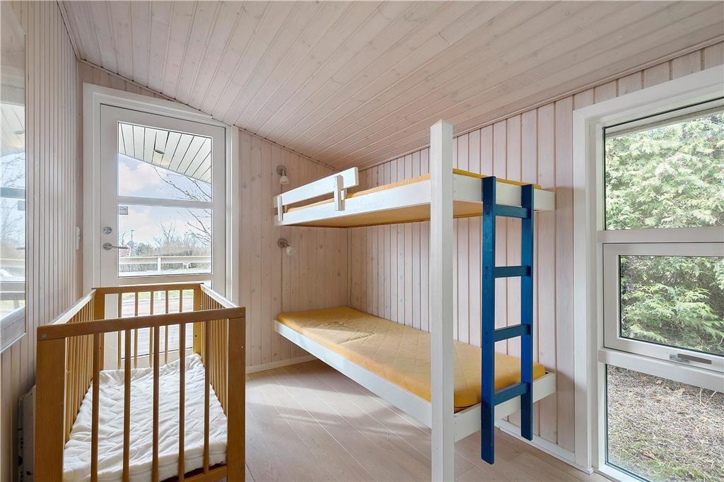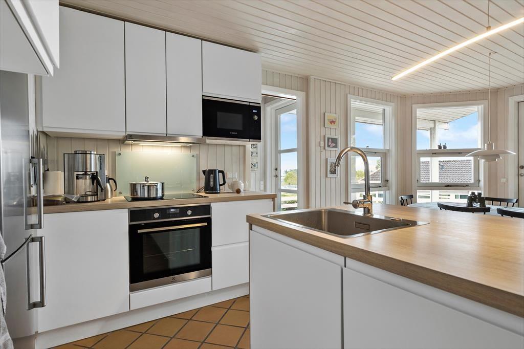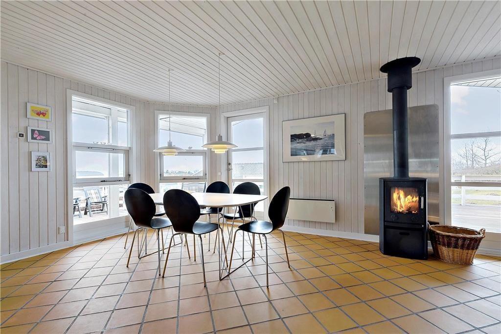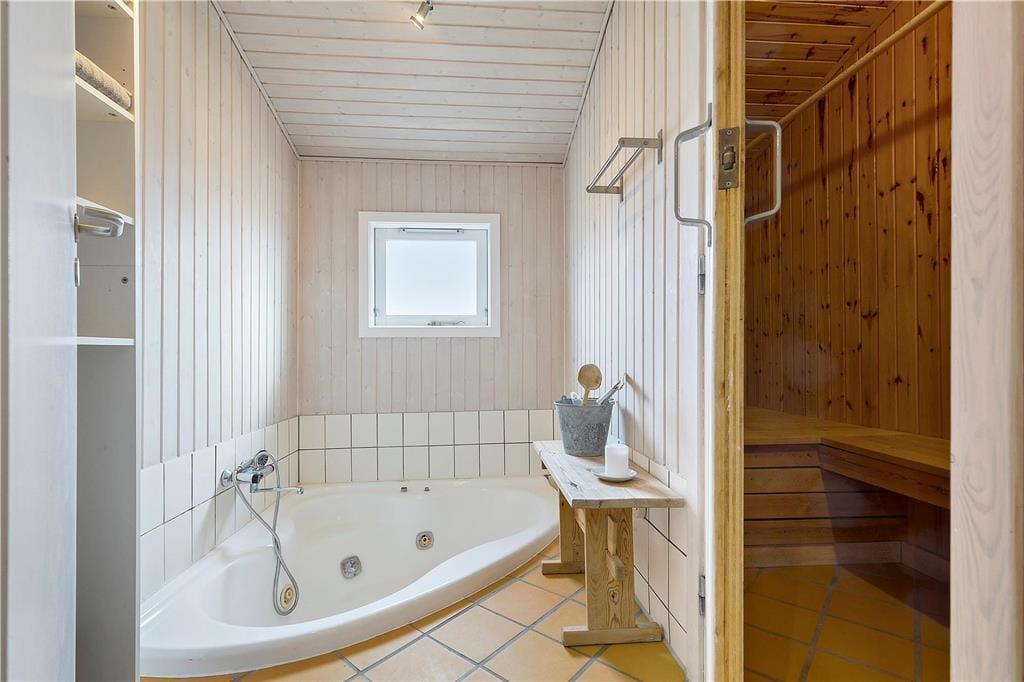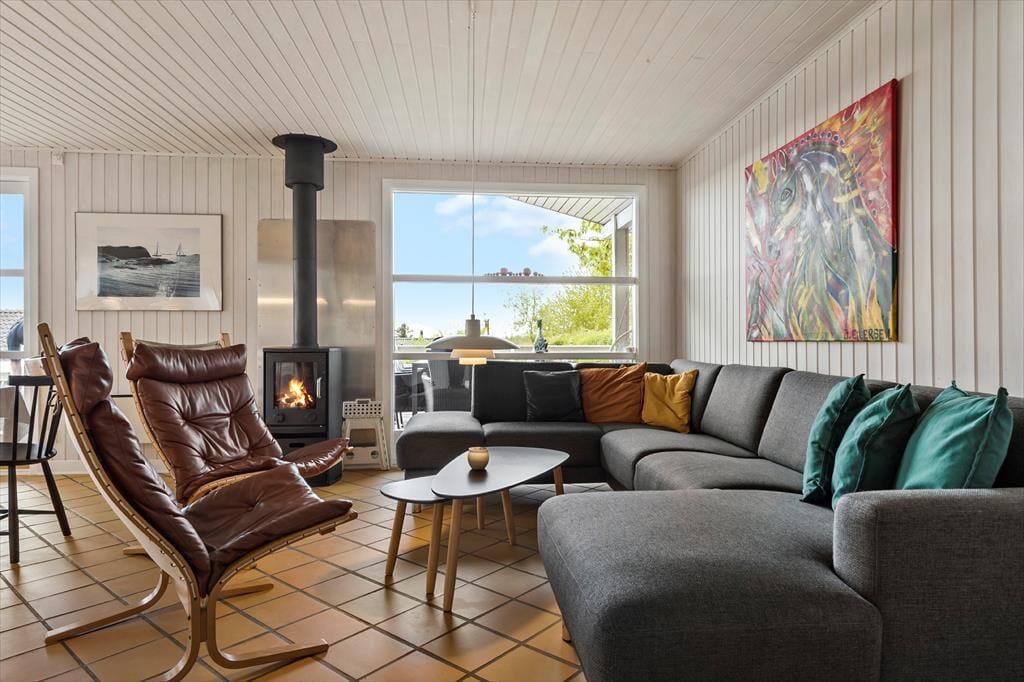 Deine erholsamen Urlaubstage in diesem Ferienhaus werden durch den tollen Ausblick auf die Schlossruine von Kalø und auf die Bucht von Aarhus gekrönt. Im gemütlichen Wohnraum sorgt ein Kaminofen für behagliche Wärme und ein Maximum an klassischer Ferienhausstimmung. In diesem Raum genießt ihr wertvolle gemeinsame Stunden und ruhige, zurückgezogene Momente, die von der schönen Aussicht untermalt sind. Der Kaminofen wird durch eine Wärmepumpe unterstützt. In den Wohnraum fügt sich die offene Küche samt Essplatz ein. Die Küche ist kompakt, aber gut ausgestattet und verfügt unter anderem über einen Geschirrspüler. Beide Badezimmer präsentieren sich ansprechend. Das größere der Bäder glänzt mit einem Whirlpool und einer Sauna und lädt zu traumhaft erholsamen Momenten voller Wellnessflair ein. Drei der vier Schlafräume begrüßen dich mit je einem Doppelbett. Im vierten Raum steht ein Etagenbett bereit. Ein Kinderbett für kleine Urlauber ist ebenfalls vorhanden.