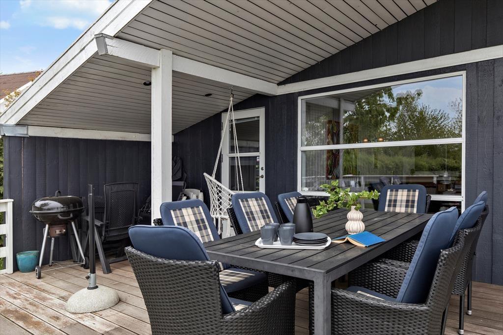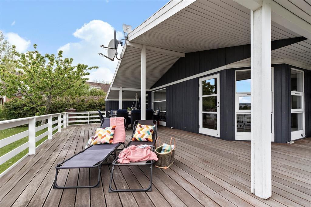 Unter freiem Himmel erwartet dich eine große Terrasse, die nahezu das gesamte Mietobjekt umgibt. Gartenmöbel und ein Grill laden zu gemütlichen Essen an der frischen Luft ein. Auf der 30 m² großen überdachten Terrasse genießt du Aussicht auf die Bucht - völlig unabhängig vom Wetter. Das erhöht gelegene Grundstück eröffnet reizvolle Ausblicke über die traumhafte Landschaft und Natur ringsum - perfekt für einen frischen Kaffee in der aufgehenden Sonne und für ein Abendessen vor dem schönen Sonnenuntergang.