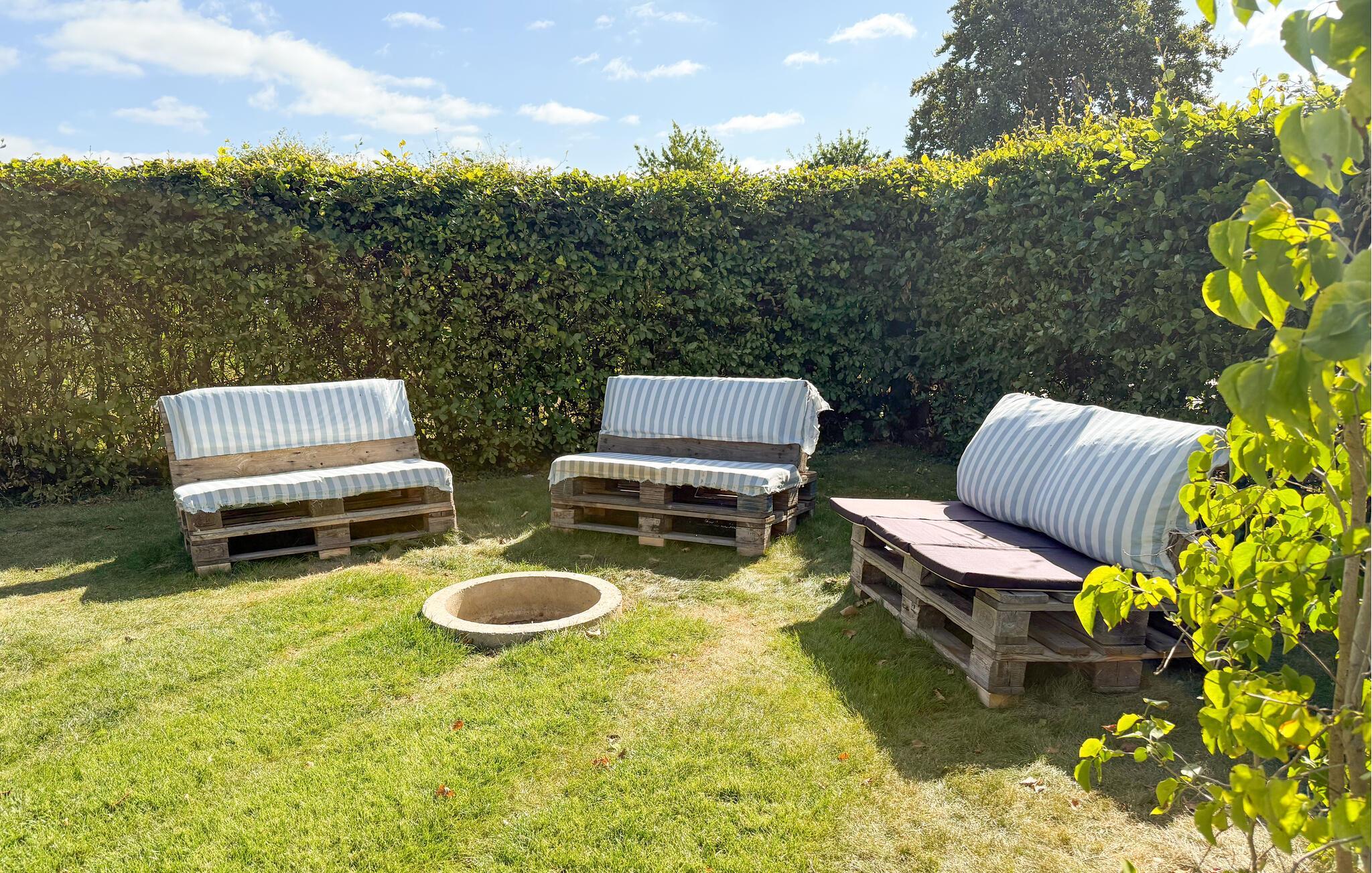 Im großen Garten finden Sie verschiedene Sitzgelegenheiten, passend für jede Gelegenheit. Die sonnige Terrasse eignet sich hervorragend für ein ausgiebiges Frühstück, während die Holzbänke dazu einladen, es sich am Abend an der Feuerstelle gemütlich zu machen. Für eine Erfrischung zwischendurch springen Sie in das Finnische Holzbad und entspannen anschließend auf einer Sonnenliege.