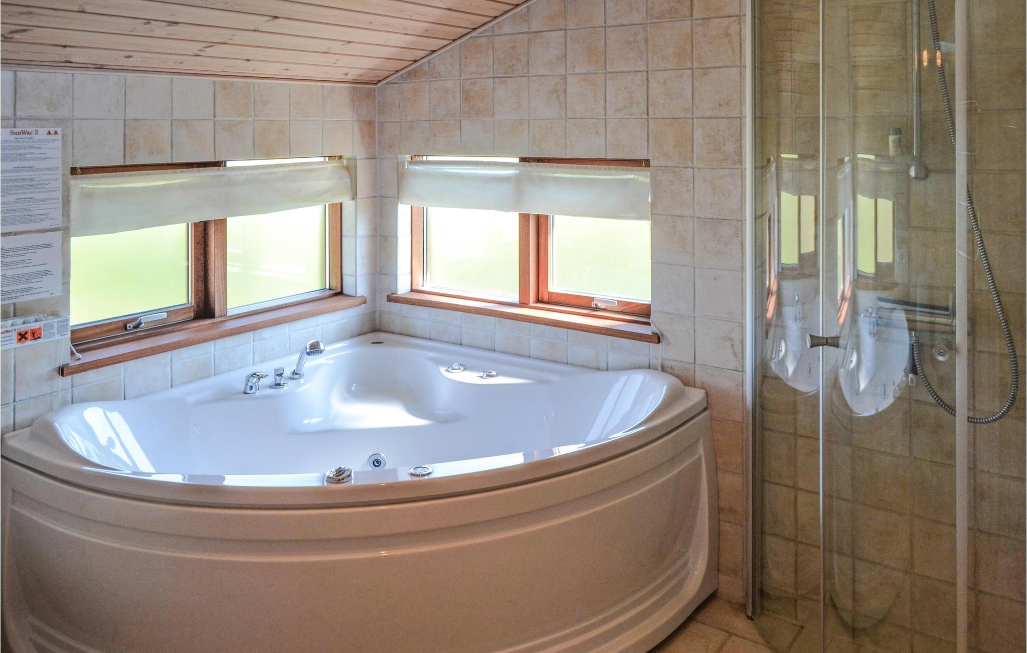 Modernes Ferienhaus nahe Følle Strand mit Terrasse, Sauna und Whirlpool für entspannte Tage in der Natur.