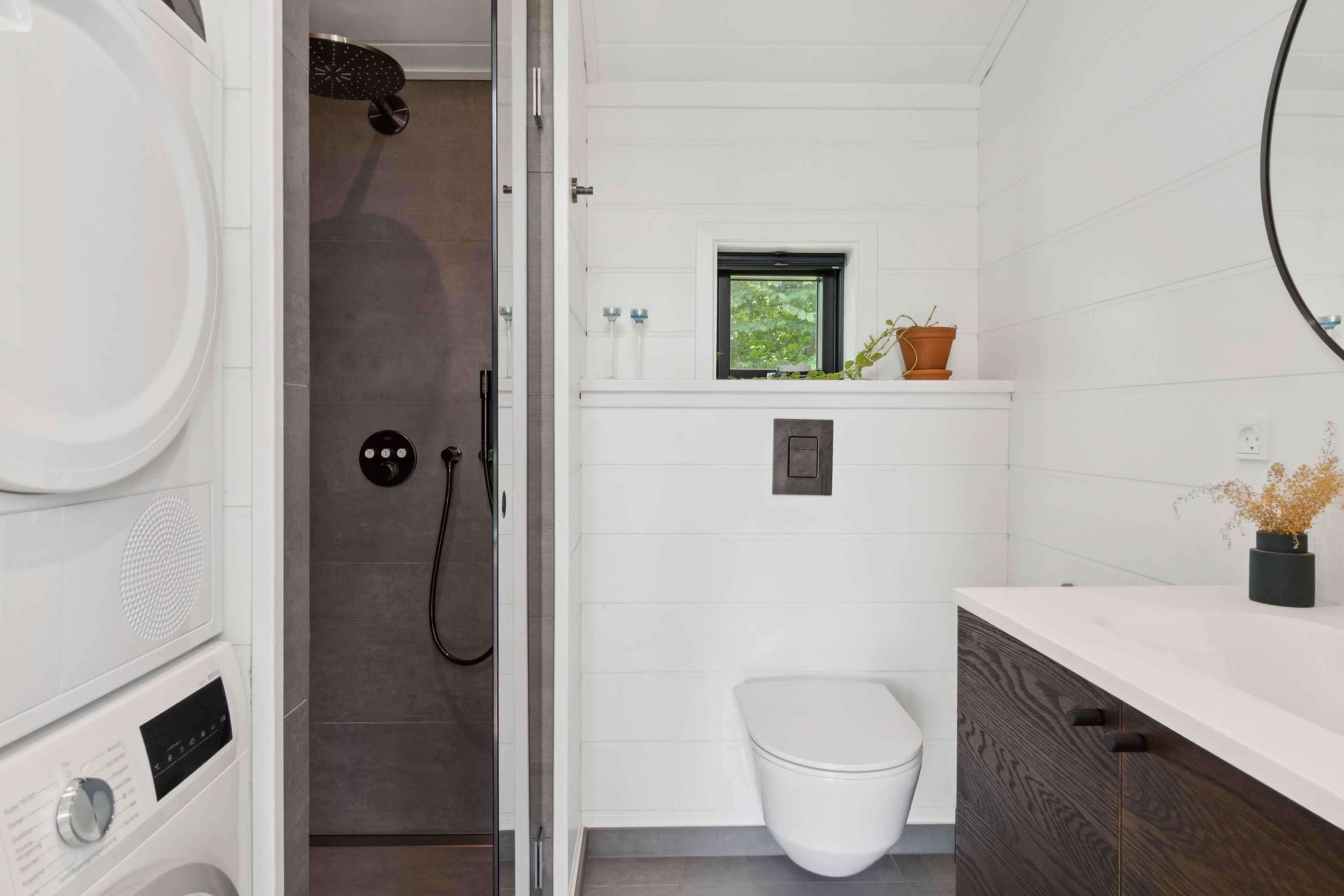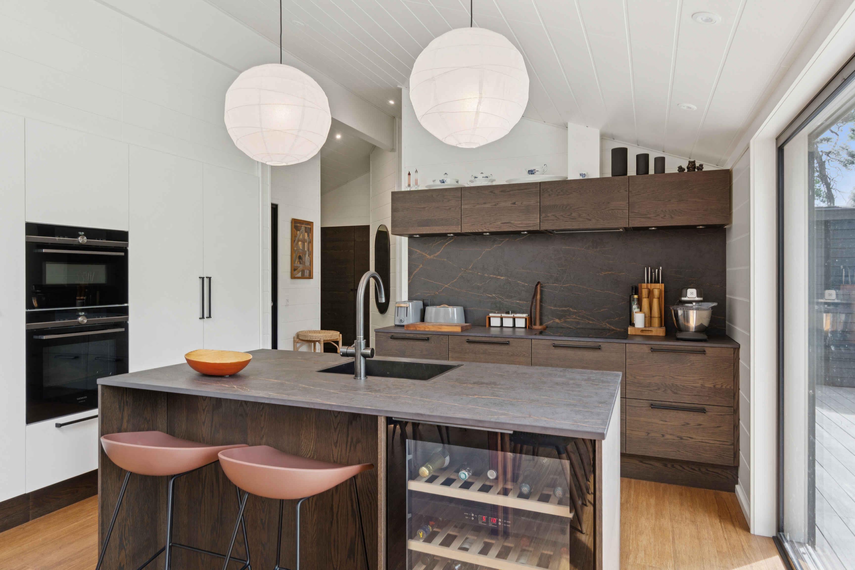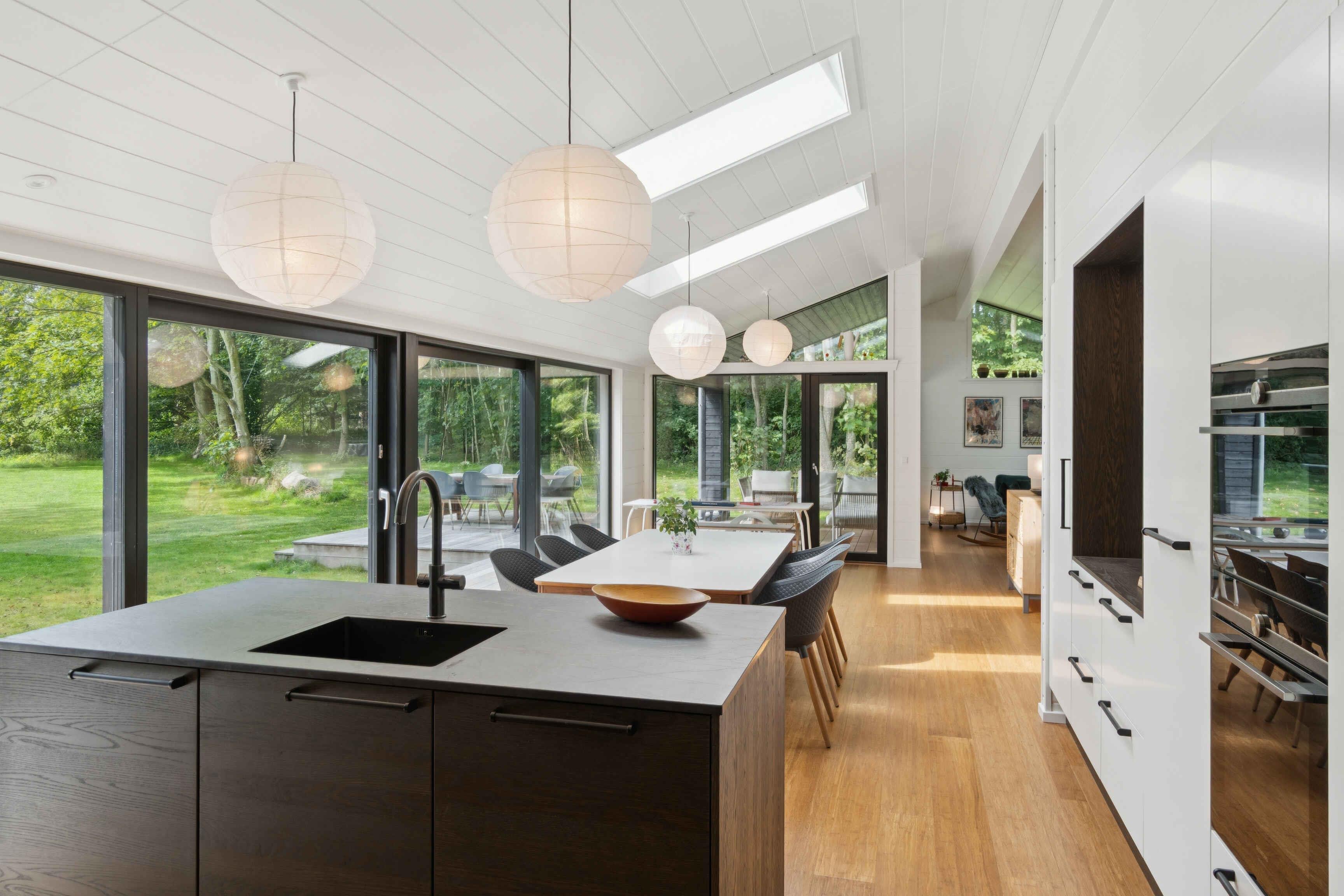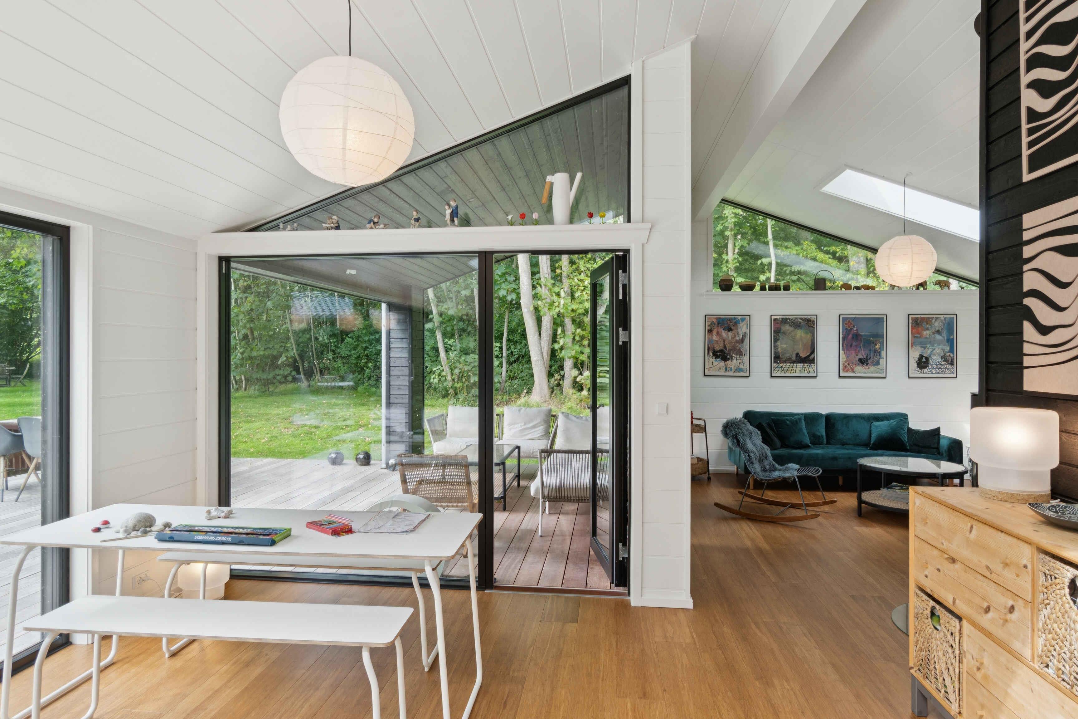 Helles Ferienhaus mit 3 Schlafzimmern im Haupthaus und 1 im Anbau. Badezuber, Wärmepumpe, Kaminofen, Internet, Sauna, 2 Bäder (eins mit Wanne). Großes, uneinsehbares Grundstück im exklusiven Gebiet mit Rasen zum Spielen.