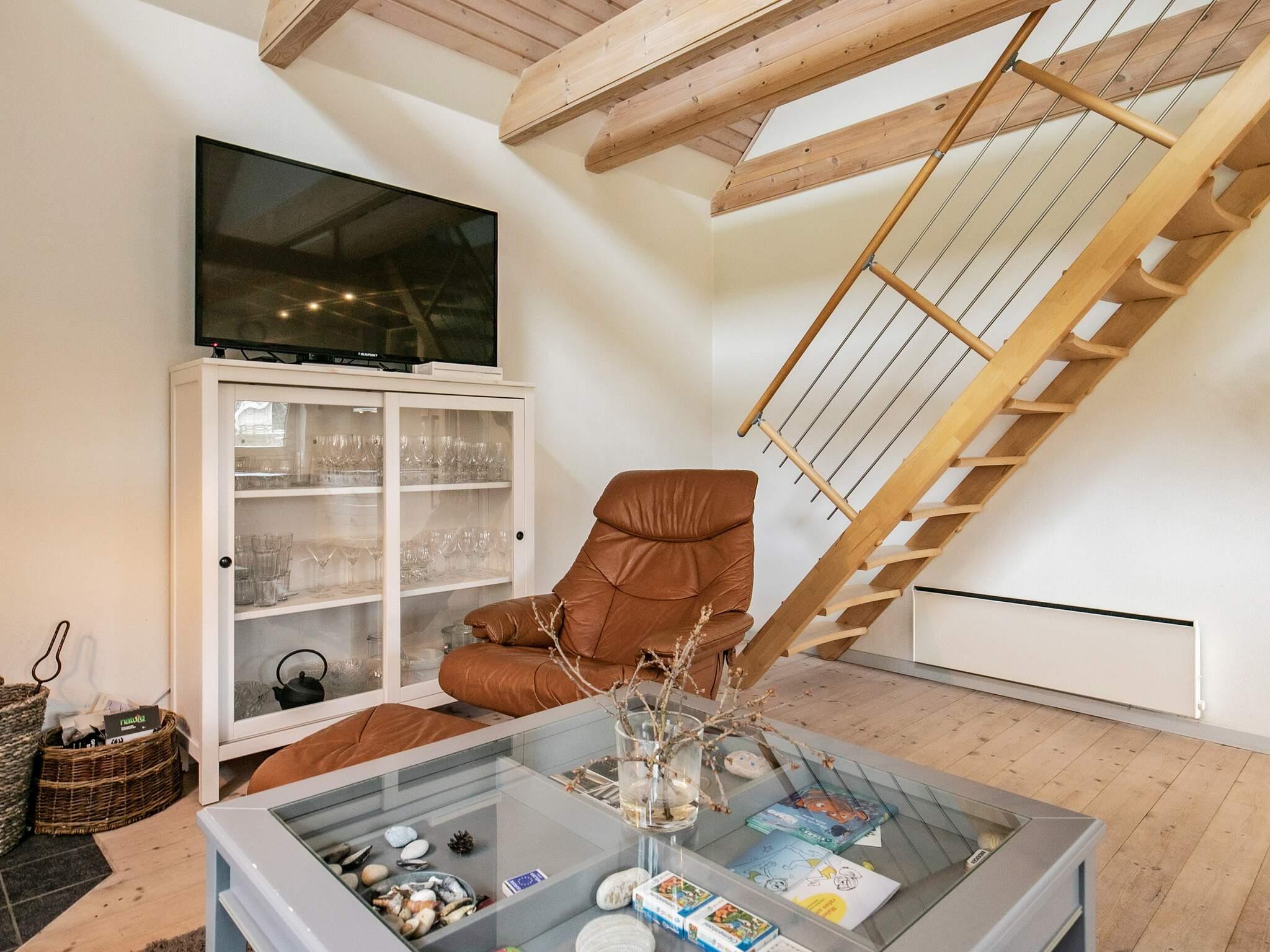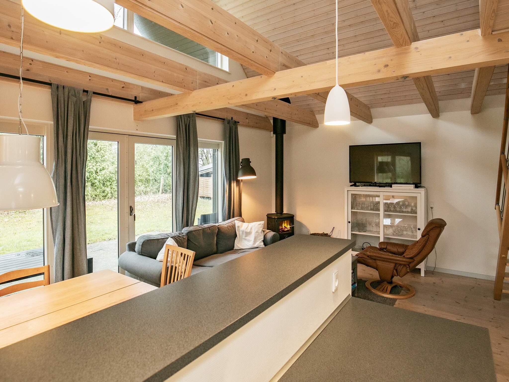 Der Wohnbereich hat eine offene Zimmerdecke bis zum First und wirkt so besonders hell und geräumig. Die Küche ist offen integriert, ideal für das Familienleben. Außerdem stehen zwei Schlafzimmer mit viel Staufläche und ein geräumiges Badezimmer bereit. Zur Küchenausstattung gehören u.a. Geschirrspüler, Ceranfeld und ein Kühlschrank mit 60 l Gefrierfach. Apple-TV, WLAN und Chromecast zum Streamen eigener Anbieter im Haus. Zugang vom Wohnbereich zur teils überdachten Terrasse mit Gartenmöbeln und Grill. Geräumiges Badezimmer mit Fußbodenheizung und Dusche.