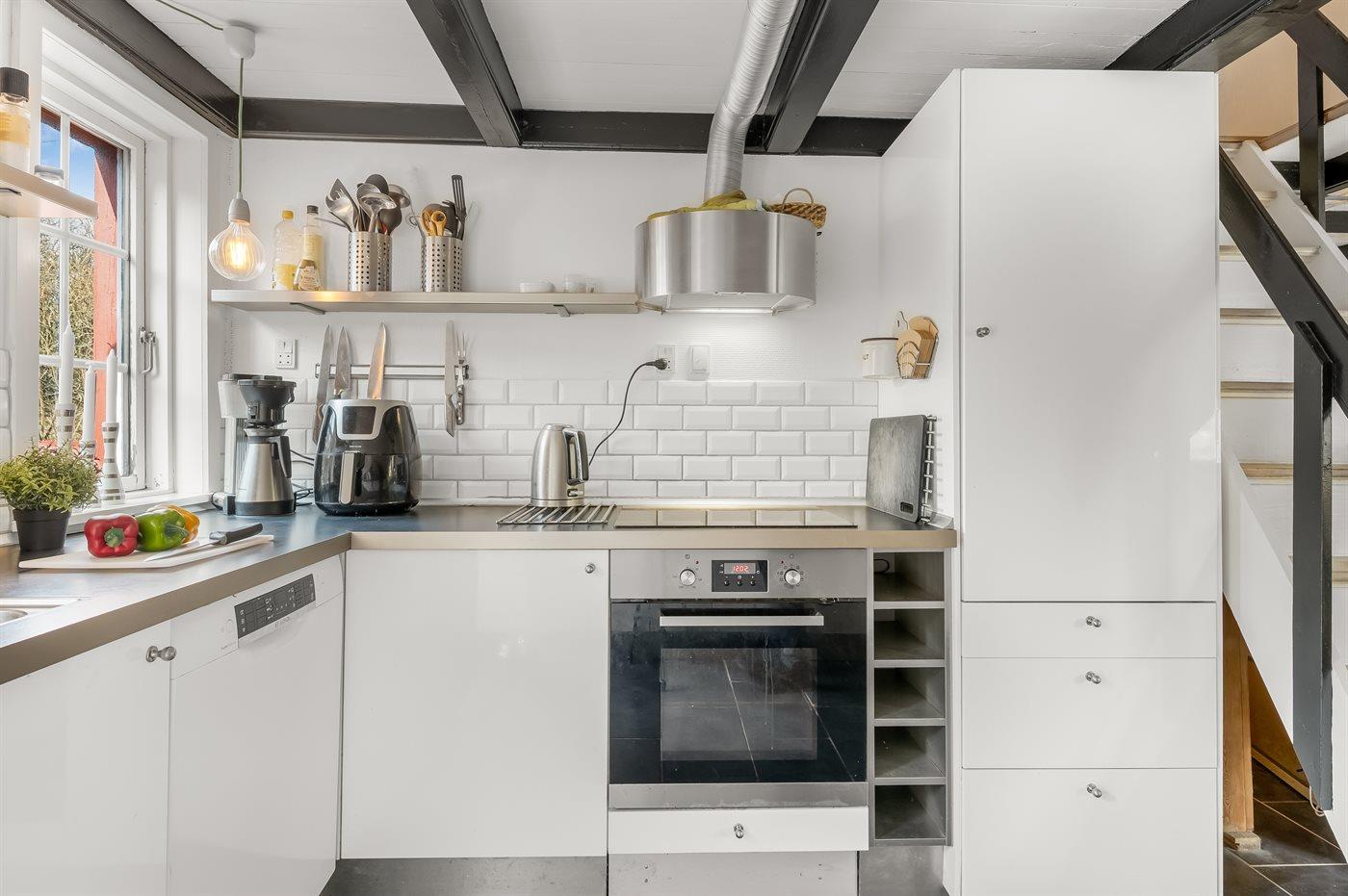 Die Küche ist mit Kühlschrank ausgestattet. Außerdem gibt es 4 Keramik-Kochfelder, Umluftofen, Airfryer sowie Geschirrspüler.