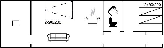 Es gibt einen Schlafraum. 2 Schlafplätze in einem Doppelbett. 2 Schlafplätze auf einer Doppelschlafcouch. 2 von diesen Schlafplätzen befinden sich im Wohnzimmer.