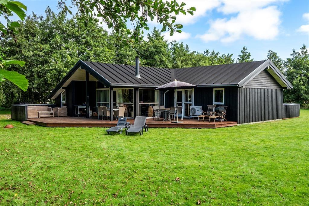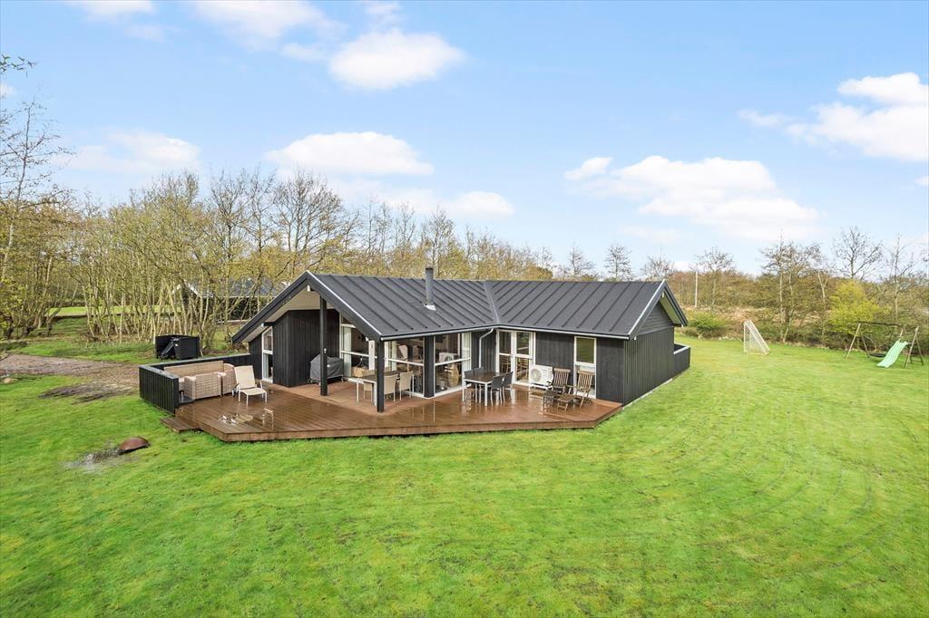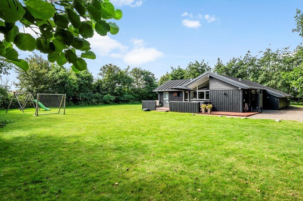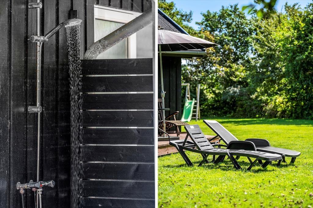 Klingt eine Morgendusche unter freiem Himmel verlockend? Das ist genau das, was du bekommst, wenn du ein Handtuch über die Schulter wirfst und zur Außendusche im Terrassenbereich gehst. Alternativ kannst du dir einfach eine Tasse Kaffee zubereiten und sie draußen genießen, um die Ruhe und die Sonne zu genießen, während das Haus und die Umgebung erwachen. Rund um das Ferienhaus gibt es mehrere schöne Sitzplätze, einschließlich überdachter Bereiche, wenn du tagsüber Schatten möchtest oder abends vor dem Tau geschützt sein möchtest. Der Rasen ist groß, sodass hier viel Platz zum Ballspielen und Toben ist, und die kleinsten Kinder haben sogar einen Spielplatz mit Rutsche und Schaukel.