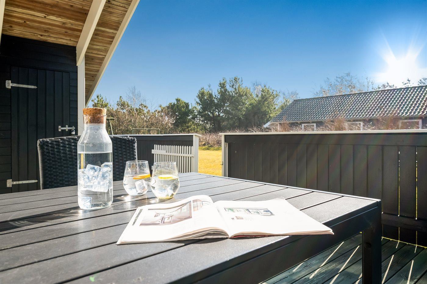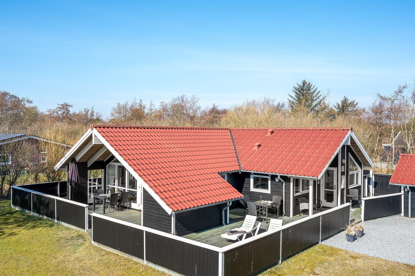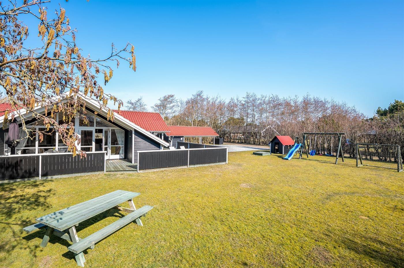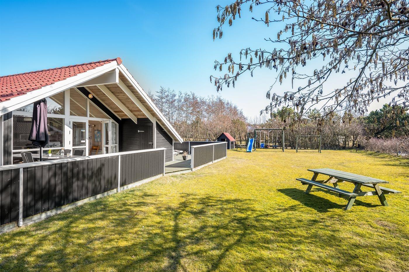 Das Ferienhaus liegt auf einem 960 m² großen Grundstück. Bis zum Meer sind es 1200 m. Der nächste Supermarkt ist etwa 200 m entfernt. Ein Golfplatz befindet sich in einer Entfernung von 1000 m. Die Natur von Fanø beginnt direkt vor der Tür – Rehe, Kaninchen und Fasane kommen oft auf das Grundstück. Zur Unterkunft gehört eine 100 m² große, geschlossene Terrasse, davon sind 20 m² überdacht. Beim Spielhaus gibt es Schaukeln, einen Sandkasten, eine Rutsche und ein Fußballtor. Es stehen Spiele für drinnen und draußen bereit. In den Sommermonaten gibt es eine uneinsehbare Außendusche mit warmem und kaltem Wasser. Ein Grill ist vorhanden. Außerdem ist ein Anschluss zum Laden eines Elektroautos (Typ-2-Stecker) installiert. Eine Carport und Parkplätze stehen zur Verfügung. Auf Fanø besteht die Möglichkeit, Fahrräder zu mieten.
