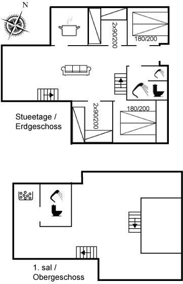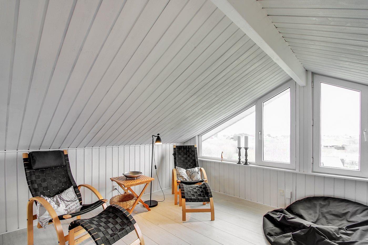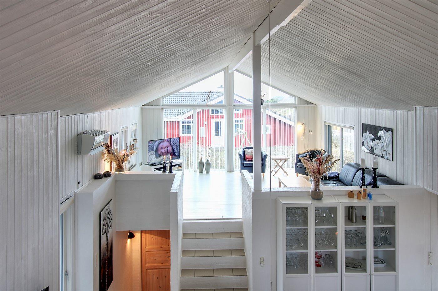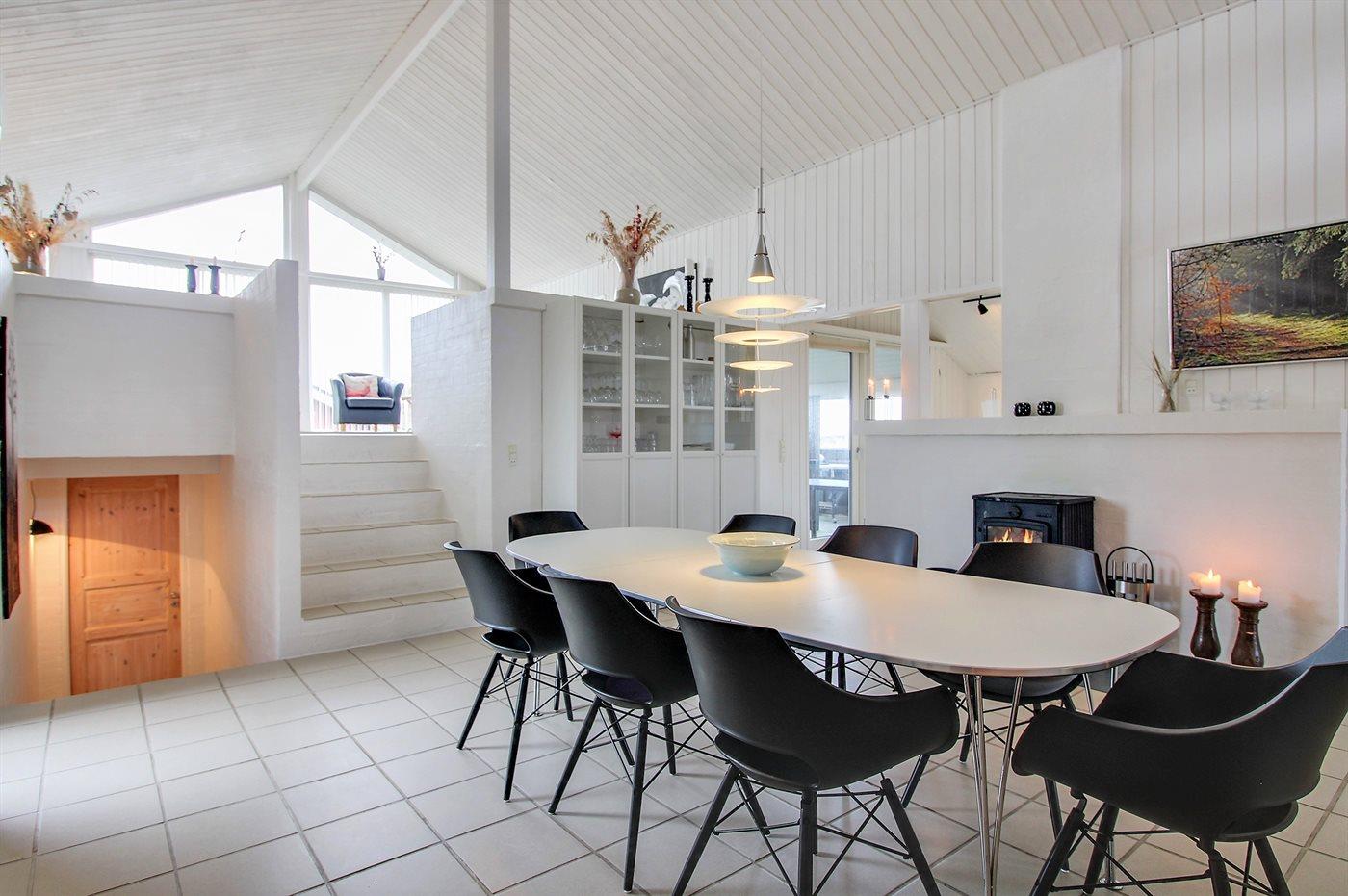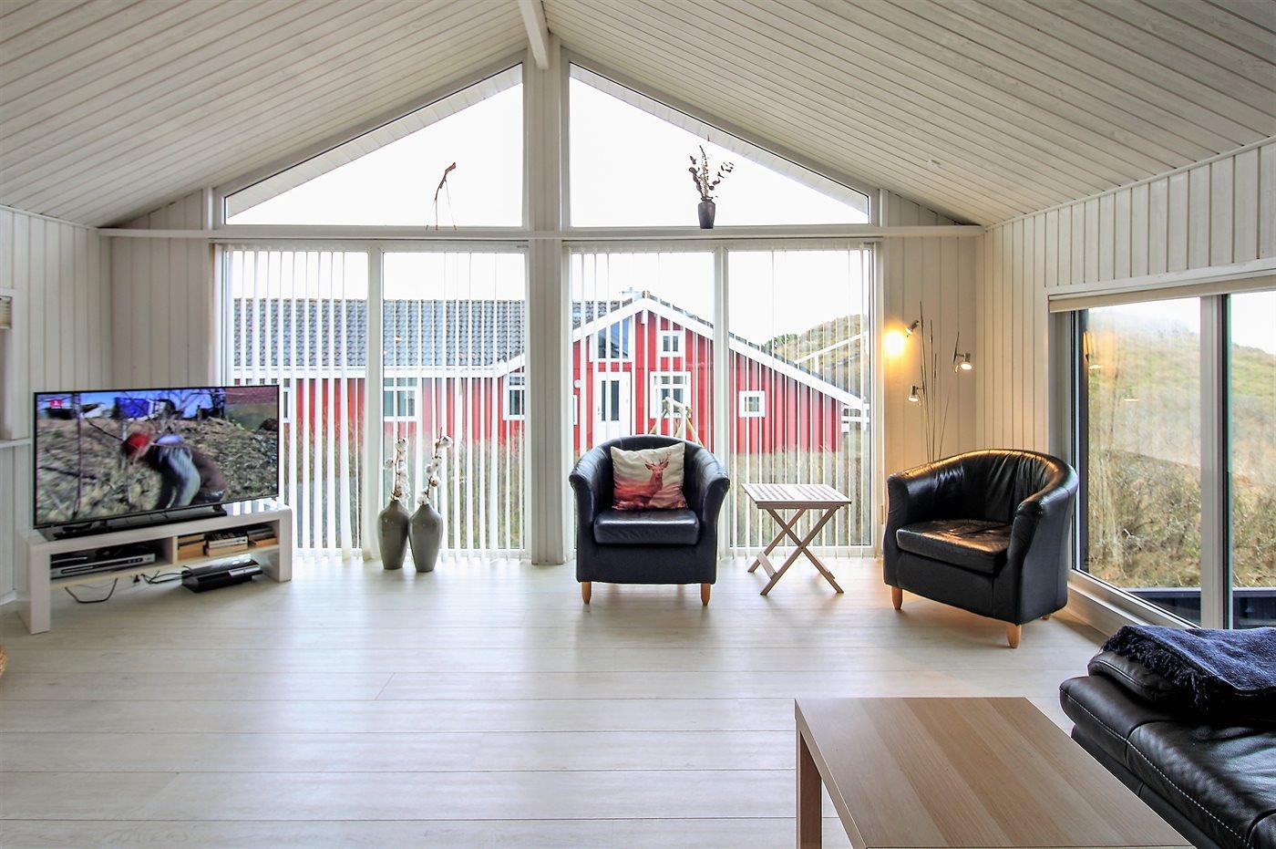 Ein architektonisch ansprechendes Haus mit mehreren Stockwerken und interessanten Details. Auf erhöhter Ebene befinden sich zwei Wohnräume mit Ausblick auf die Nordsee und das Festland. Die Küche ist unter anderem mit einer Spülmaschine, einer Mikrowelle und einem Kühlschrank mit Gefrierfach ausgestattet.
