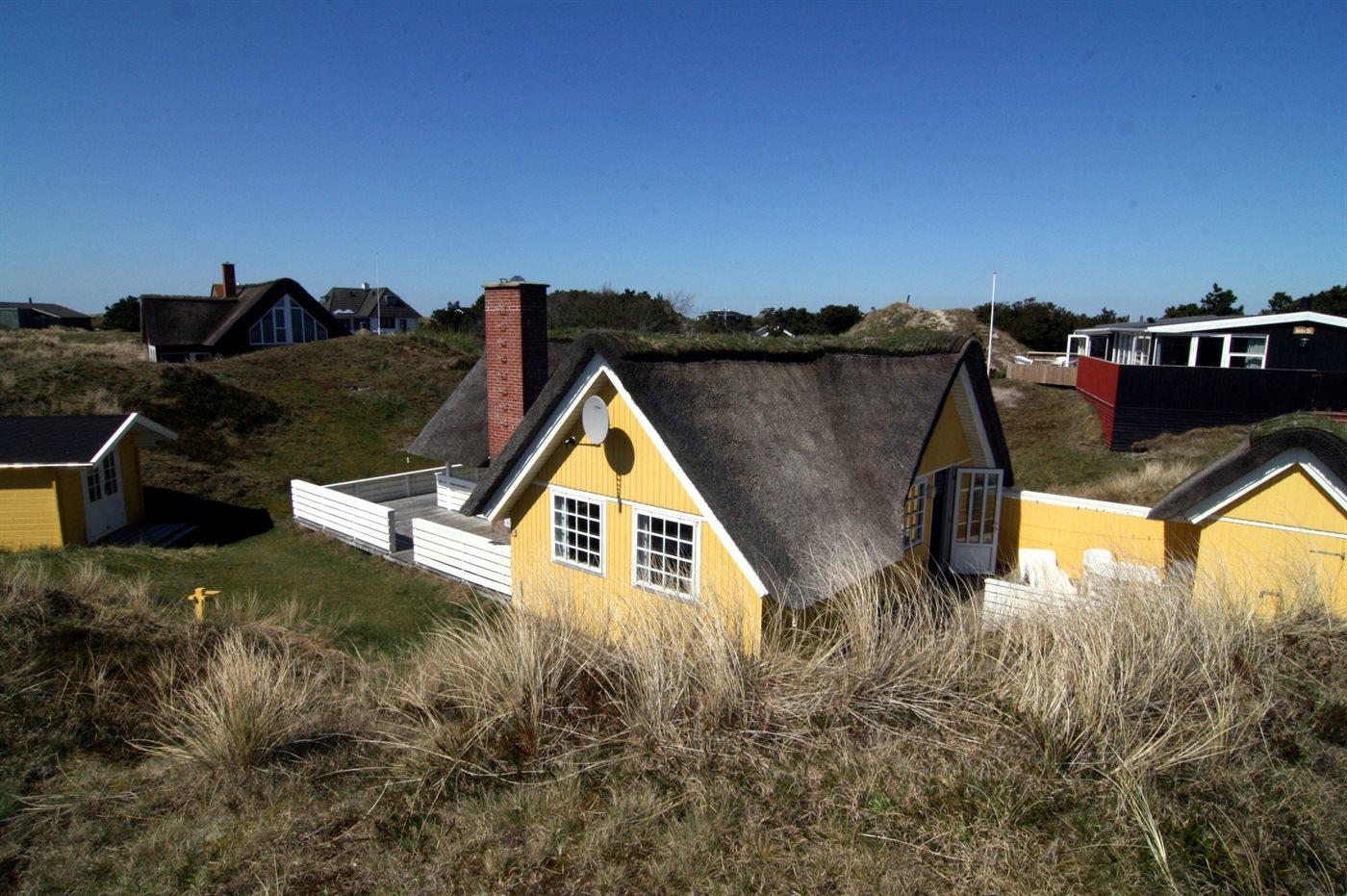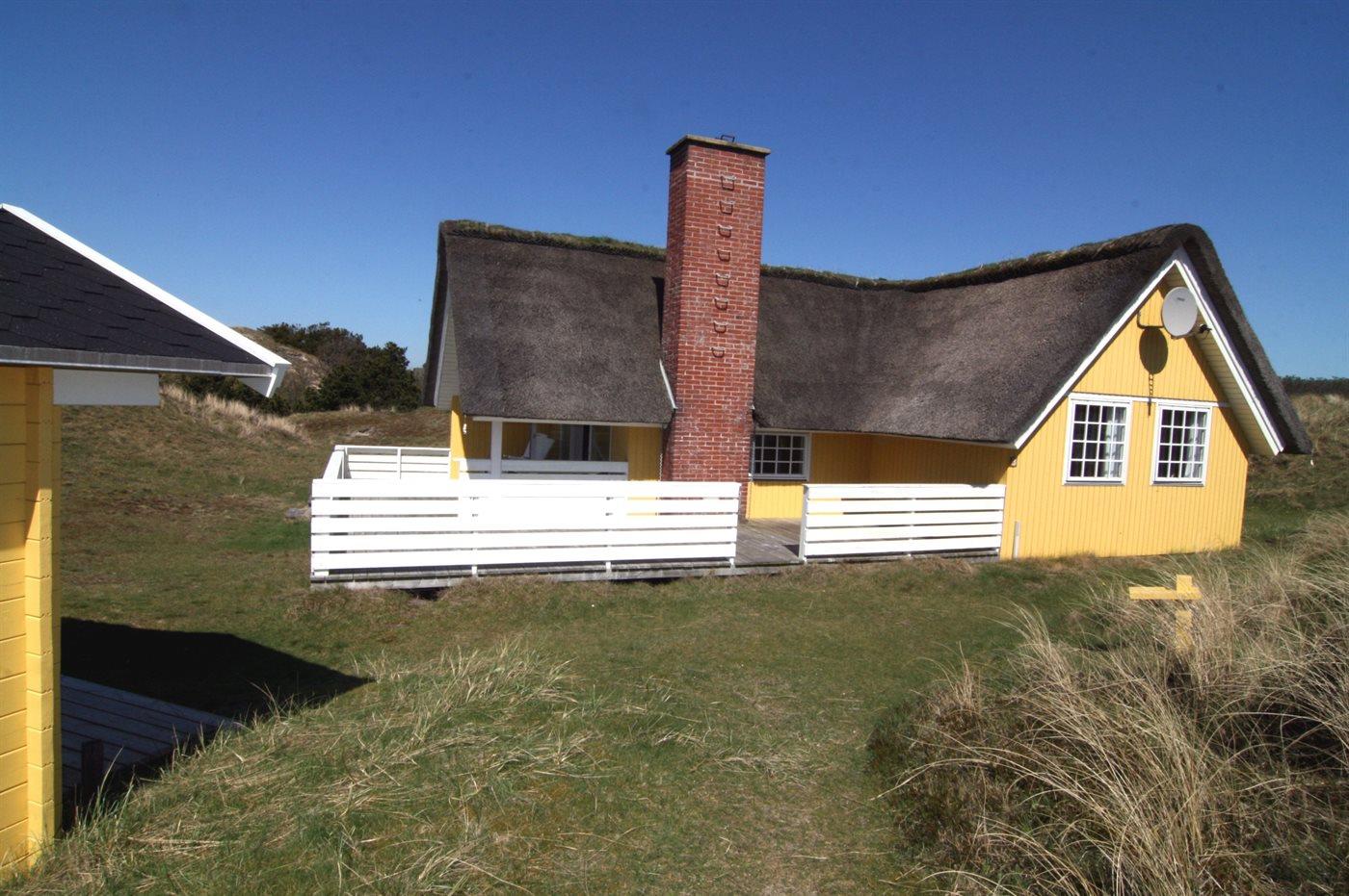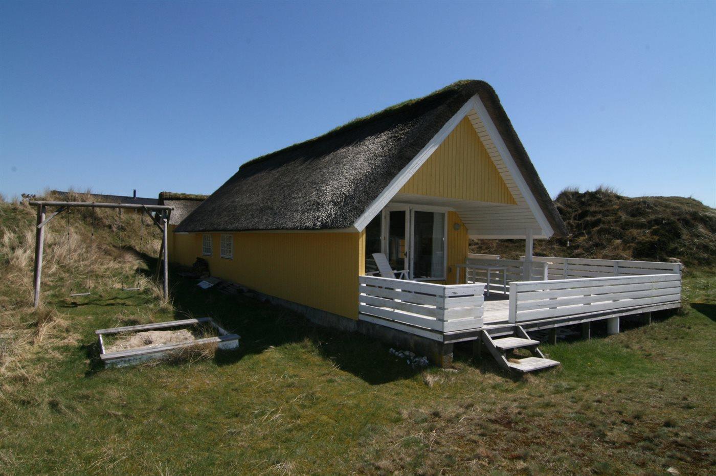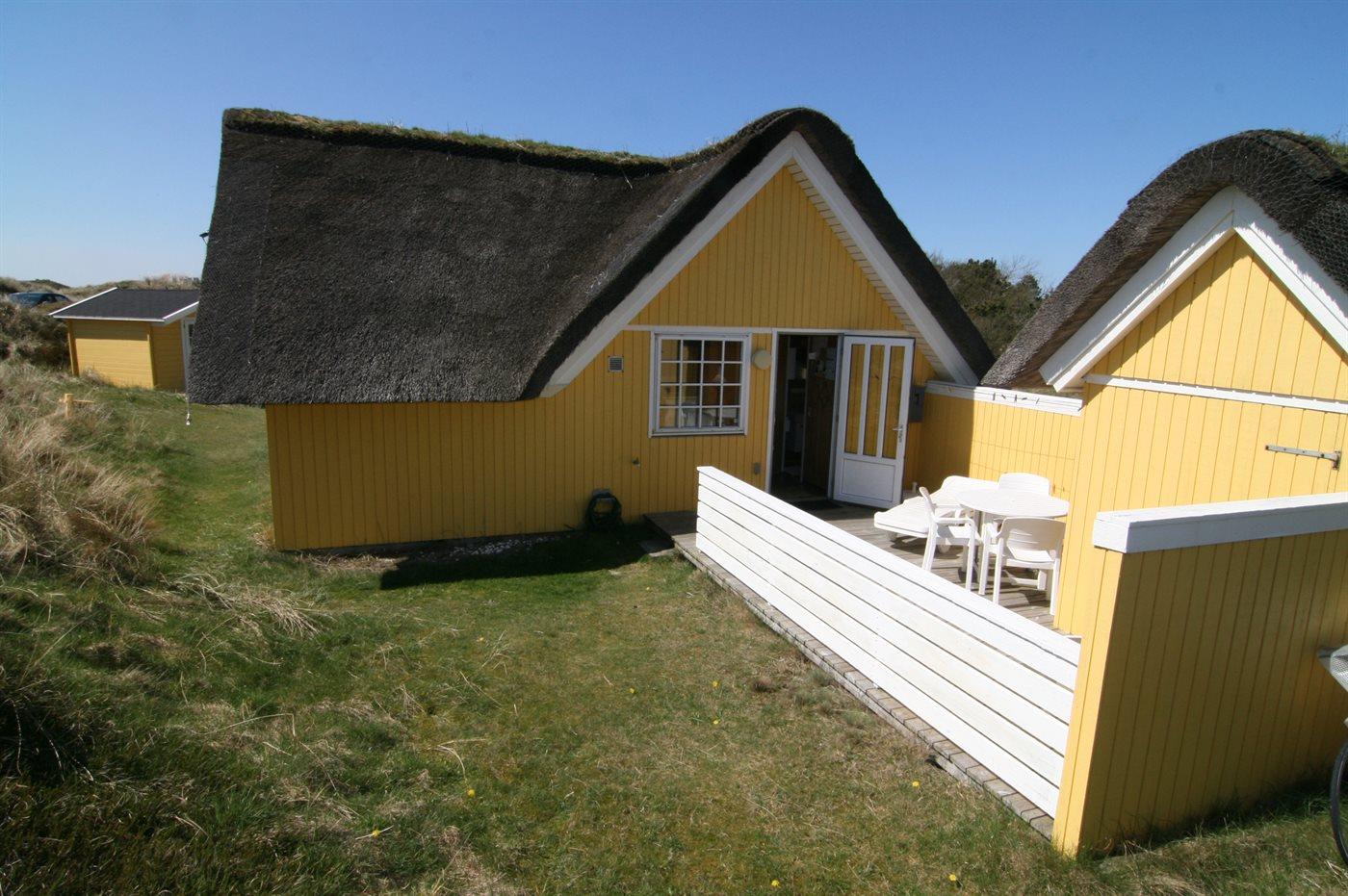 Ein schönes, strohgedecktes Ferienhaus in ruhiger Lage an einer Düne, von der man Meeresblick hat. Das Haus ist gemütlich eingerichtet und hat wirklich gute Terrassenverhältnisse. 3 Schlafräume und Platz für 5 Personen. Holzböden im Wohnzimmer und in den Schlafzimmern. Das Haus liegt windgeschütz auf einem tollem Grund in einem schönen Gebiet nur 200 m vom Strand entfernt. Ein "echtes" Sommerhaus mit Seele und Charme. Das Gästehaus ist privat.