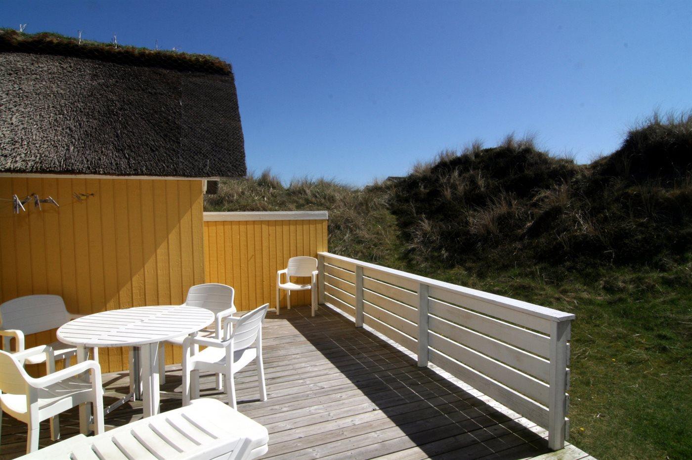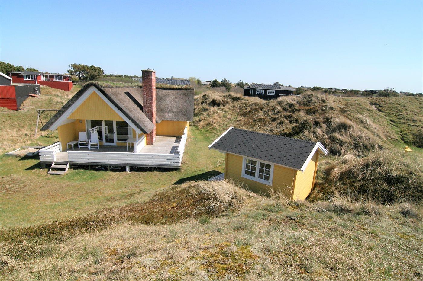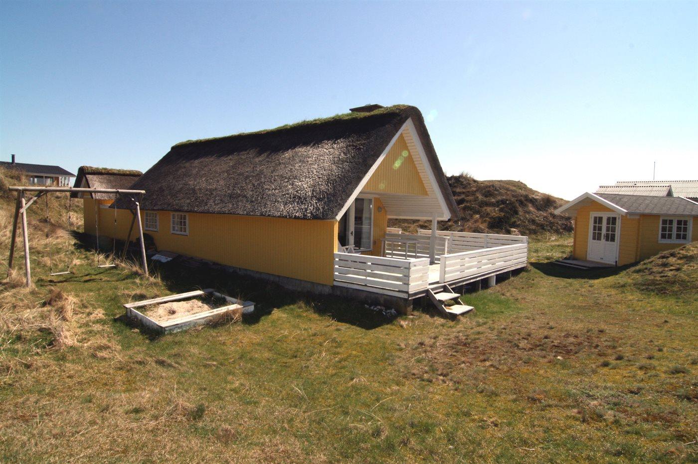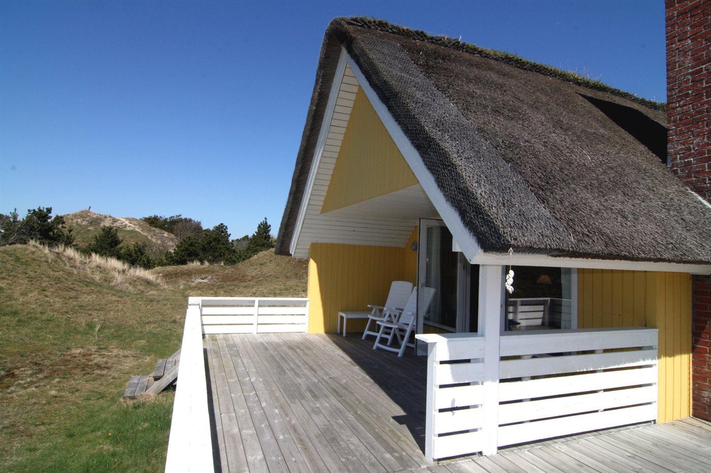 Ein schönes, strohgedecktes Ferienhaus in ruhiger Lage an einer Düne, von der man Meeresblick hat. Das Haus ist gemütlich eingerichtet und hat wirklich gute Terrassenverhältnisse. 3 Schlafräume und Platz für 5 Personen. Holzböden im Wohnzimmer und in den Schlafzimmern. Das Haus liegt windgeschütz auf einem tollem Grund in einem schönen Gebiet nur 200 m vom Strand entfernt. Ein "echtes" Sommerhaus mit Seele und Charme. Das Gästehaus ist privat.