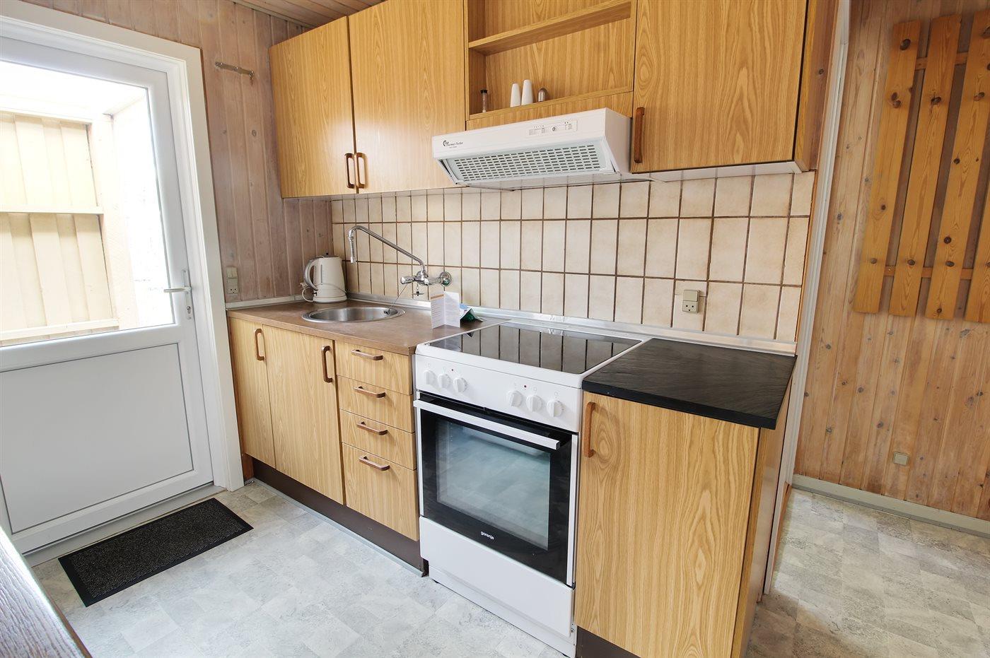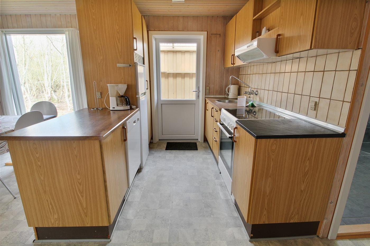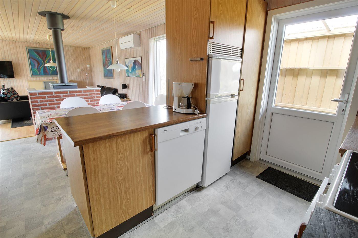 Die Küche ist mit Kühlschrank ausgestattet. Außerdem gibt es 4 elektrische Kochplatten, Backofen sowie Geschirrspüler.