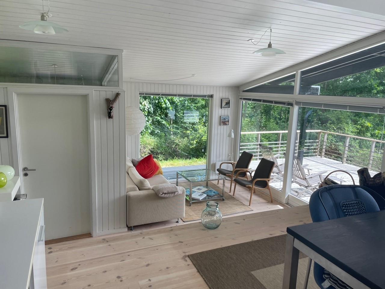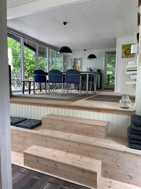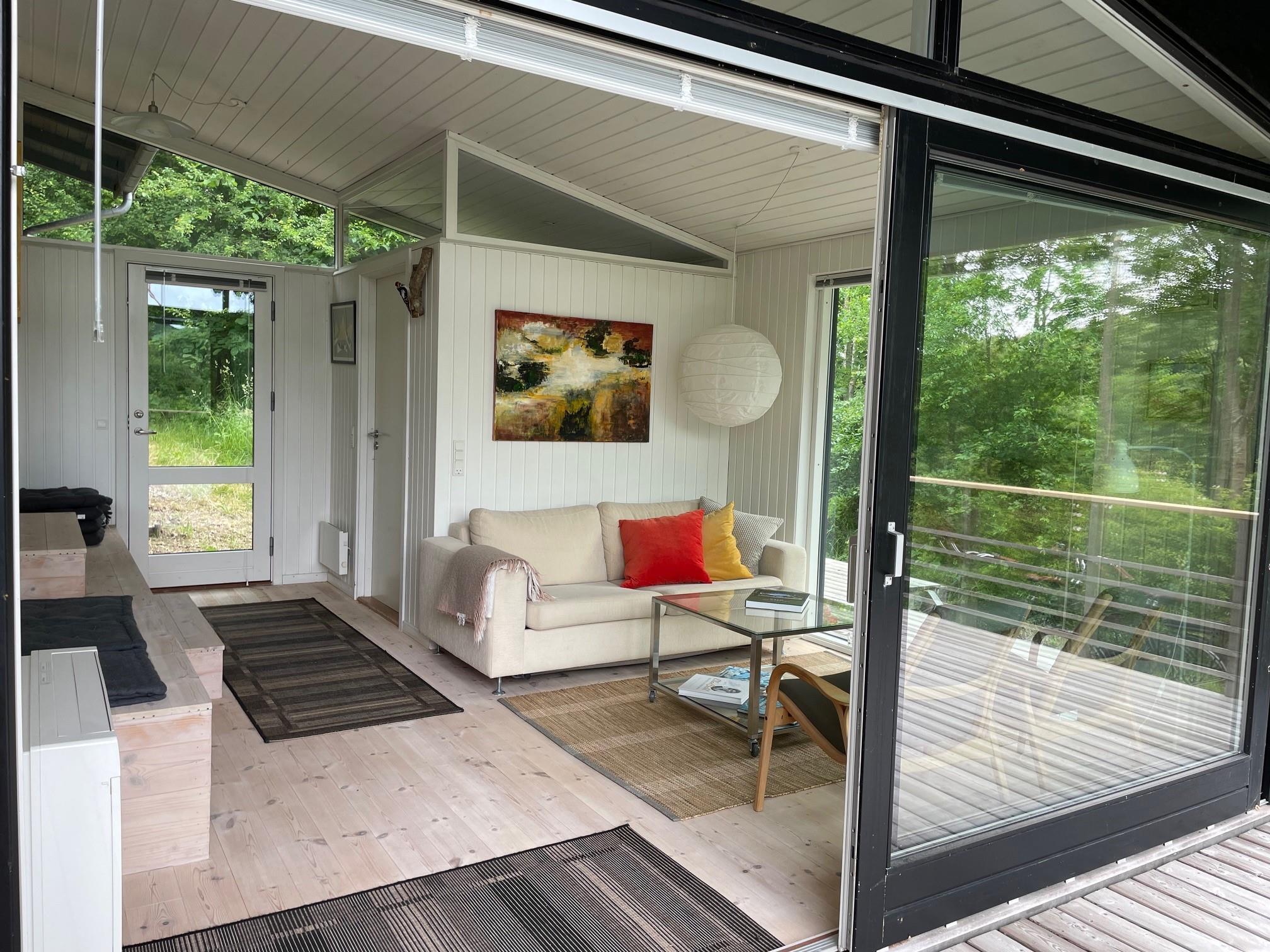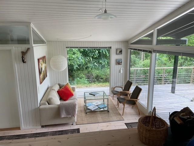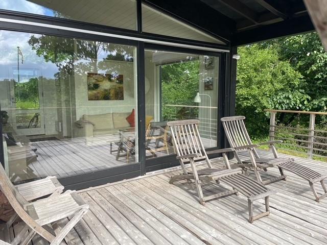 Auf einem hoch gelegenen Naturgrundstück mit herrlicher Aussicht auf das schöne Wald- und Naturgebiet bei Femmøller findet man dieses ältere, aber laufend renovierte Ferienhaus. Schöne, teilweise überdachte Holzterrasse in versetzten Ebenen mit Gartenmöbeln, Liegestühlen, Sonnenschirm und Grill.