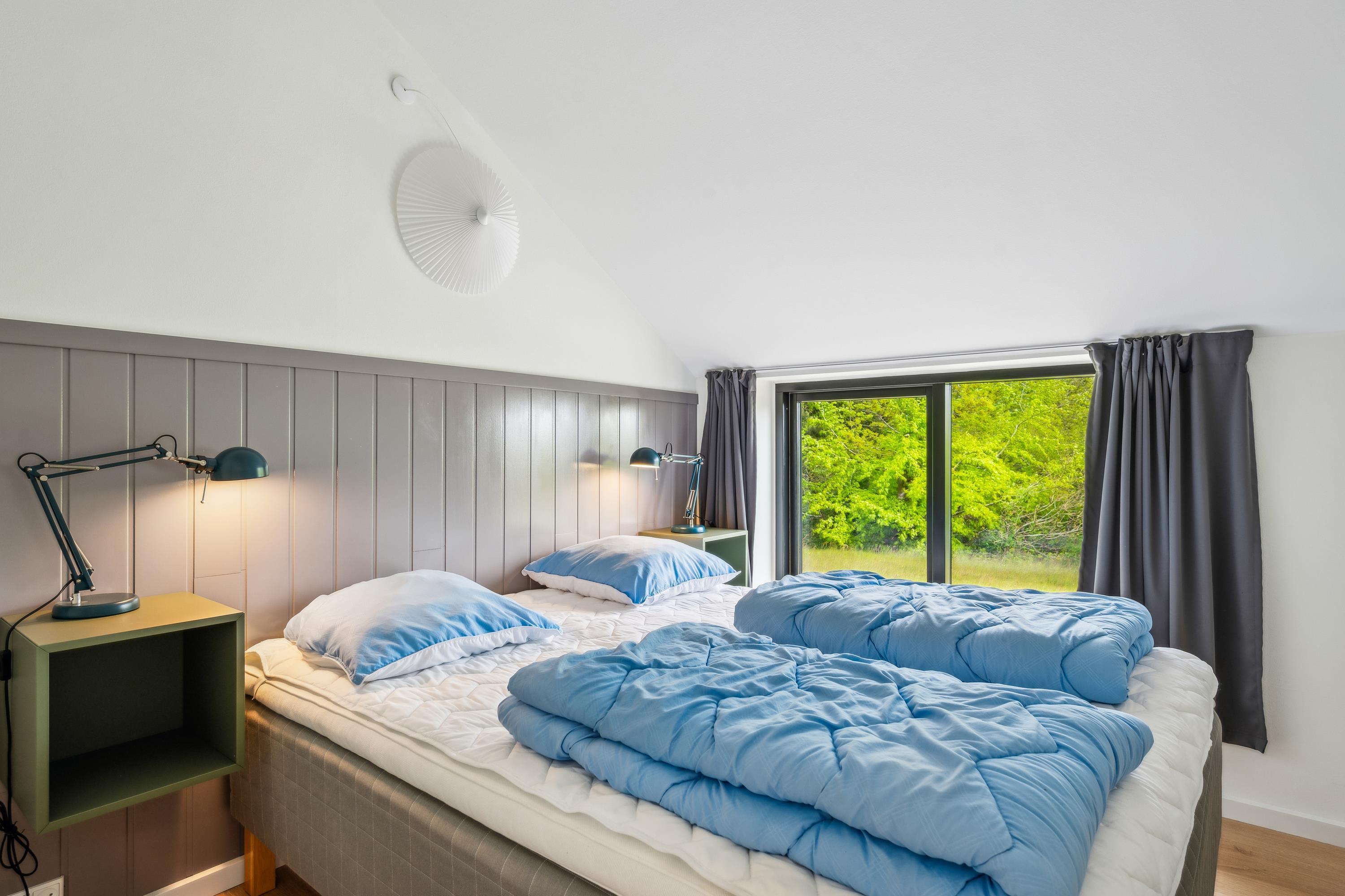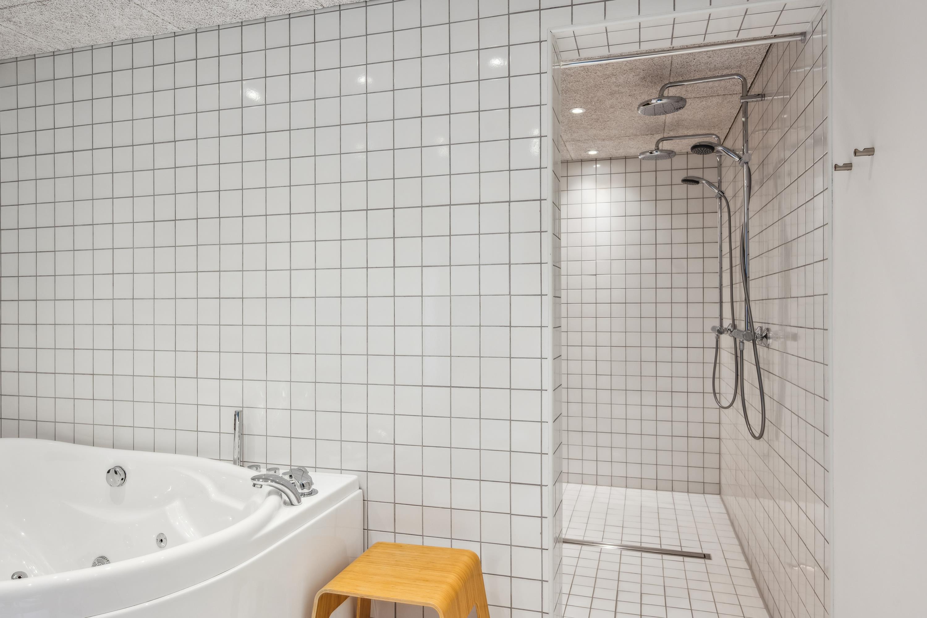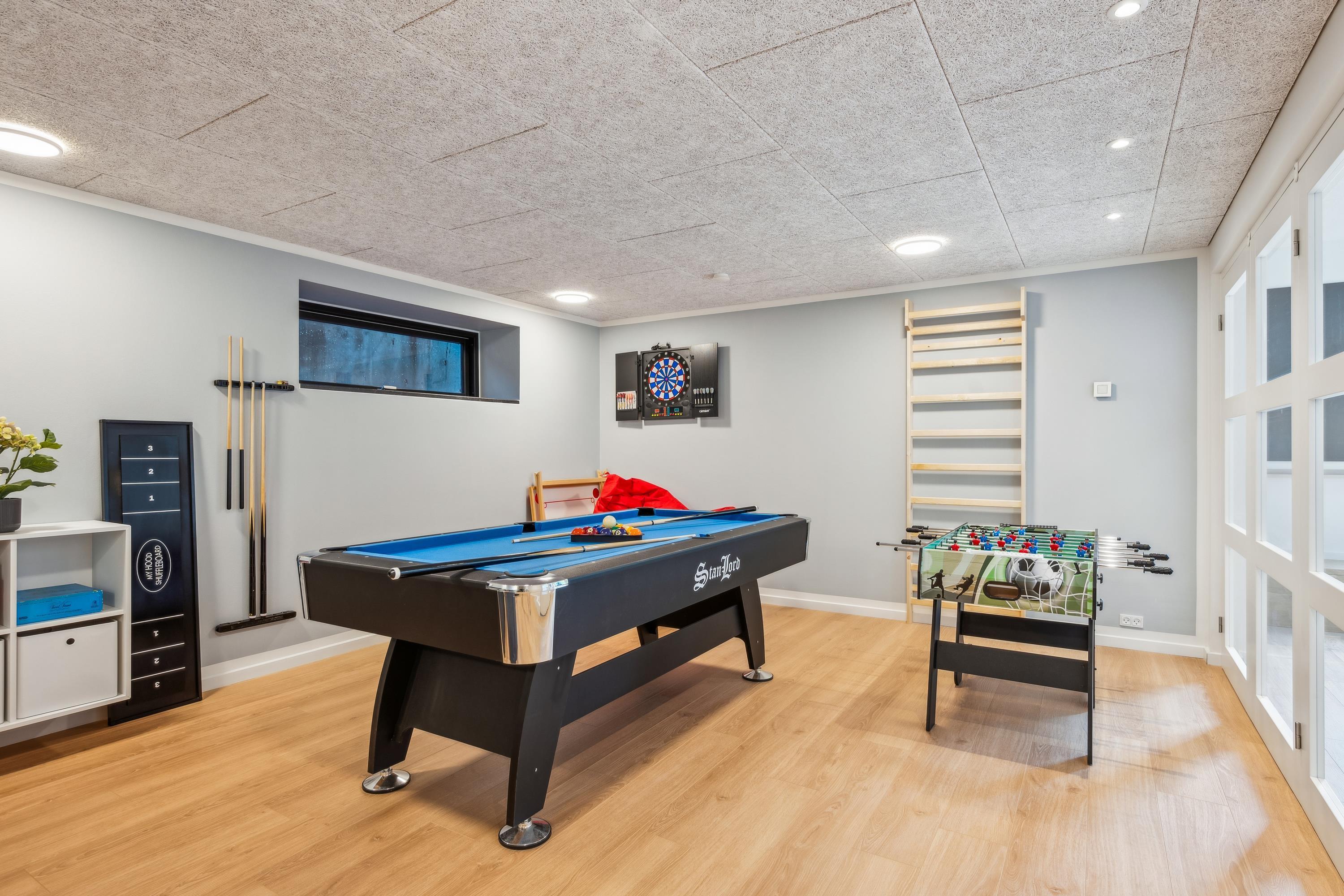 Im selben Bereich befinden sich auch die vier geschmackvoll eingerichteten Schlafzimmer – zwei mit Doppelbetten und zwei mit Einzelbetten. Der Eingangsbereich führt über eine Treppe in die großzügige, moderne Küche mit Zugang zu einer weiteren Terrasse. Hier befindet sich auch eines der beiden schönen Badezimmer. Von der Küche aus gelangen Sie in den geräumigen, gut ausgestatteten Aktivitätsraum mit Billiard, Tischfußball, Darts und diversen Gesellschaftsspielen – alles frei nutzbar. Eine weitere Treppe führt hinunter in den Hauswirtschaftsraum mit Waschmaschine und Trockner. Das zweite Badezimmer ist besonders luxuriös mit Whirlpool, einer großzügigen Doppeldusche und einer Sauna. Das Ferienhaus wird energieeffizient mit Luft-Wasser-Wärmepumpe beheizt.