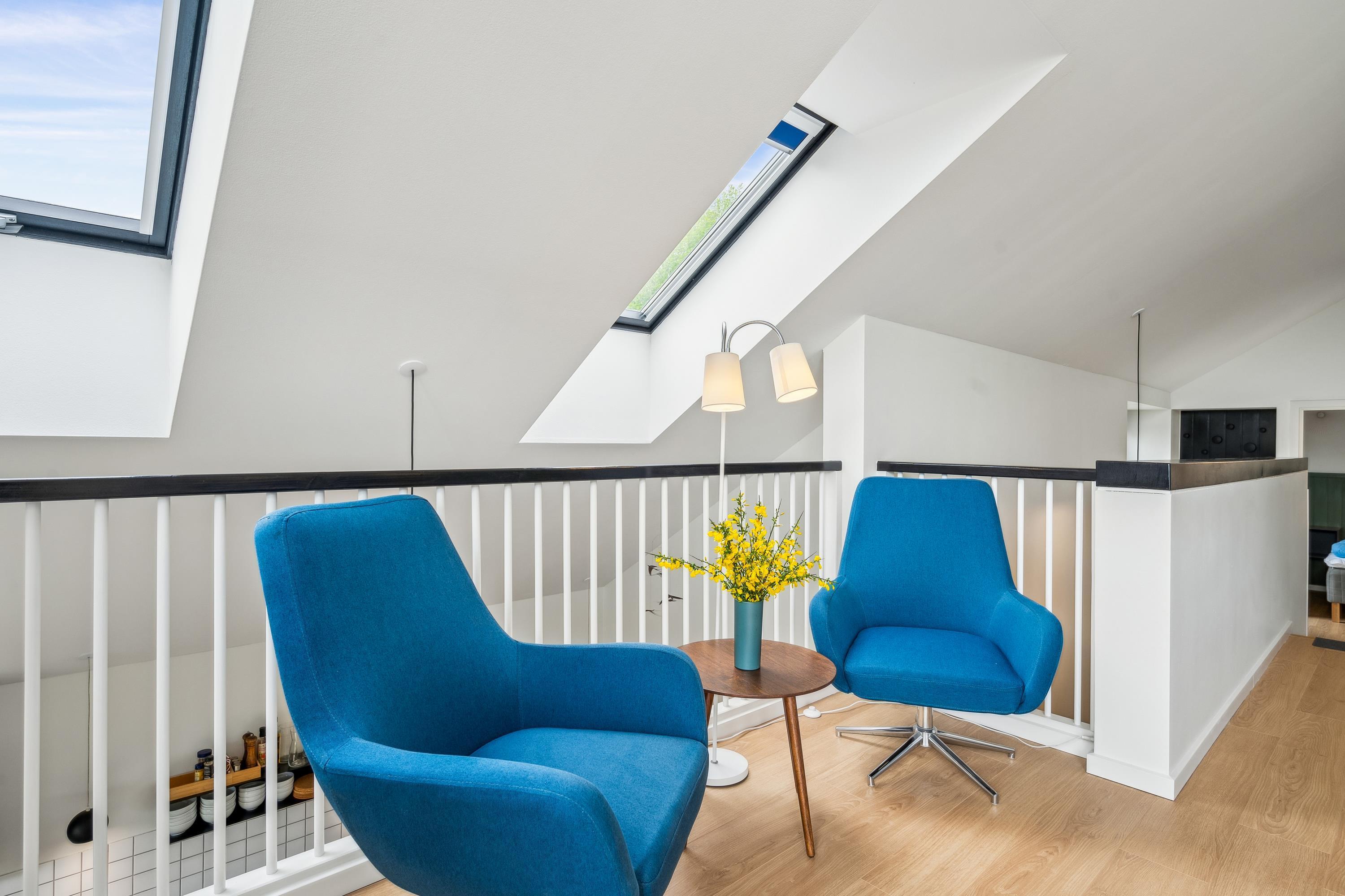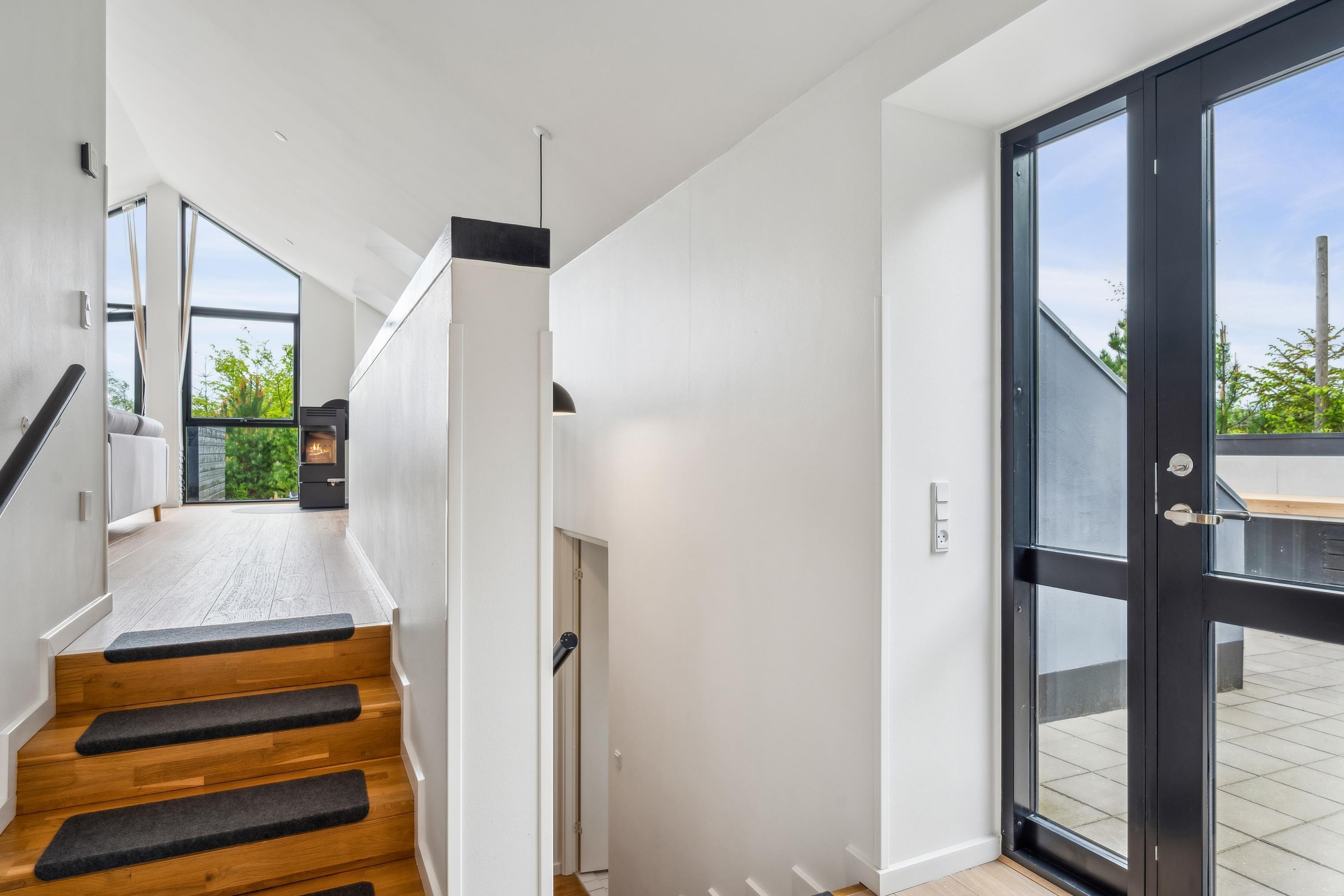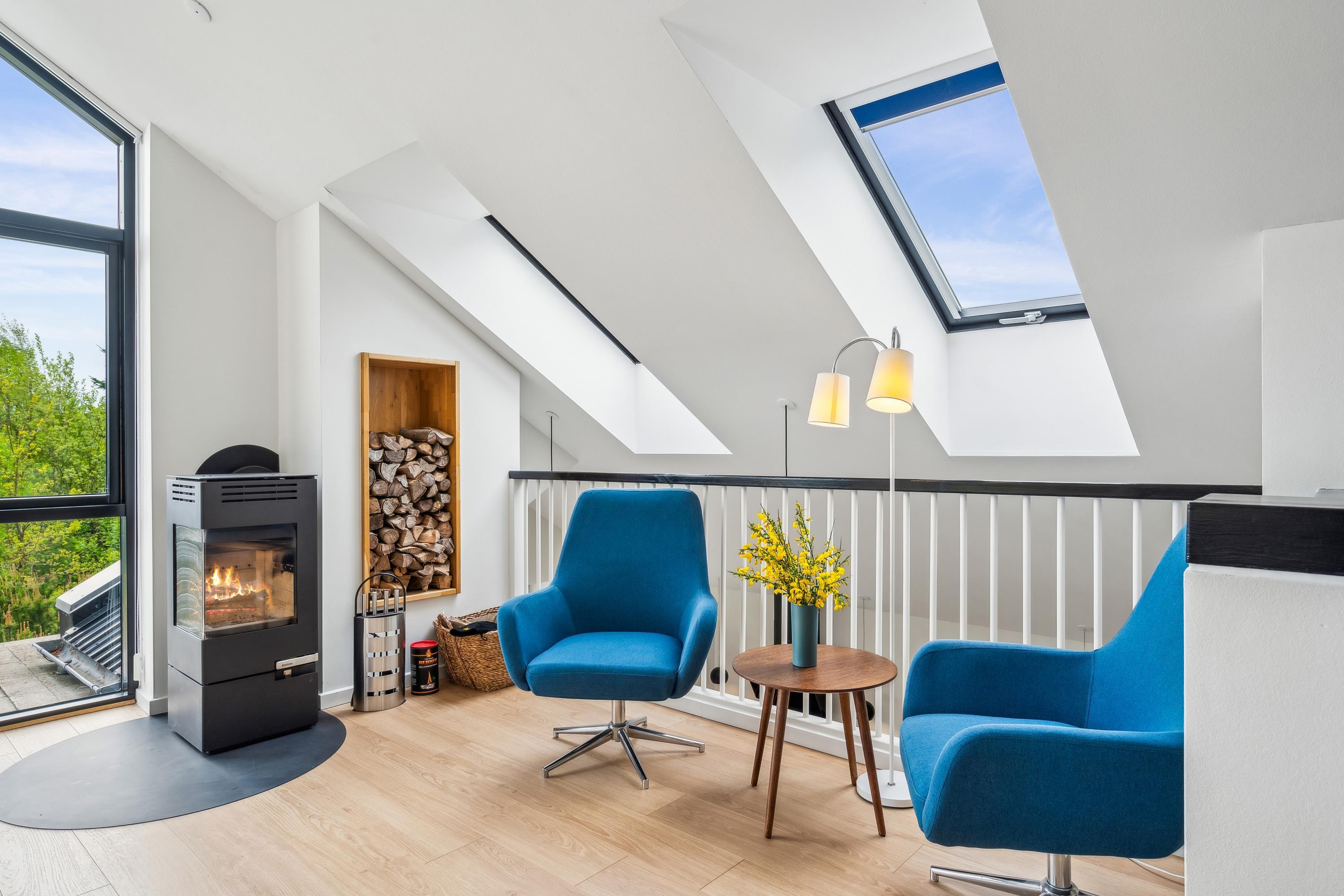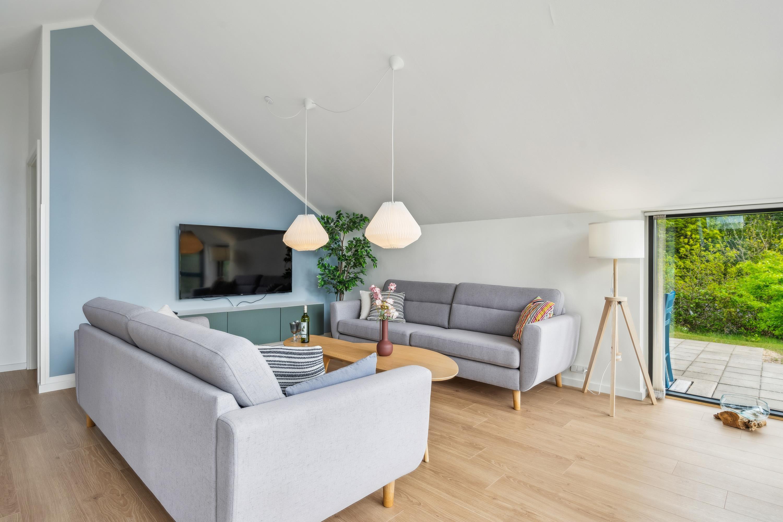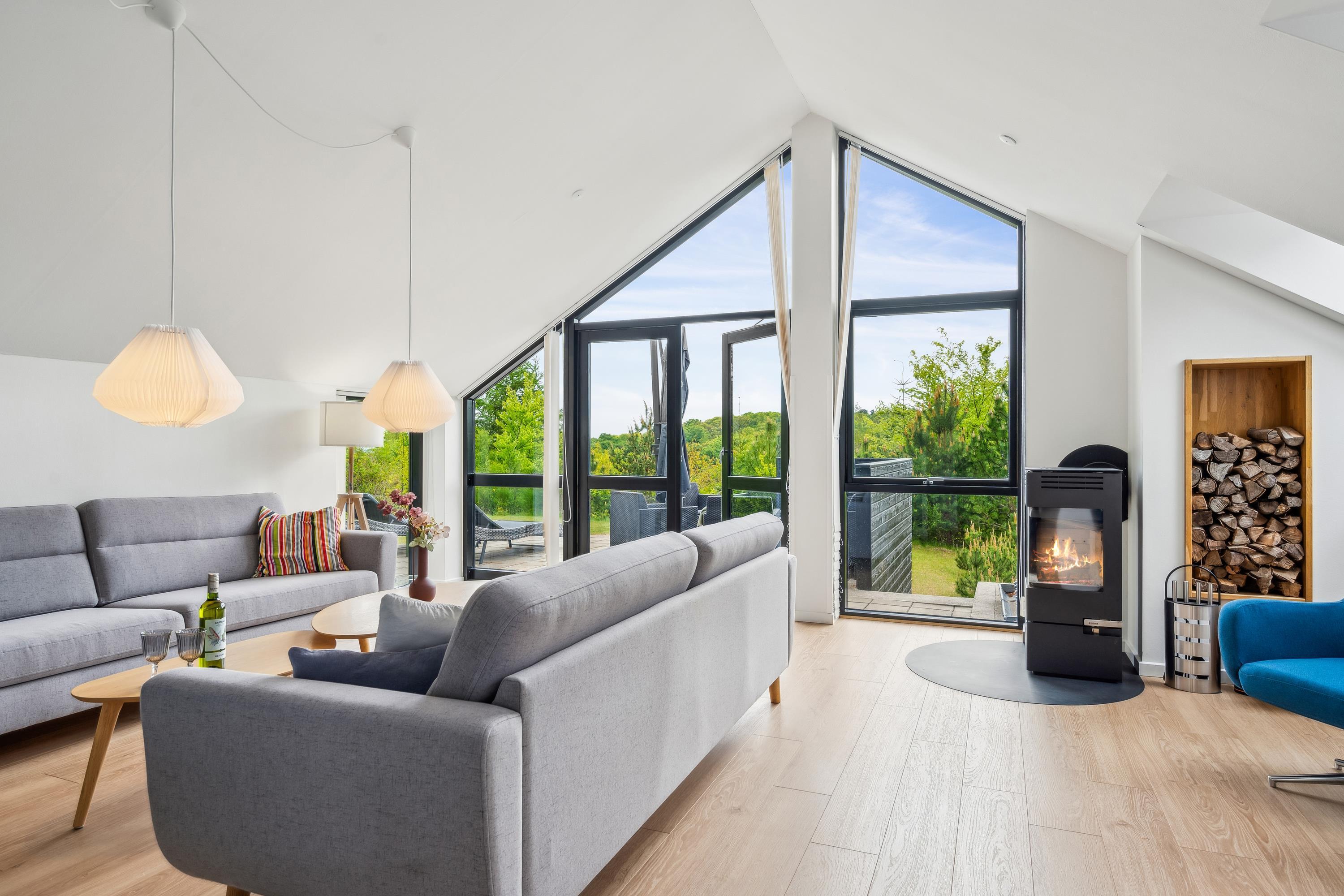 Dieses Haus ist perfekt, um unvergessliche Erinnerungen mit der Familie zu schaffen. Die wunderschöne Umgebung lädt zu erlebnisreichen Unternehmungen und purer Erholung ein. Das Ferienhaus ist in versetzten Ebenen gebaut. Im oberen Bereich befindet sich das helle und schön eingerichtete Wohnzimmer mit komfortablen Möbeln und einem Kaminofen. Von hier aus gelangen Sie auf eine große Terrasse mit Loungemöbeln und Sonnenliegen.