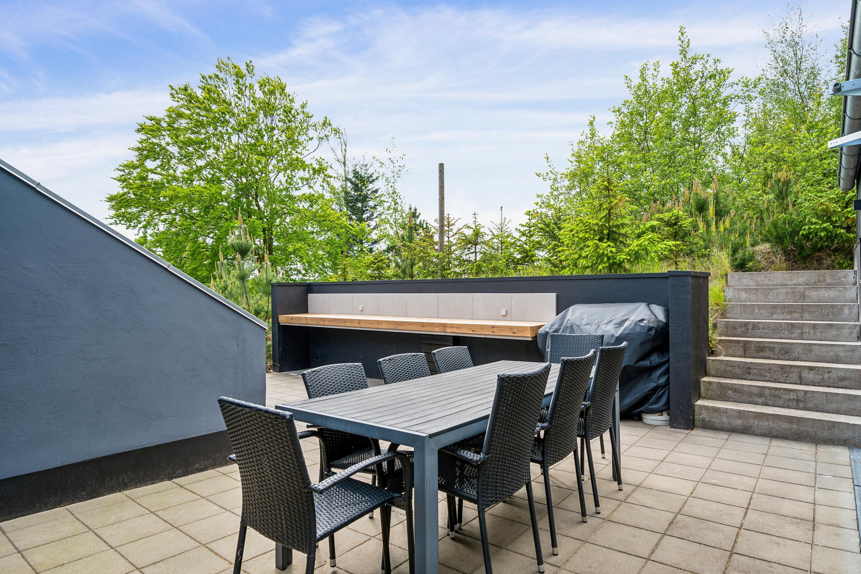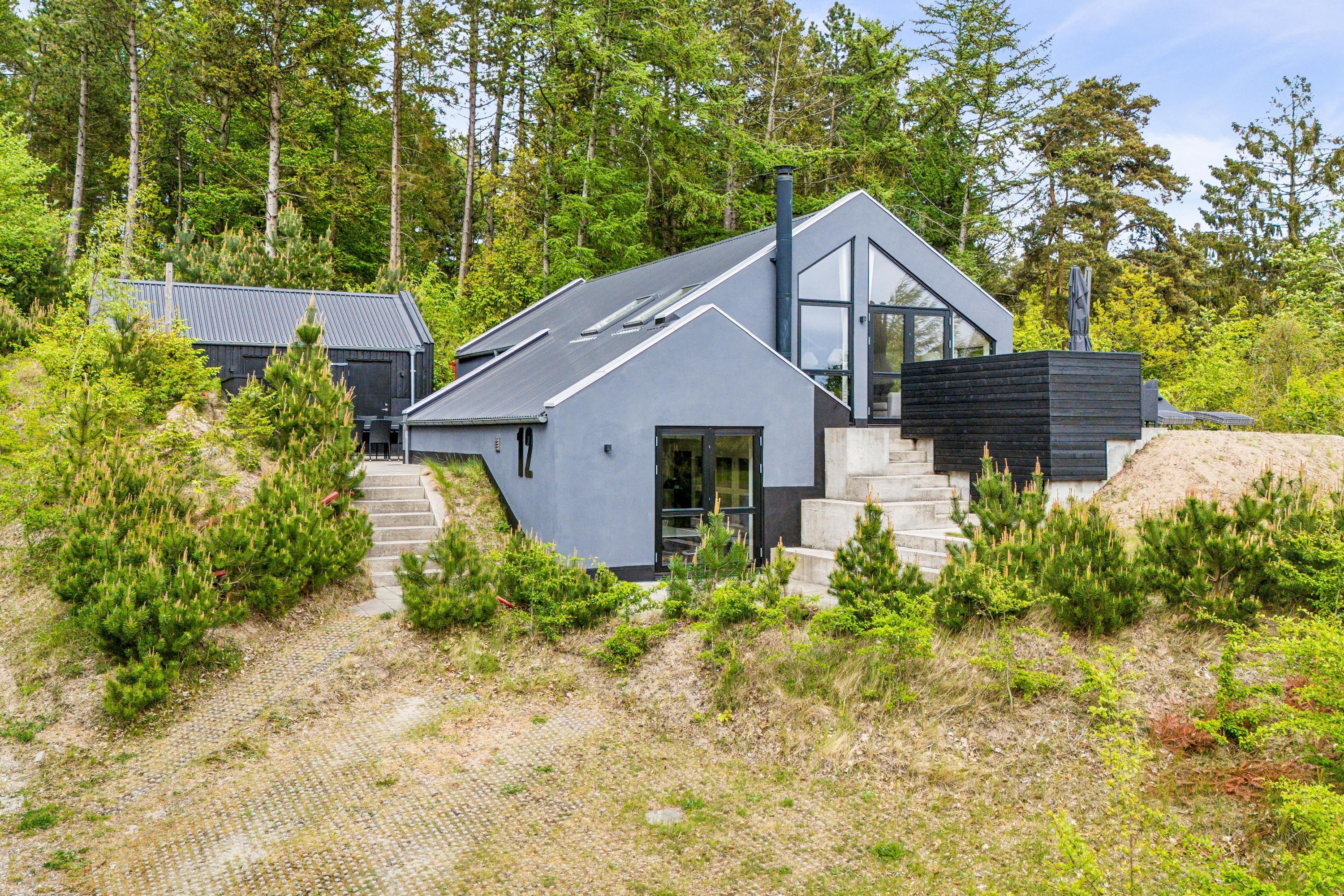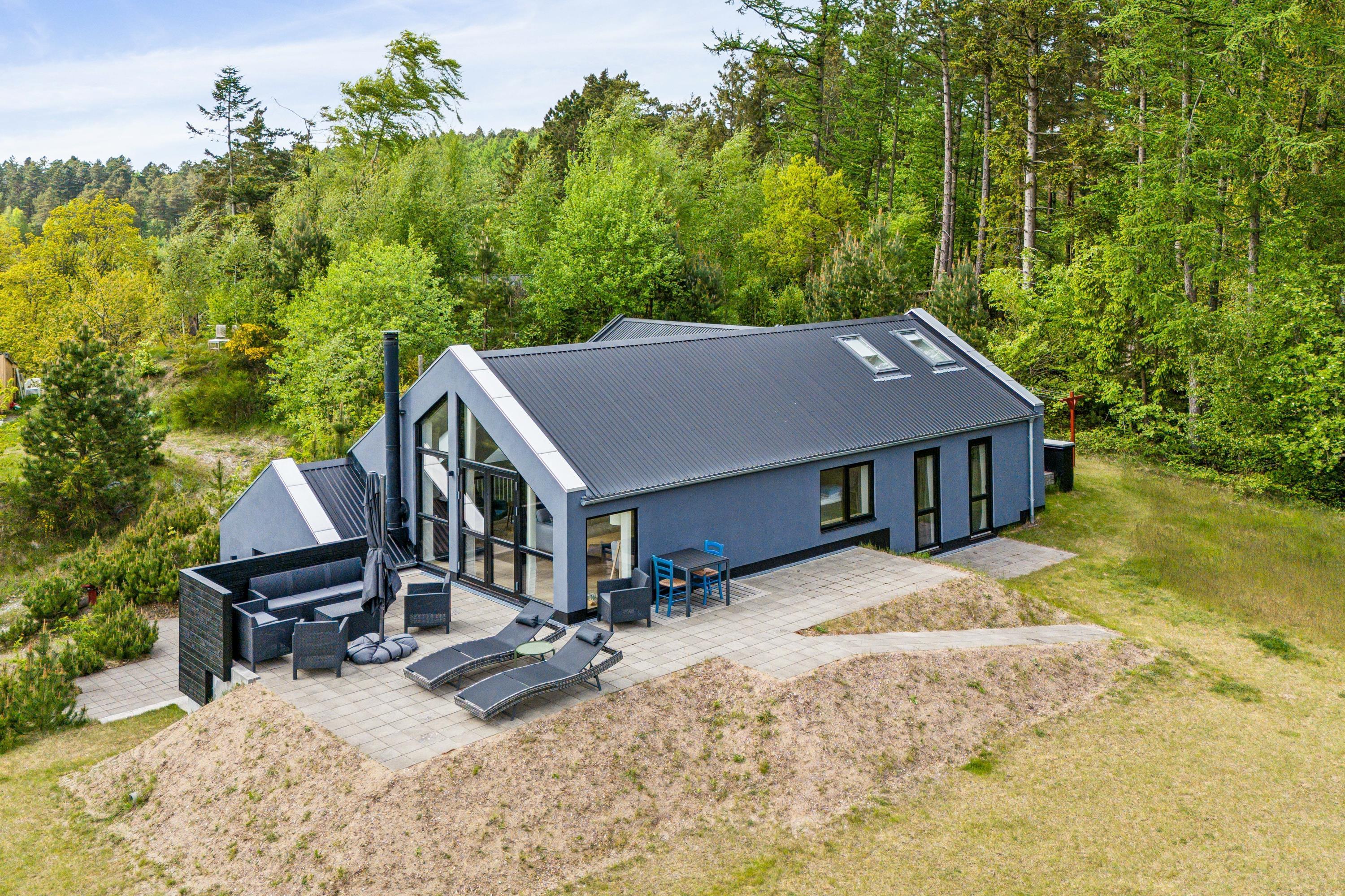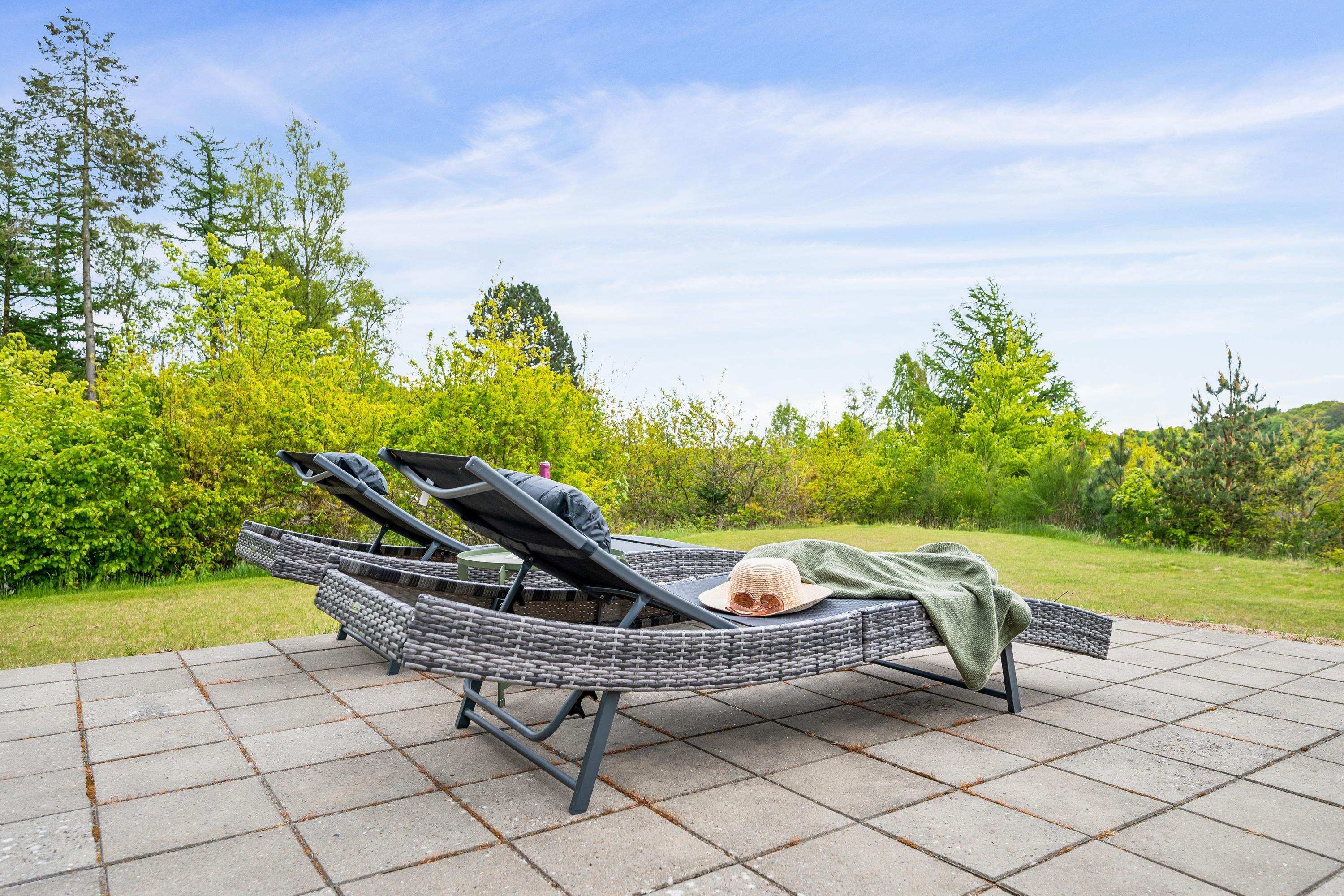 Erleben Sie Erholung und Aktivität im modernen Ferienhaus mit Sauna, Whirlpool und großem Garten in Femmøller, Dänemark.