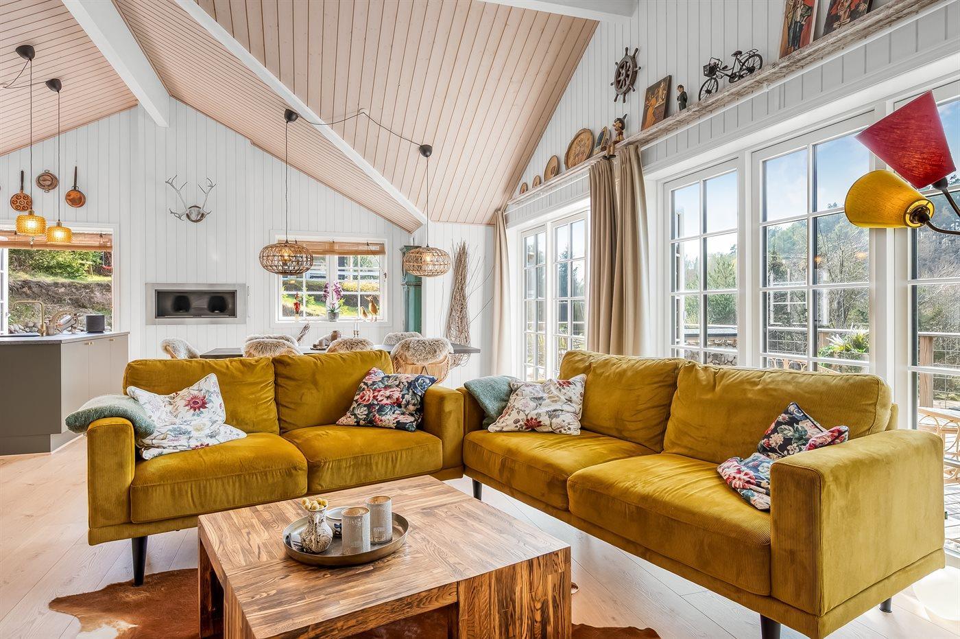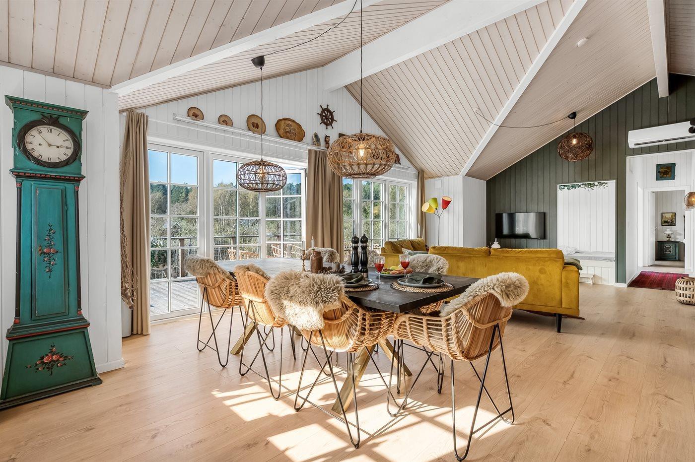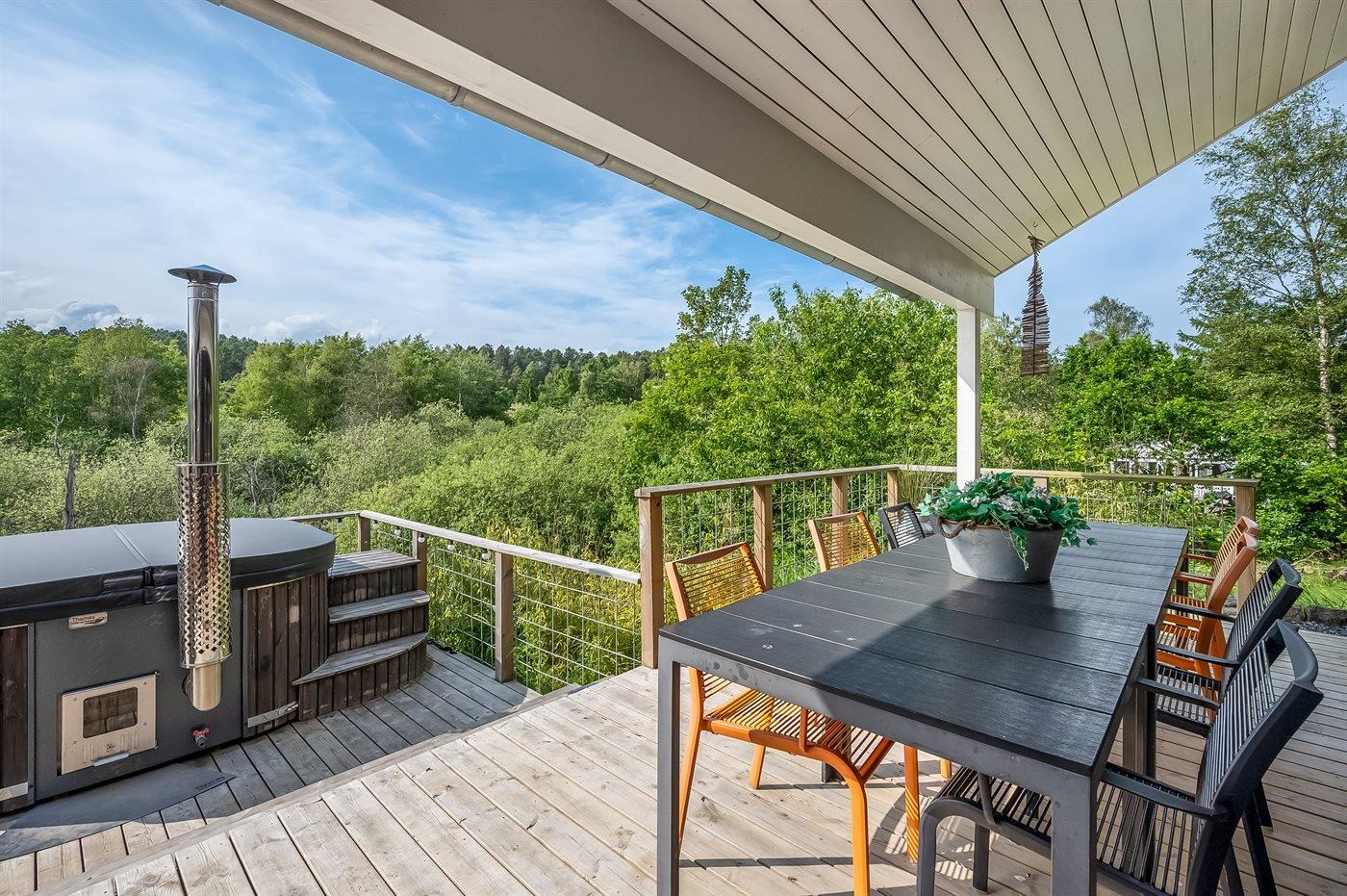 Die Küche, der Essbereich und das Wohnzimmer sind offen miteinander verbunden und bieten direkten Zugang zur großen Terrasse. Hier gibt es viel Platz zum Entspannen und einen Außen-Whirlpool. Auf dem Grundstück unterhalb des Hügels findest du eine Rasenfläche mit viel Platz zum Ballspielen und andere Aktivitäten im Freien sowie eine Lagerfeuerstelle, die zum gemütlichen Beisammensein einlädt.