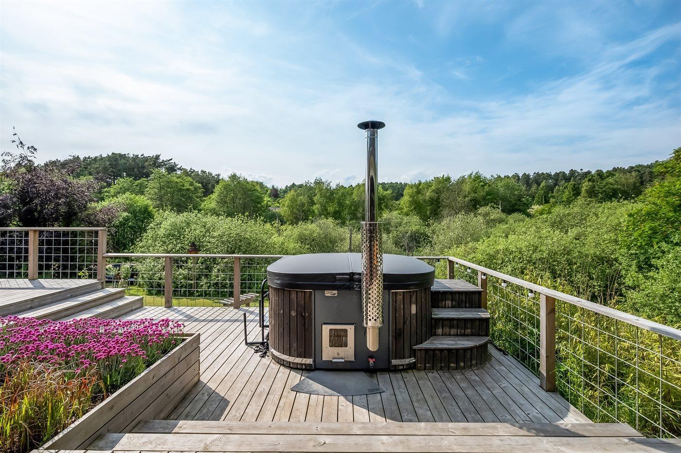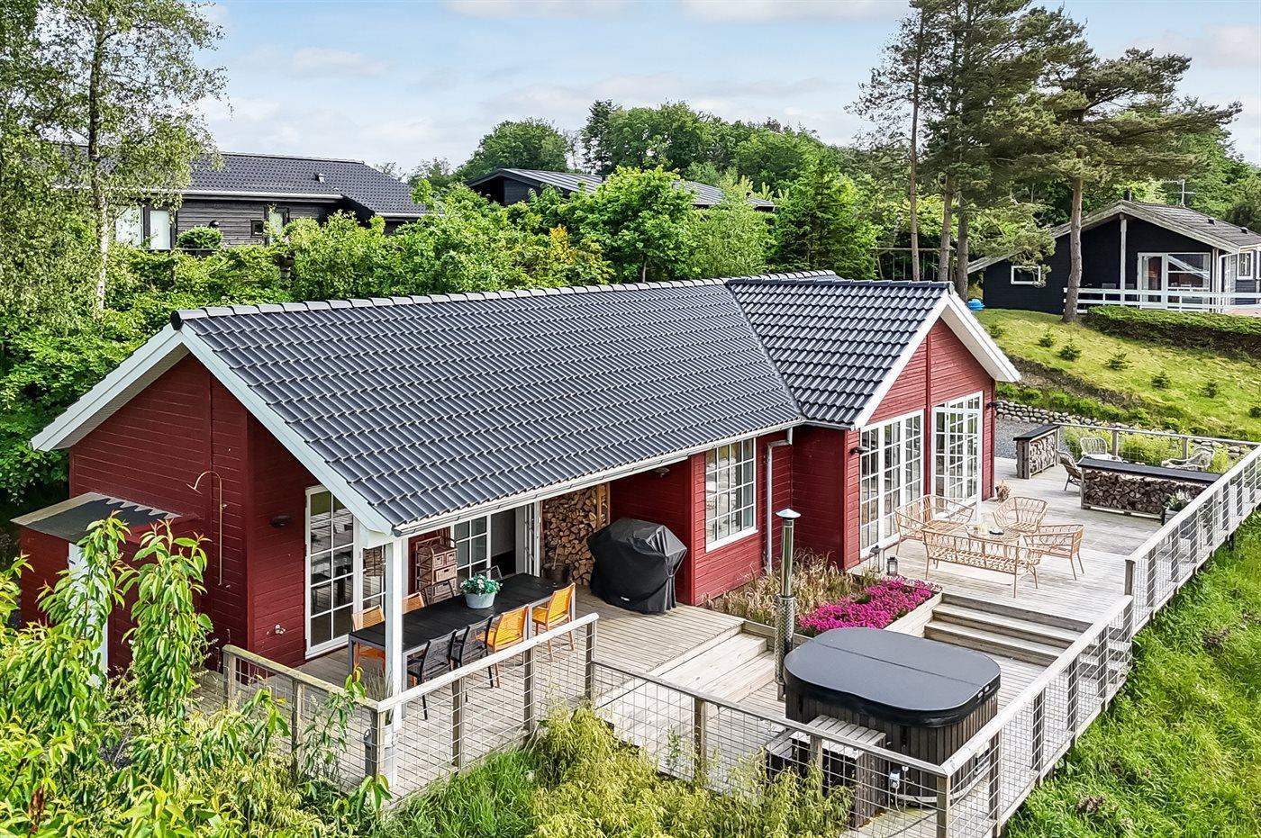 Modernes Ferienhaus in Femmøller mit Whirlpool, Naturgrundstück und Blick auf den See.