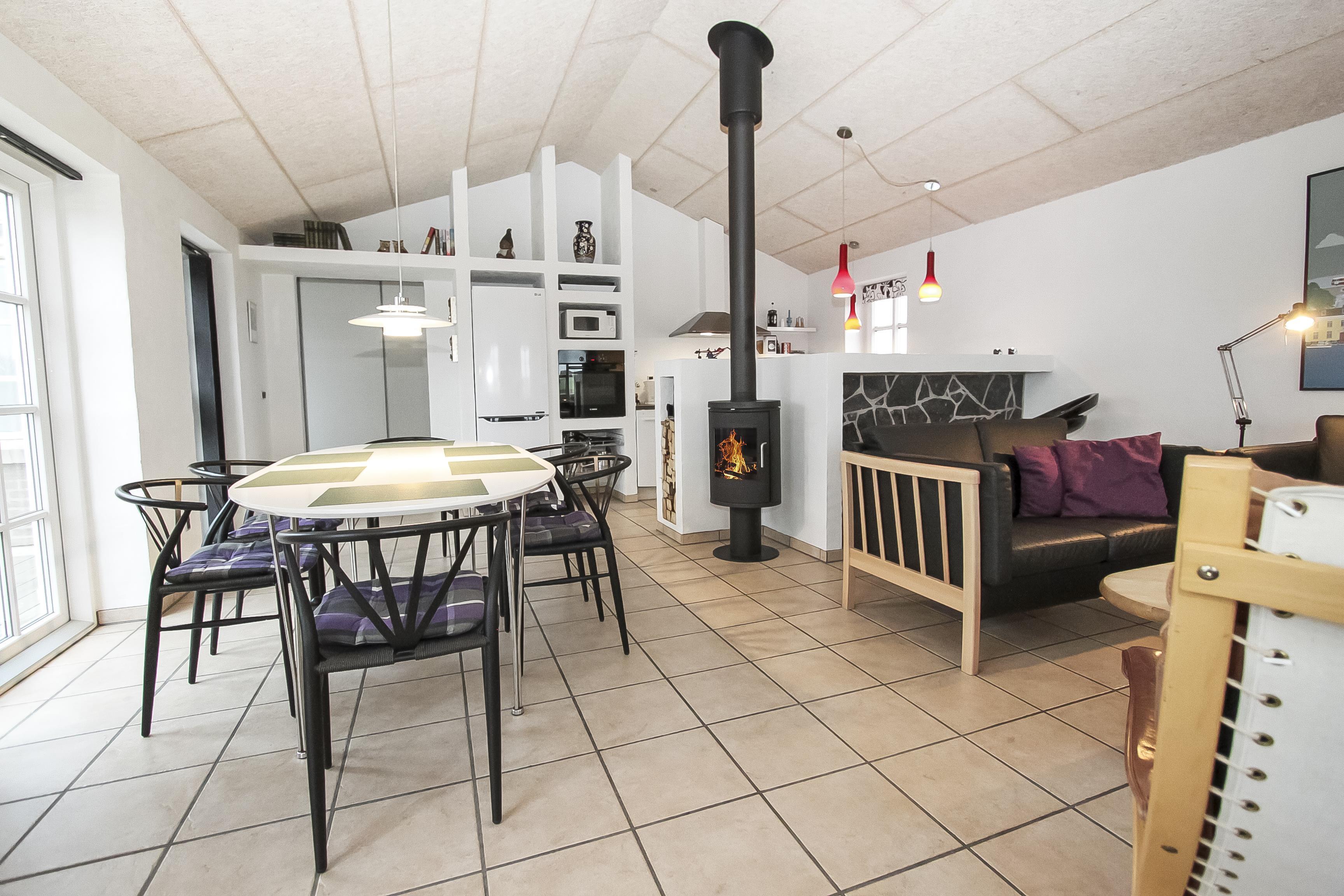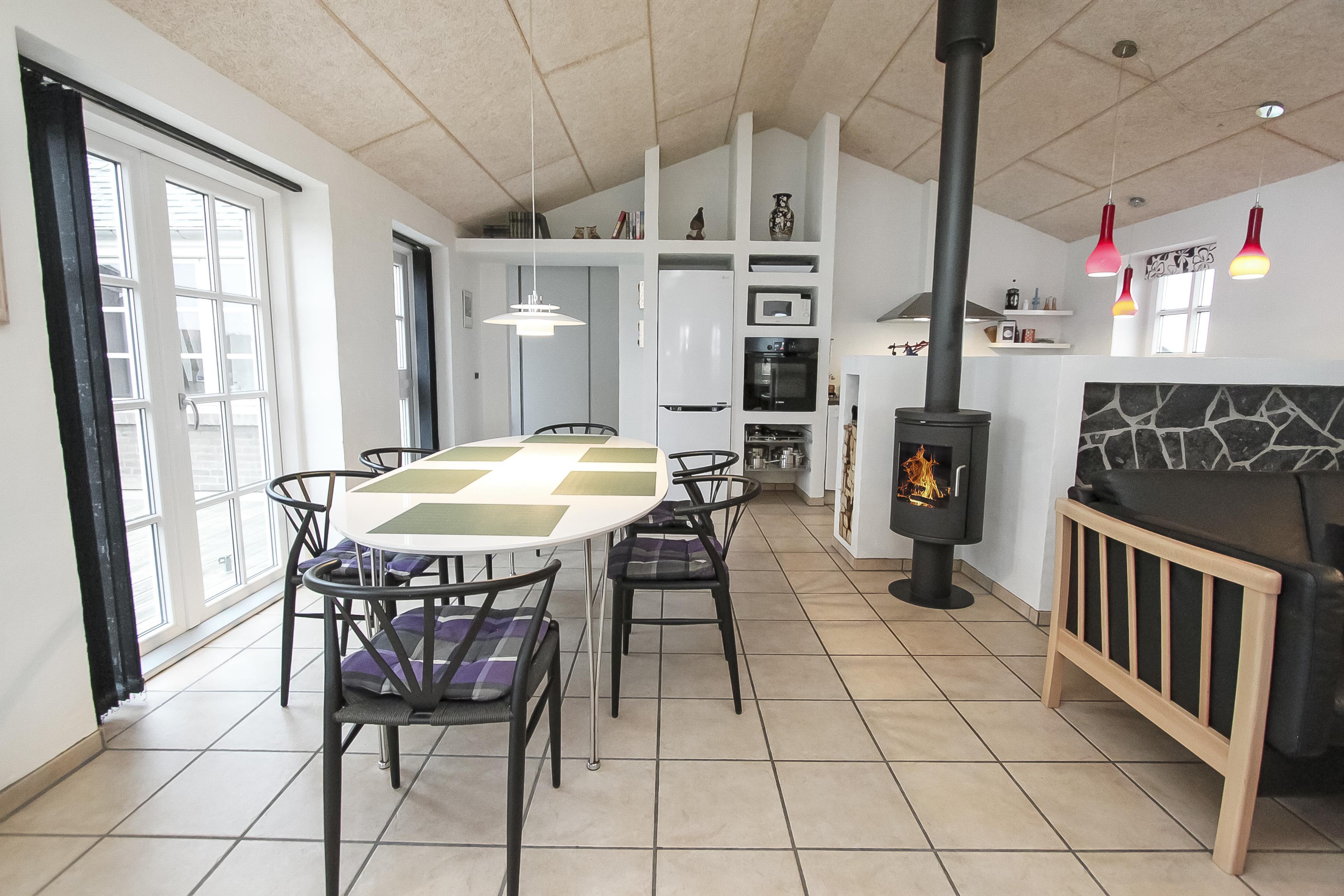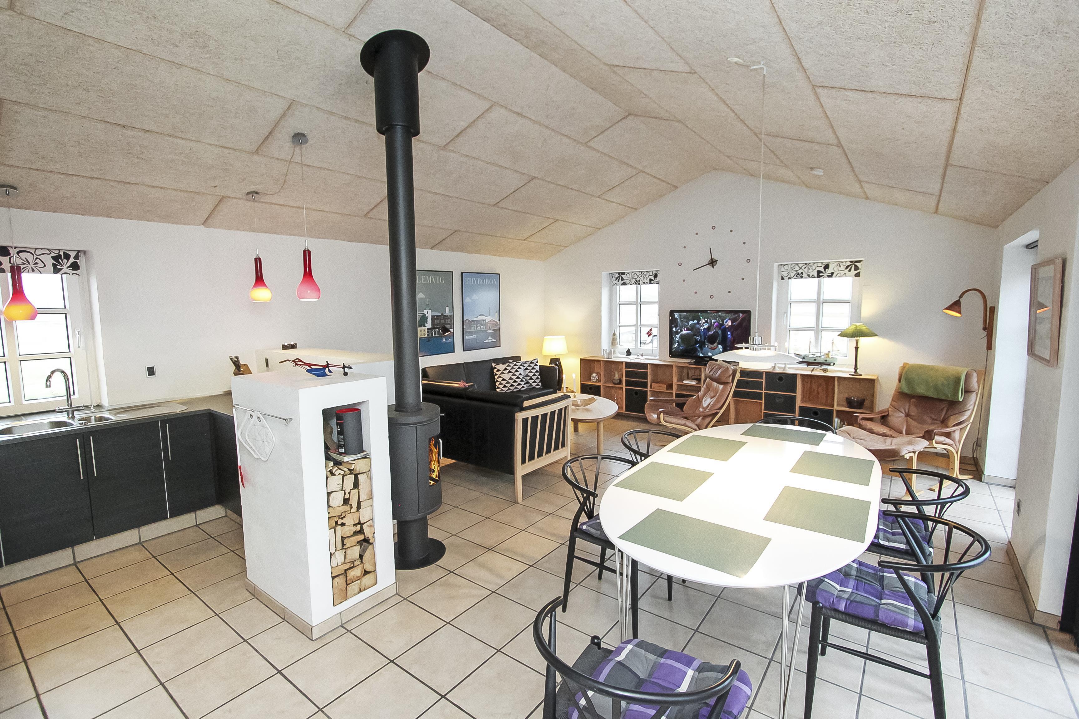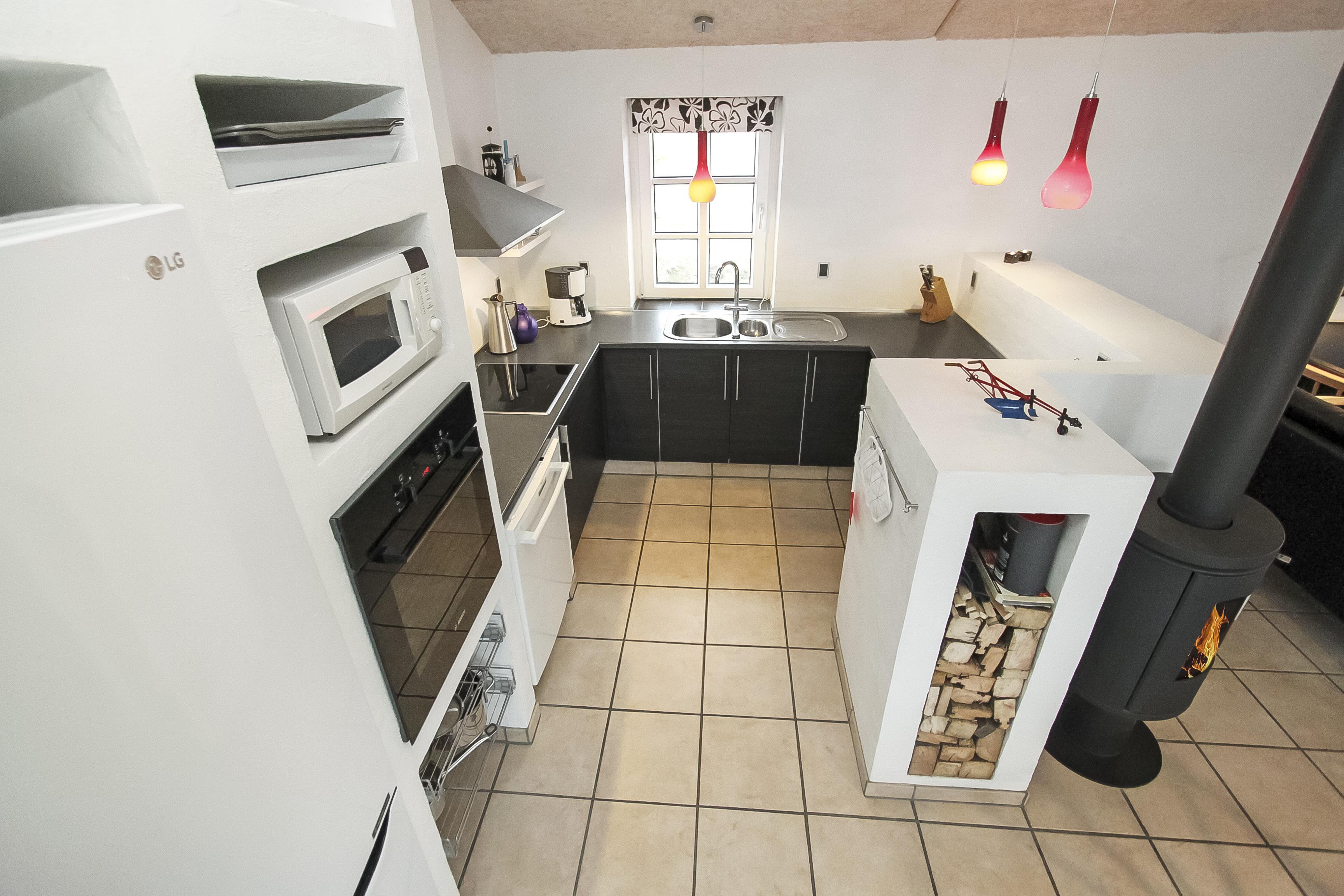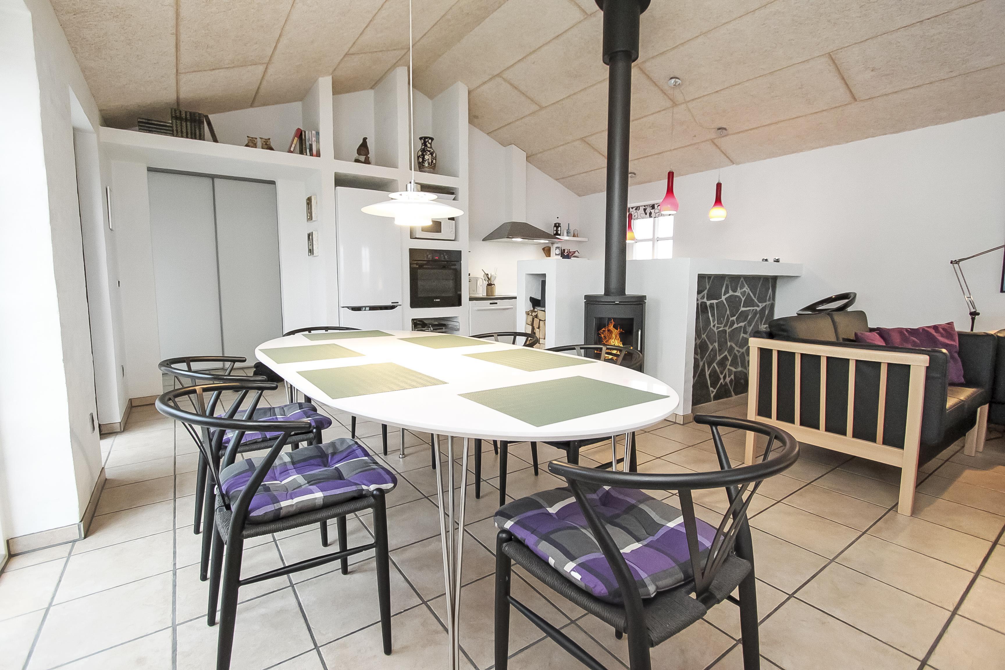 Der Wohnraum und die Küche sind modern eingerichtet. Sie können sich problemlos, wenn Sie sich im Wohnraum oder in der Küche aufhalten, gemeinsam unterhalten. Im Wohnraum gibt es einen Kaminofen, eine Sofagruppe, einen schönen langen Esstisch und einen grossen TV. Beide TV hat Chromecast. Auf dem TV gibt es dänische und deutsche Programme und Radio. Die Küche ist ausgestattet mit Herd mit Cerankochfeld, Mikrowelle, Geschirrspüler, Kühlschrank und spearater Gefriertruhe mit 70 l. Ausserdem gibt es auch eine Waschmaschine im Haus. 3 Schlafräume: 1DB + 1DB + 1DB, offener Schlafboden mit 2 Schlafmöglichkeiten. Das Badezimmer ist modern eingerichtet und ist mit Fussbodenheizung, Badewanne, Dusche, Toilette und Waschbecken ausgestattet– es fehlt hier nichts-.