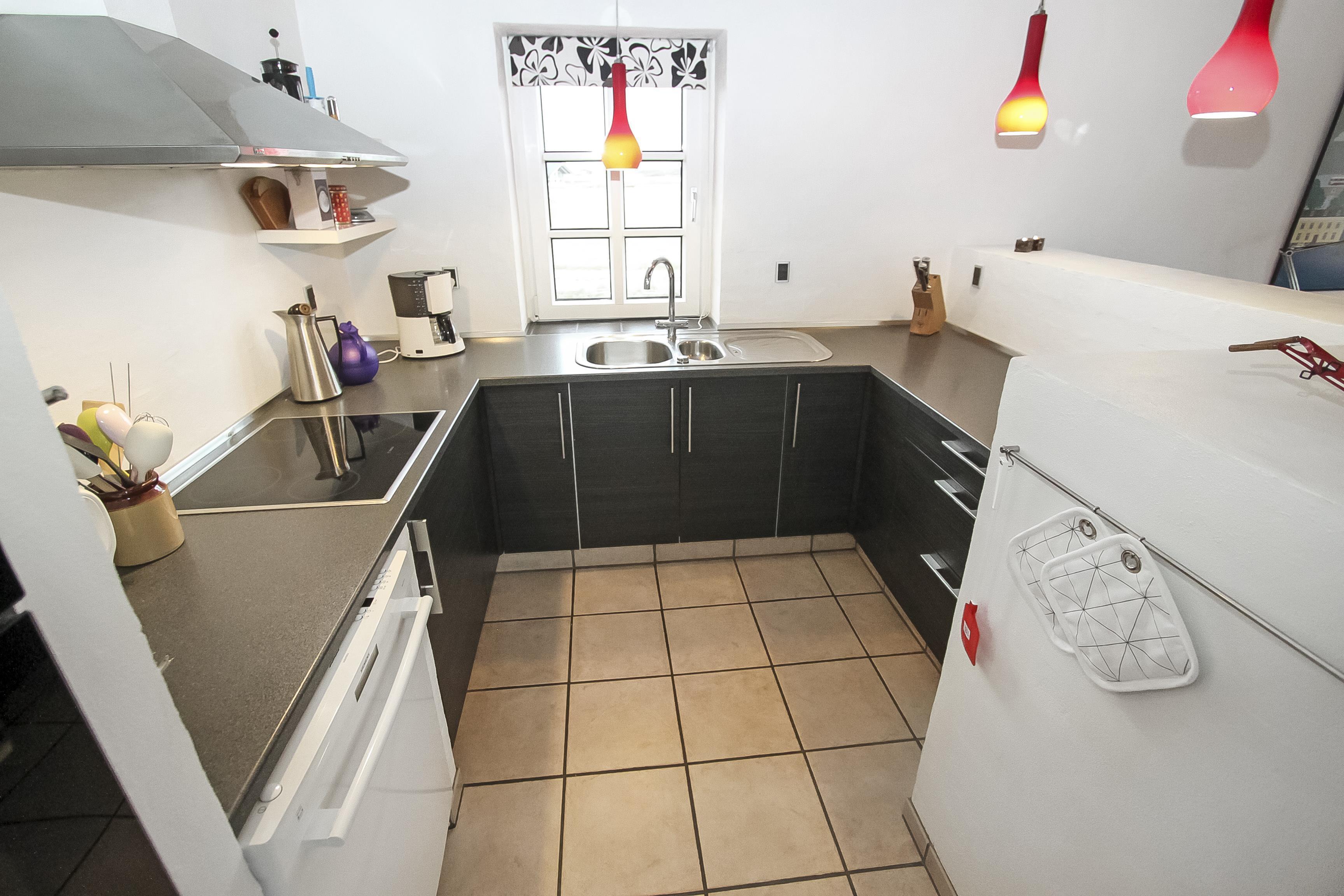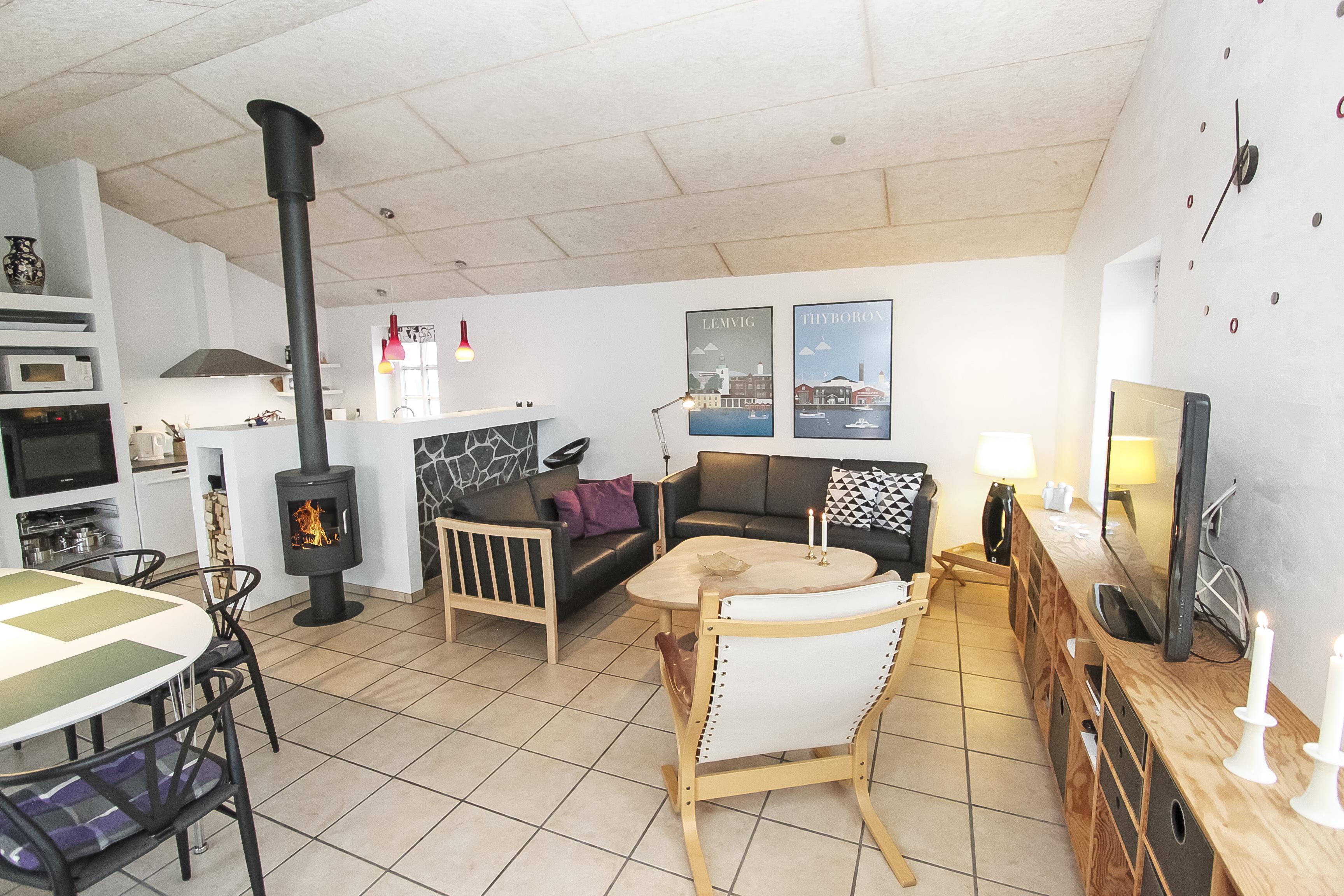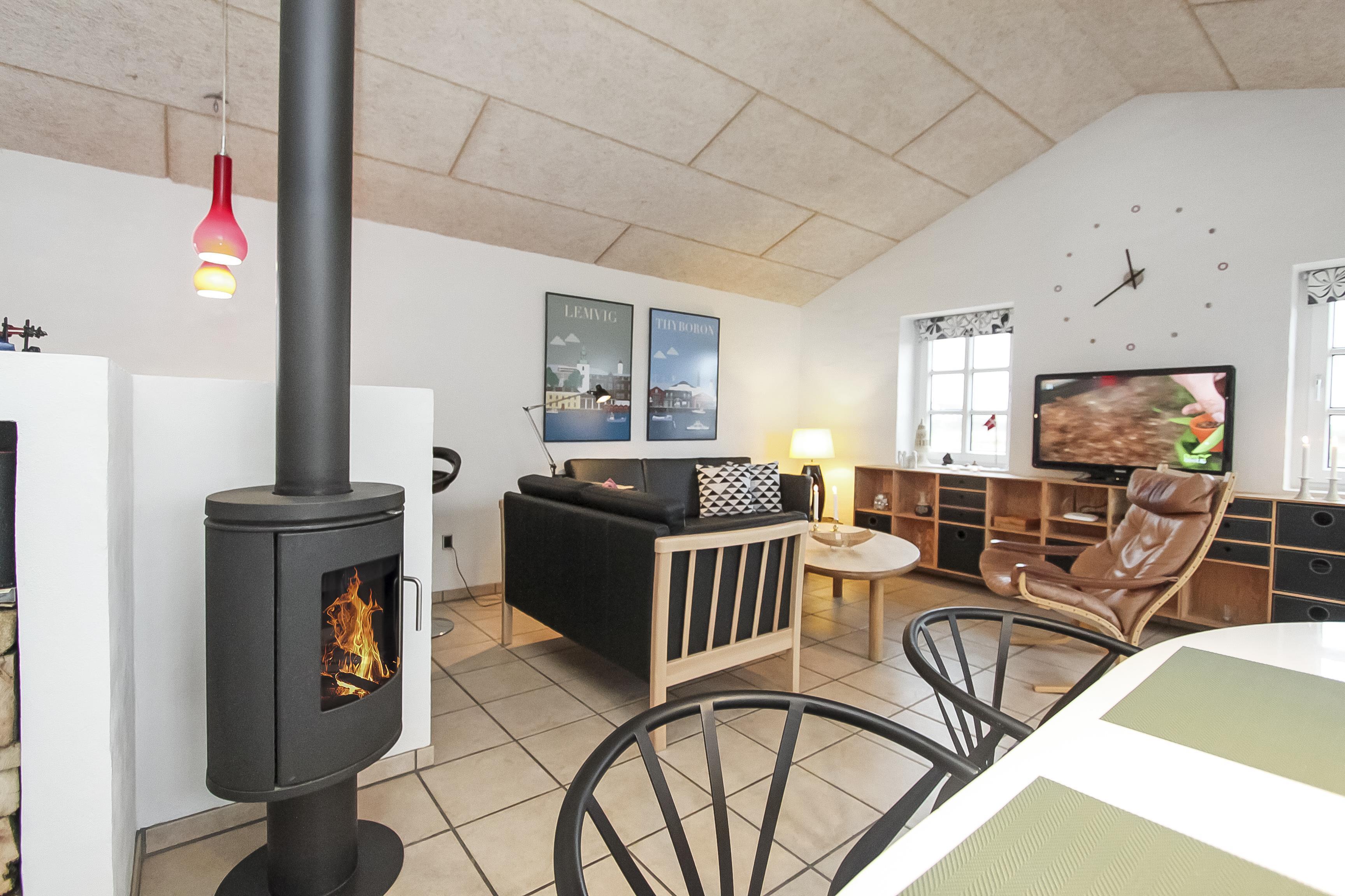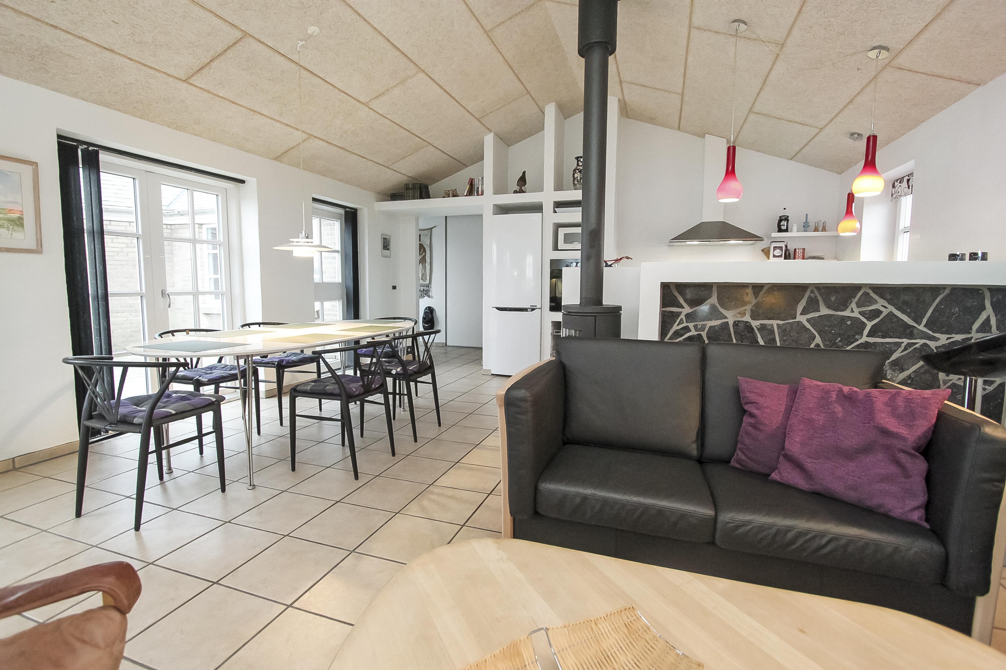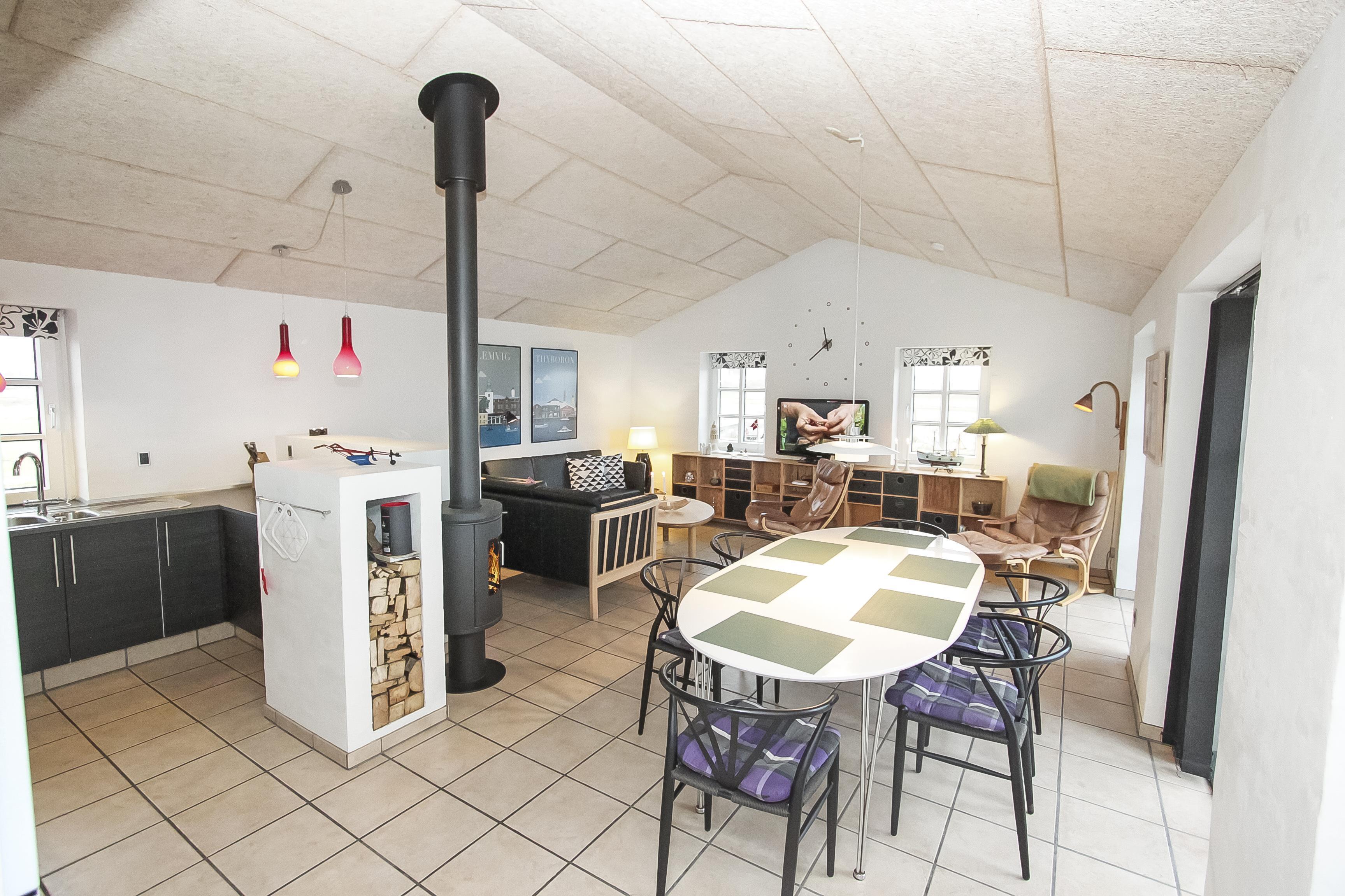 Der Wohnraum und die Küche sind modern eingerichtet. Sie können sich problemlos, wenn Sie sich im Wohnraum oder in der Küche aufhalten, gemeinsam unterhalten. Im Wohnraum gibt es einen Kaminofen, eine Sofagruppe, einen schönen langen Esstisch und einen grossen TV. Beide TV hat Chromecast. Auf dem TV gibt es dänische und deutsche Programme und Radio. Die Küche ist ausgestattet mit Herd mit Cerankochfeld, Mikrowelle, Geschirrspüler, Kühlschrank und spearater Gefriertruhe mit 70 l. Ausserdem gibt es auch eine Waschmaschine im Haus. 3 Schlafräume: 1DB + 1DB + 1DB, offener Schlafboden mit 2 Schlafmöglichkeiten. Das Badezimmer ist modern eingerichtet und ist mit Fussbodenheizung, Badewanne, Dusche, Toilette und Waschbecken ausgestattet– es fehlt hier nichts-.