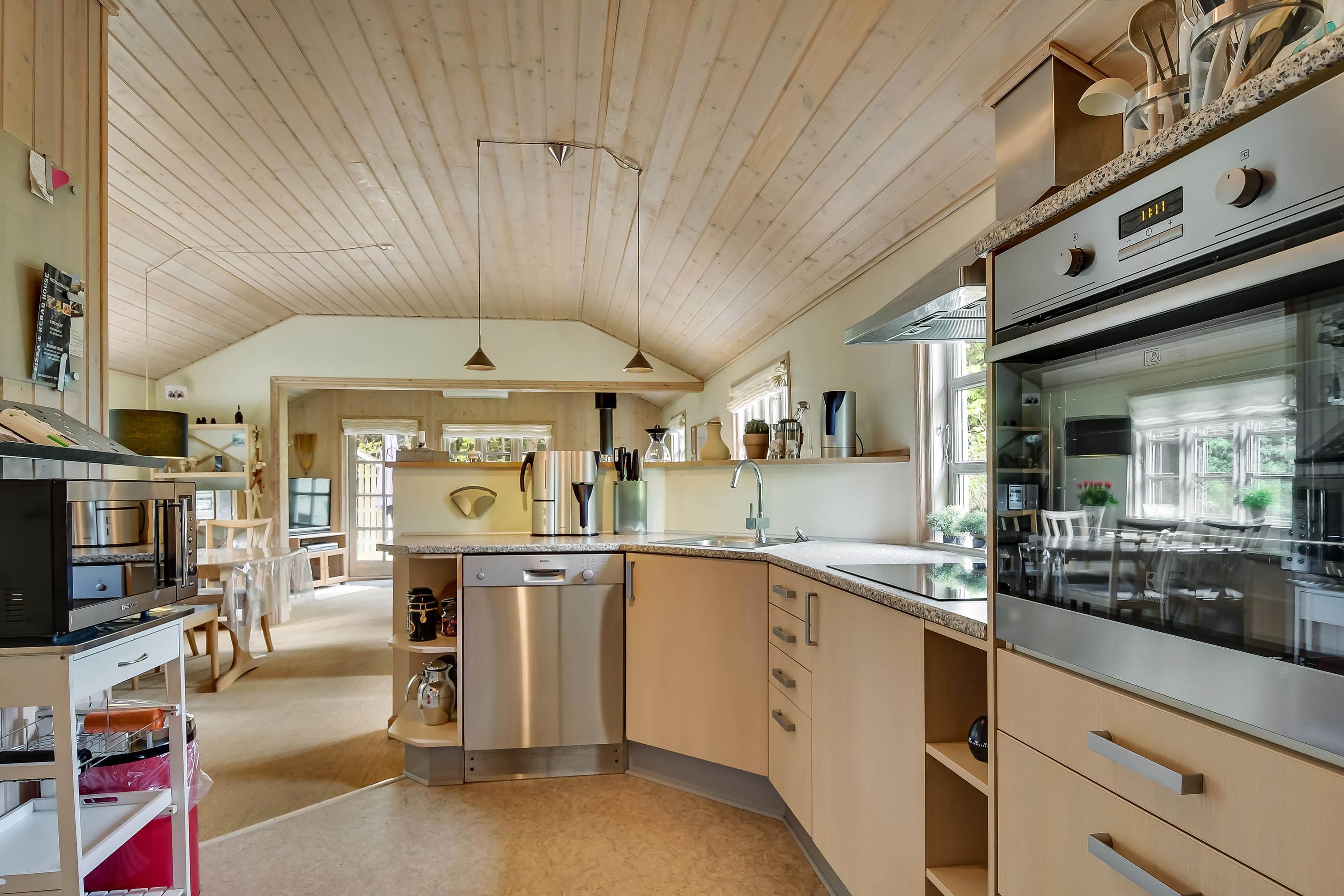Die gut ausgestattete Küche mit viel Arbeitsfläche ist offen mit dem Wohnzimmer verbunden, wo ein Kaminofen und eine Wärmepumpe für behagliche Wärme und Gemütlichkeit sorgen – zu jeder Jahreszeit.