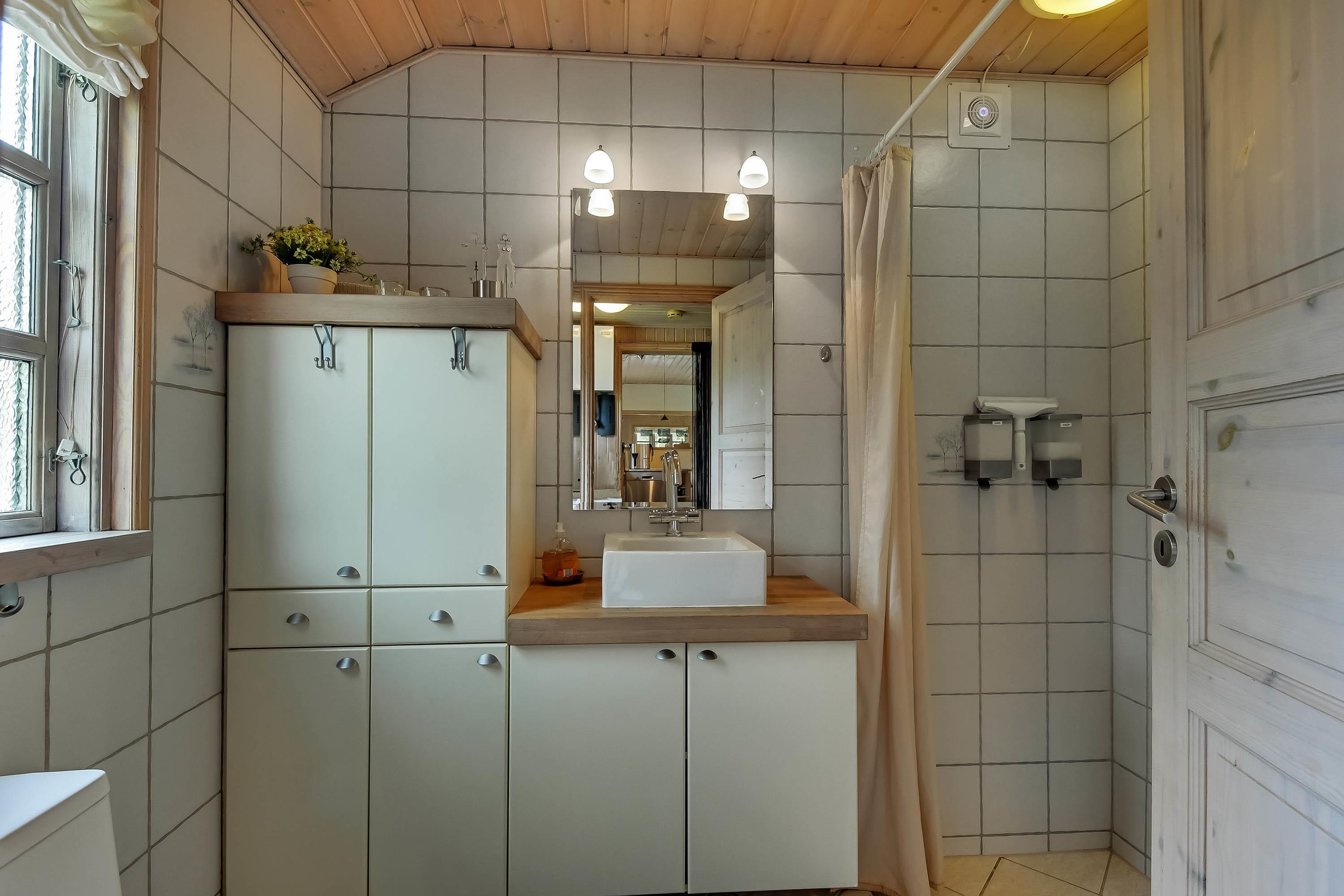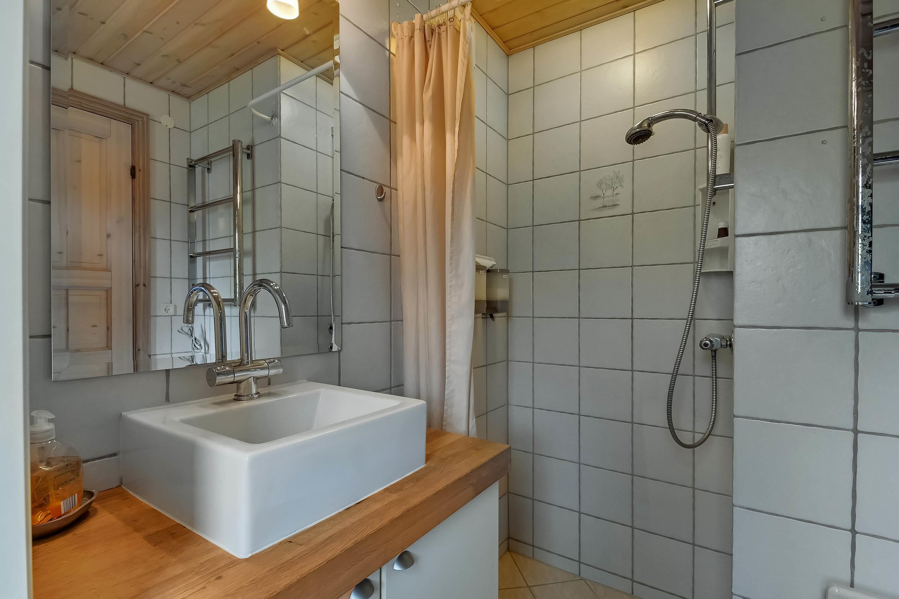 Im Haupthaus befinden sich zwei Schlafzimmer – eines mit Doppelbett und eines mit zwei Einzelbetten – sowie ein helles Badezimmer mit Dusche und eine Waschmaschine im Eingangsbereich.