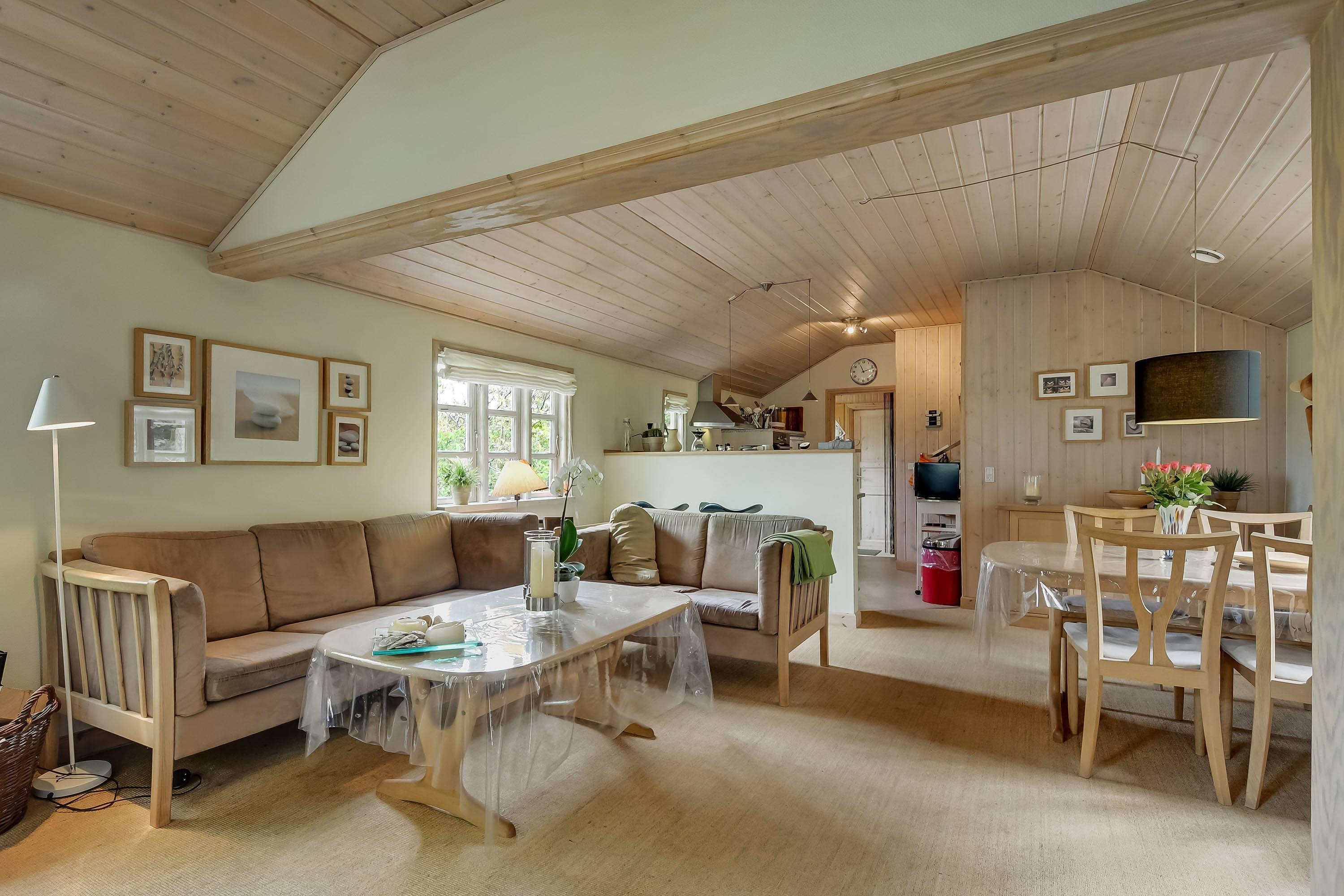 Hier gibt es außerdem eine bequeme Sofaecke, einen Essbereich und einen Fernseher – perfekt für entspannte Abende nach einem Tag am Strand oder im Wald.