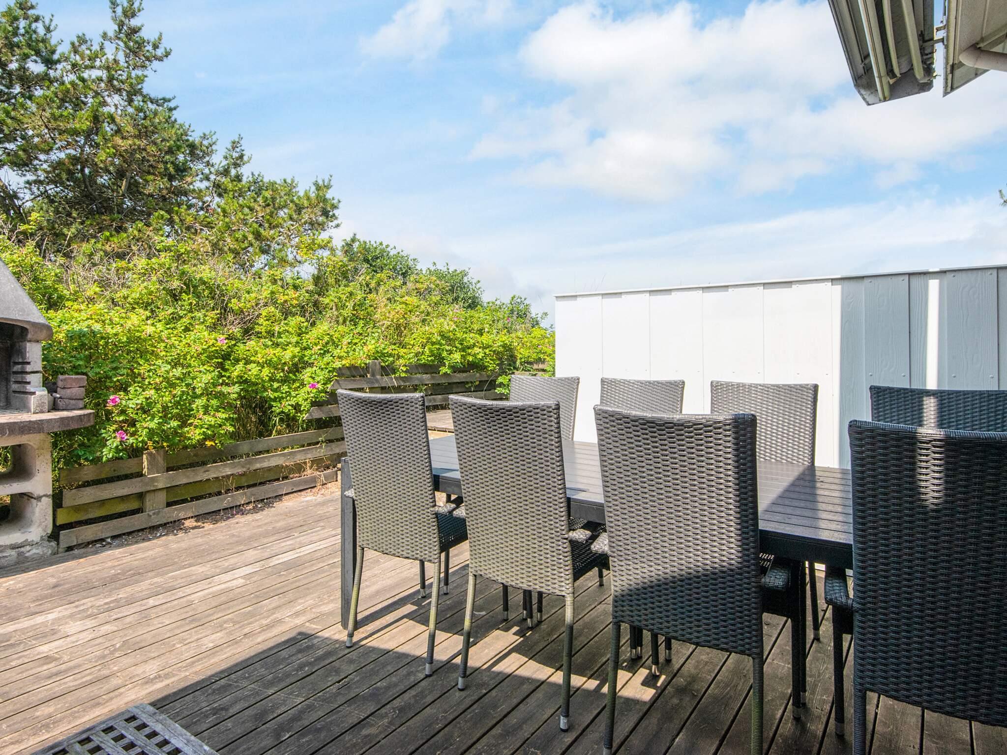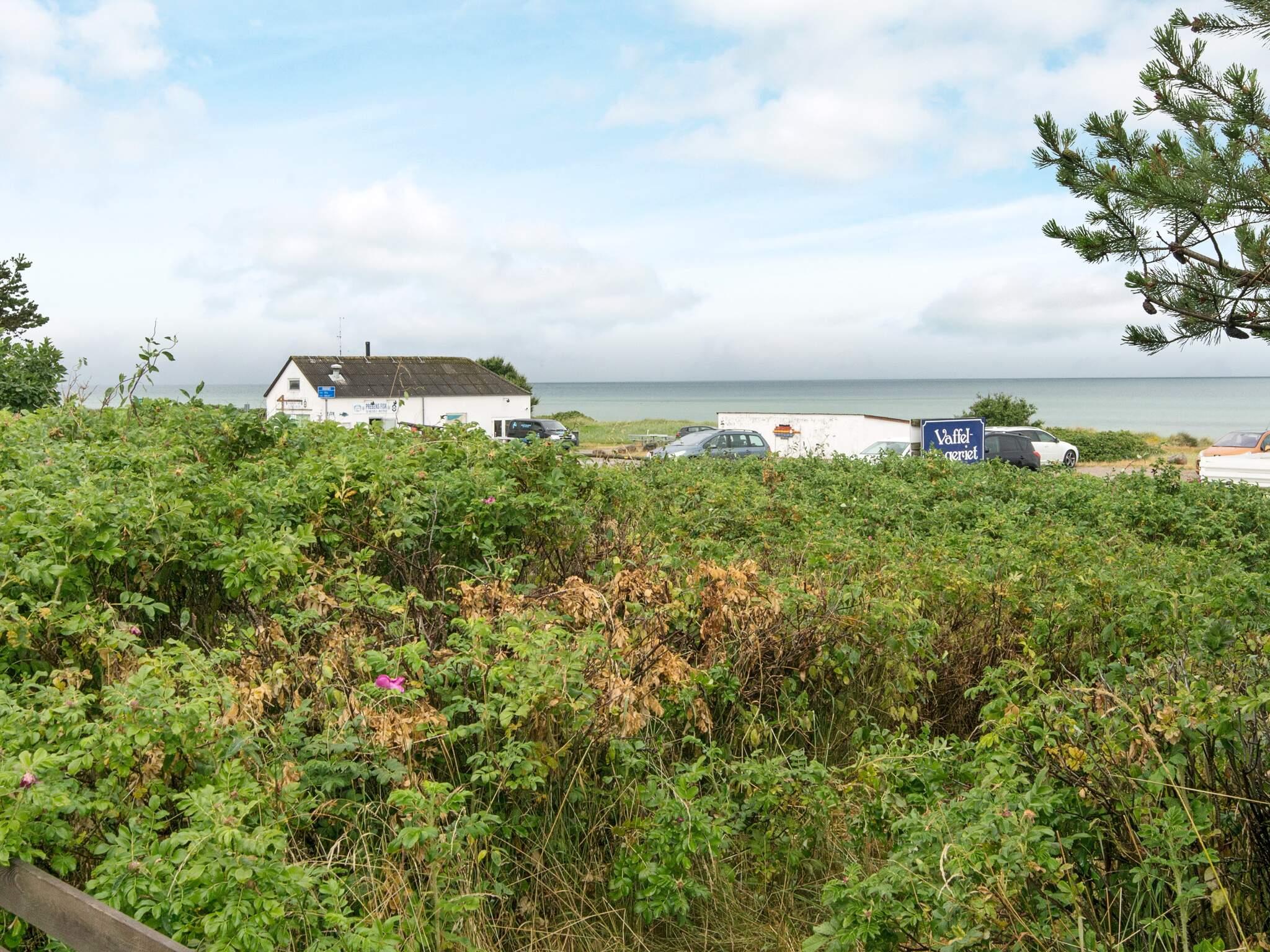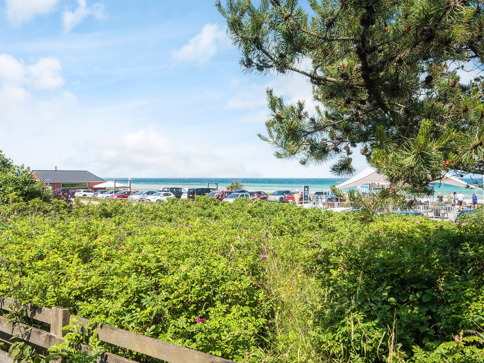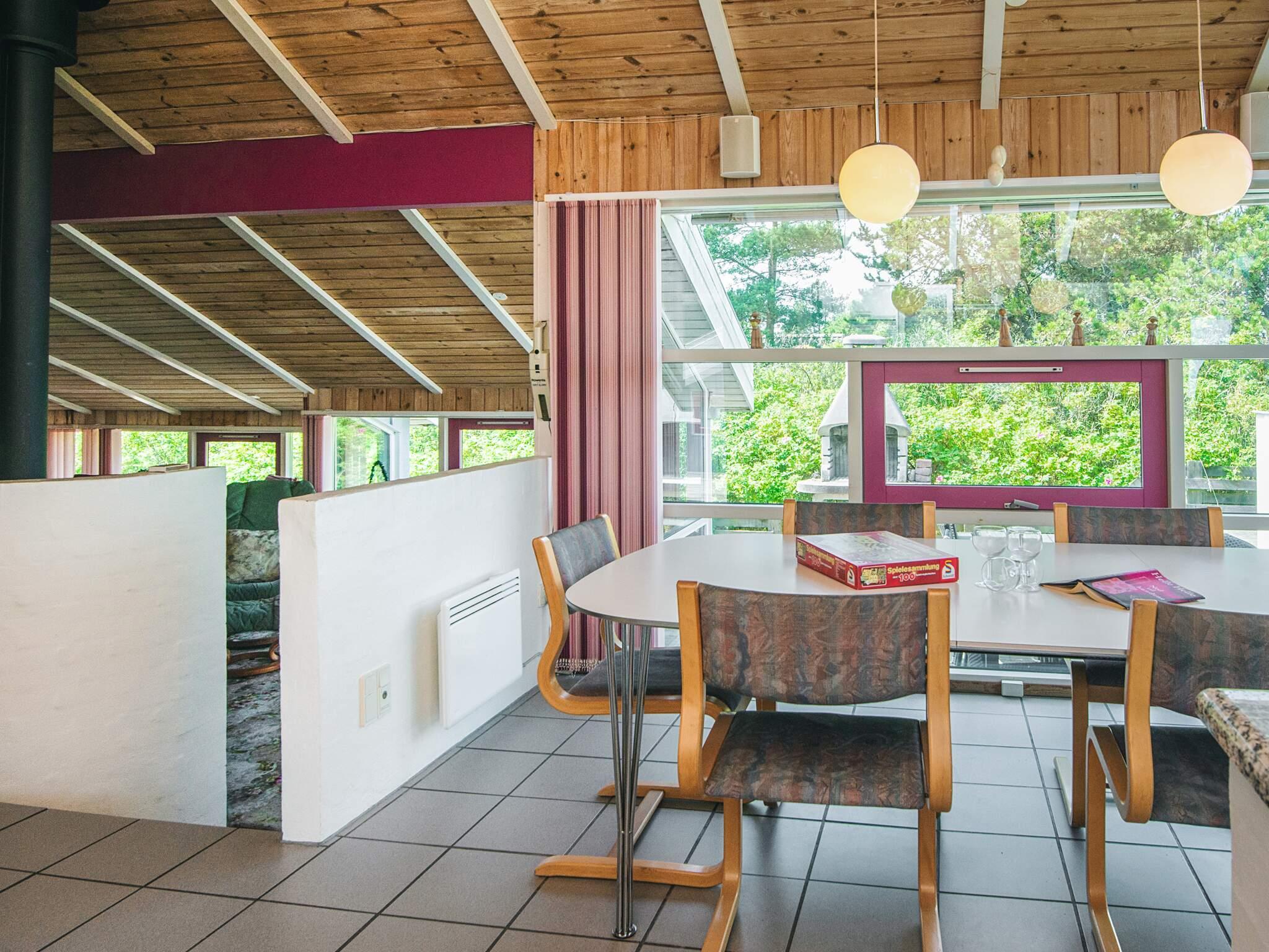 Holzferienhaus mit schöner Panoramaaussicht zum Fjellerup Strand. Die Aussicht lässt sich am besten vom Esstisch im offenen Küchen-/Wohnbereich genießen.