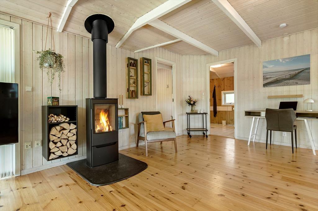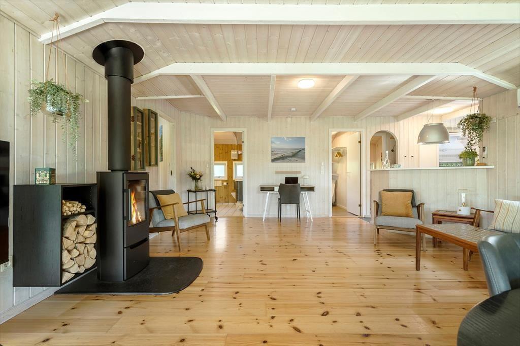 Der Wohnraum ist das Herzstück des Hauses. Er präsentiert sich als geräumige, luftige Oase und verfügt über einen Kaminofen, der an kühlen Abenden für ein Maximum an Wärme und Behaglichkeit sorgt. Lass dich im schönen Ohrensessel mit einem guten Buch nieder oder verbringe mit deiner Familie einen vergnügten Spieleabend am Esstisch. Die große, freie Bodenfläche des Raums ermöglicht es deinen Kindern, nach Herzenslust zu spielen und sich frei zu bewegen. Die Schlafplätze verteilen sich auf drei ansprechende Schlafräume und auf eine gemütliche Schlafnische, die sich tagsüber wunderbar für Nickerchen oder eine ruhige Lesestunde anbietet. Das große Badezimmer wird praktischerweise durch ein Gäste-WC ergänzt.