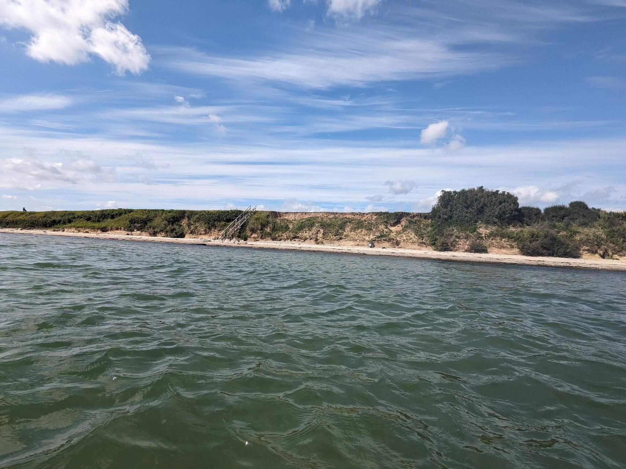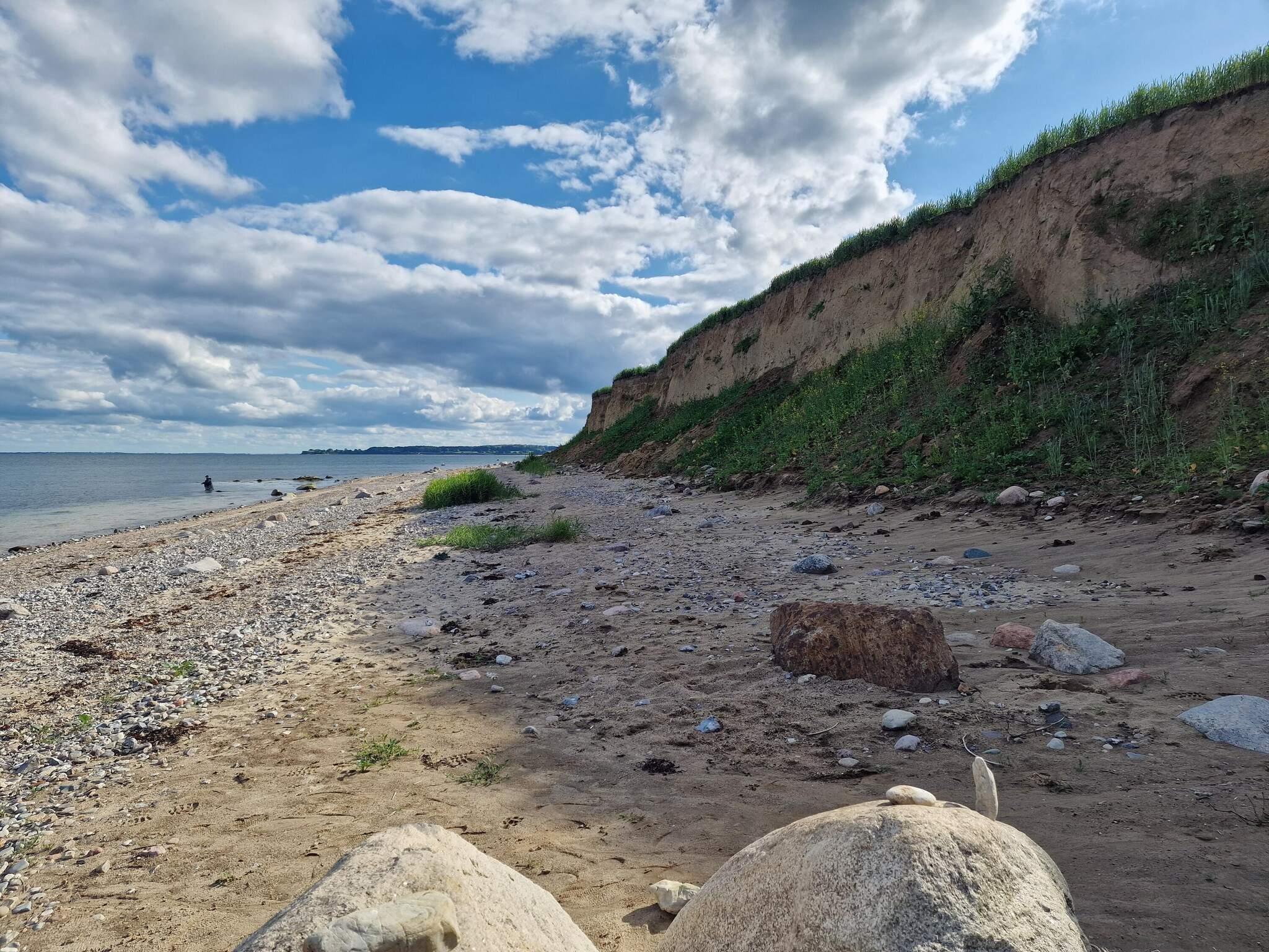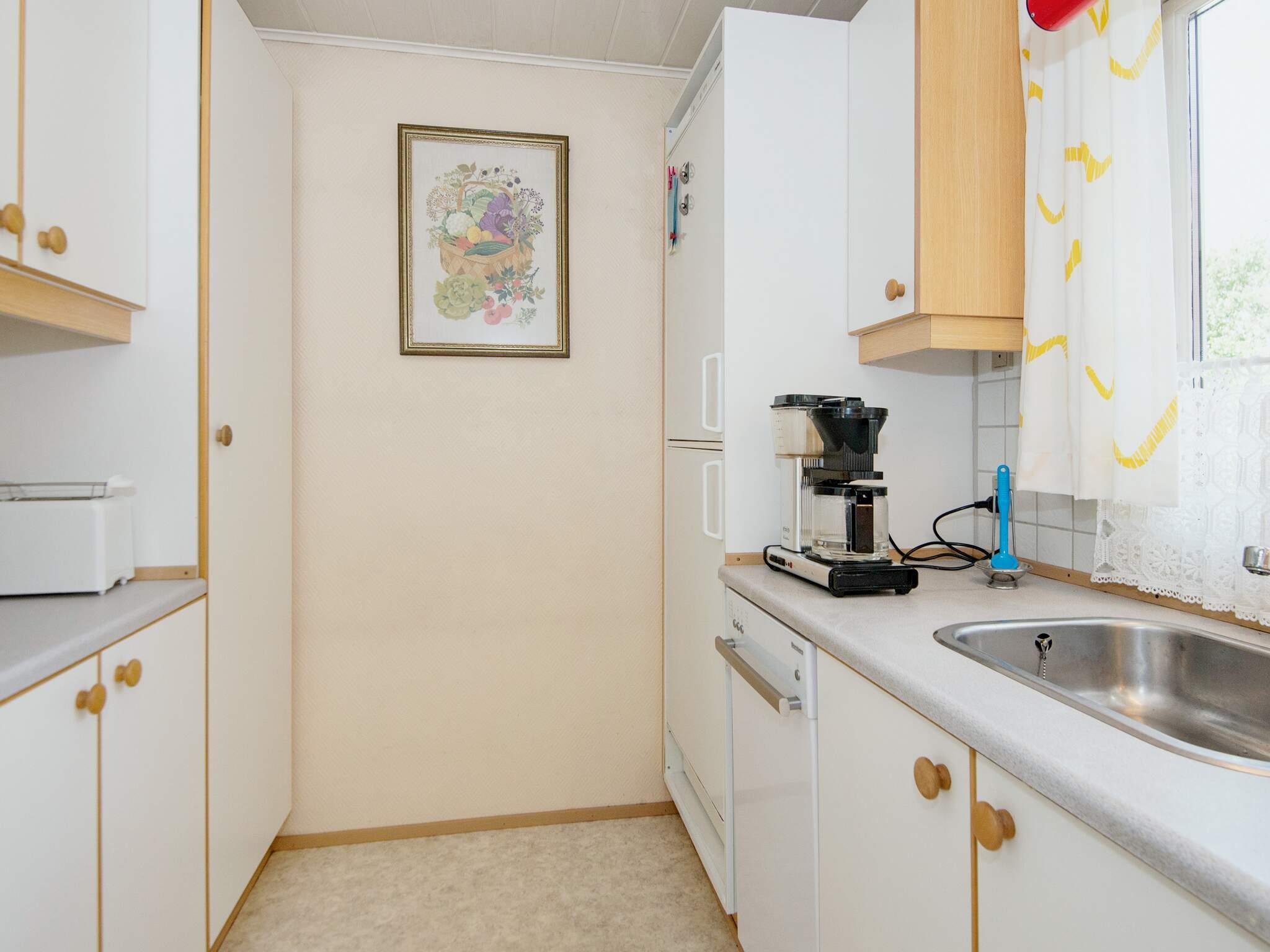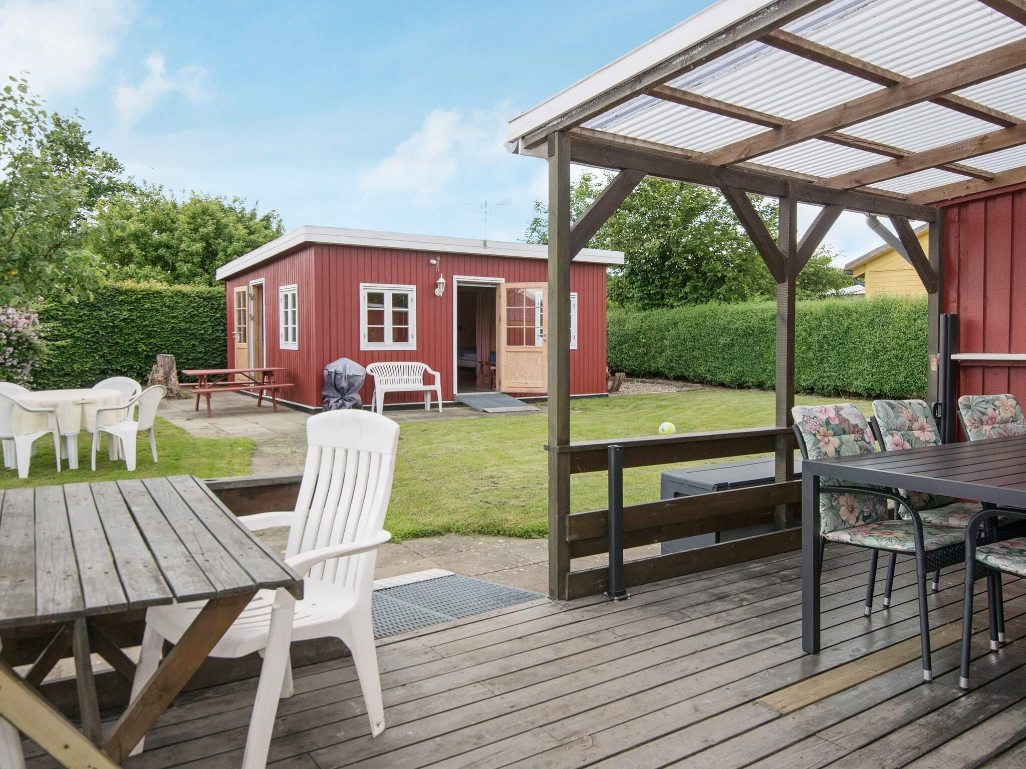 Bei Flovt Strand liegt dieses Ferienhaus mit Veranda sowie offener und überdachter Terrassenfläche. Im Wohnzimmer, das offen mit der Küche verbunden ist, sorgt ein Holzofen für gemütliche Wärme.