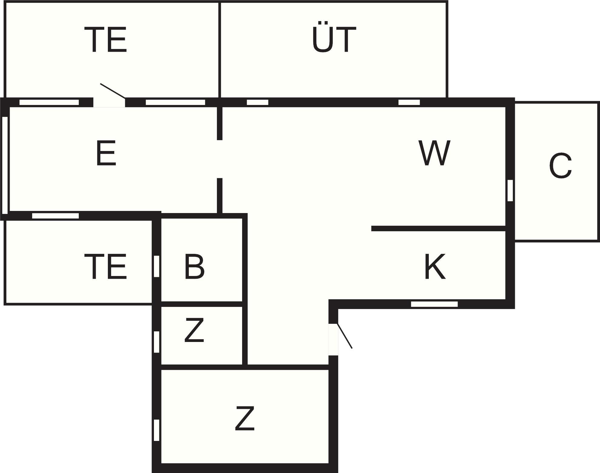 Off. Küche: E-Herd, Kühlschr. m. Gefrierfach, Mikrow., Abzugsh., Kaffeem., Spülm.