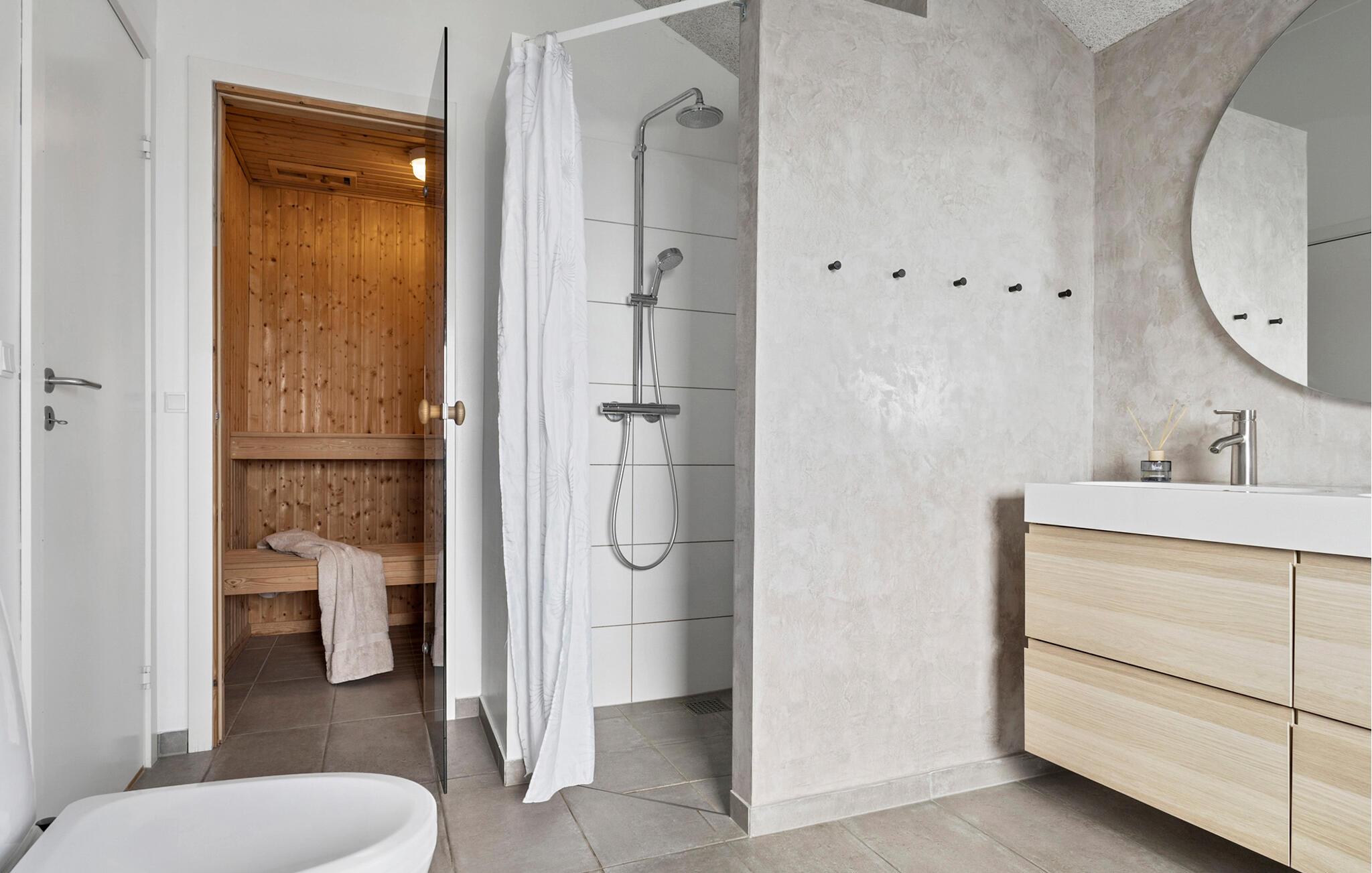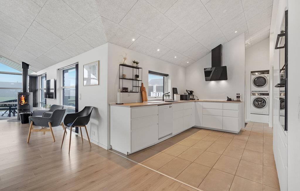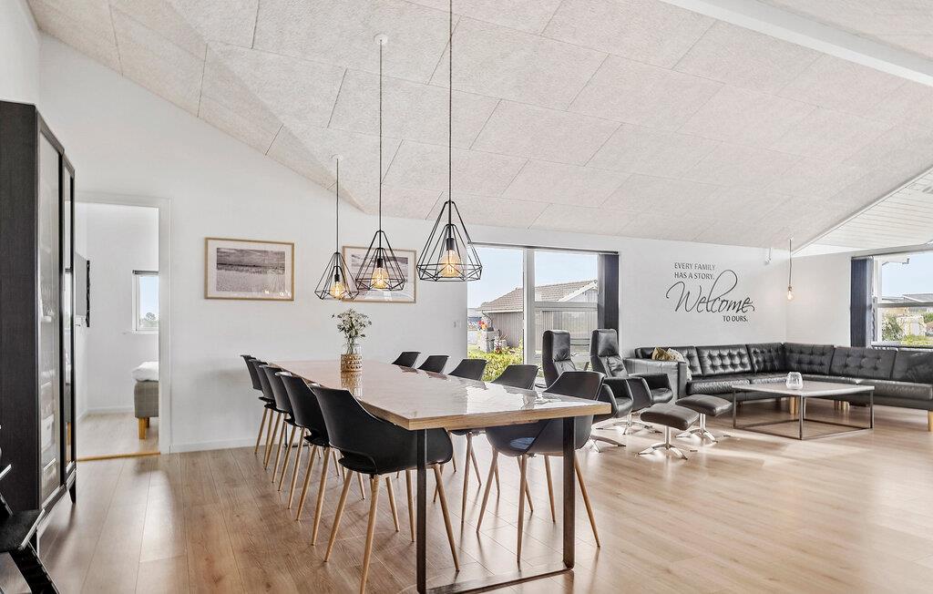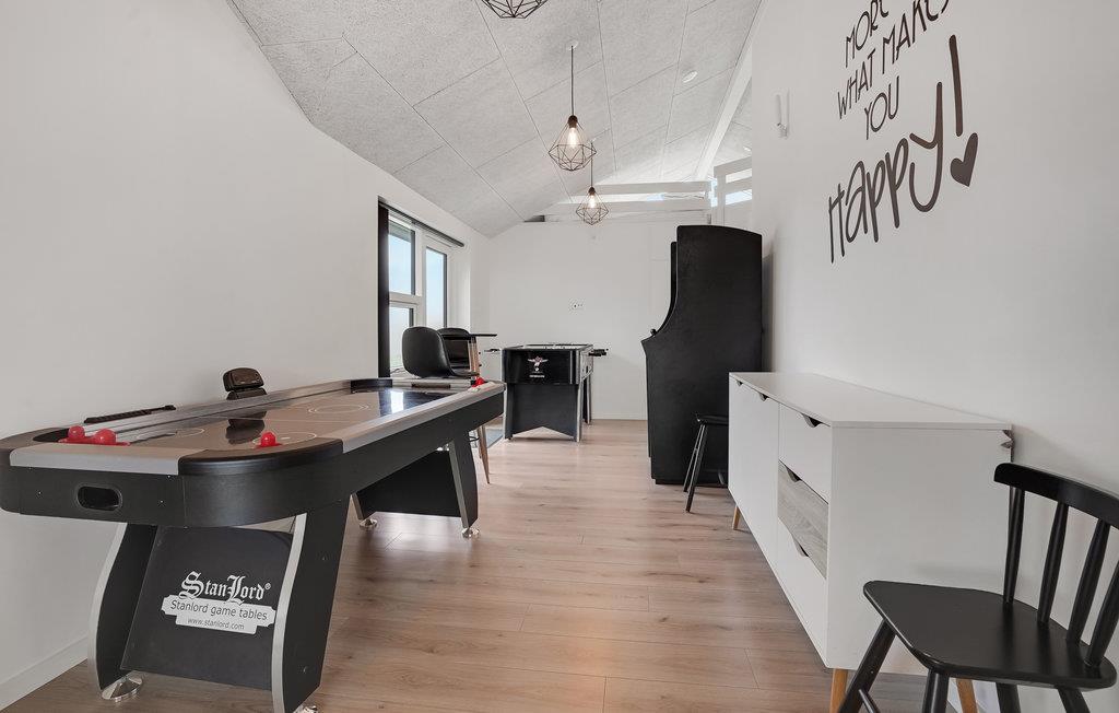 Im Inneren des Hauses erwartet Sie eine geräumige Kombination aus Küche und Wohnzimmer mit schönem Lichteinfall und Ausgang zur Terrasse. Das Haus bietet zwei Bäder, in einem davon befindet sich eine Badewanne sowie der Zugang zur Sauna, von hier aus gelangen Sie auch zum Außenwhirlpool. Außerdem gibt es einen schönen Aktivitätsraum mit Tischfußball, Airhockey und Arkadeautomat. Fünf Schlafzimmer mit Doppel- und Einzelbetten.
