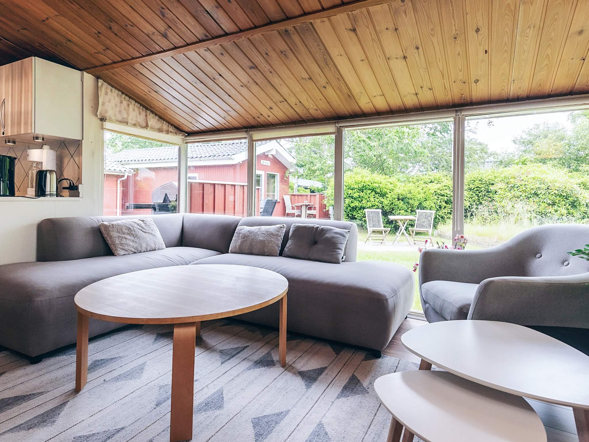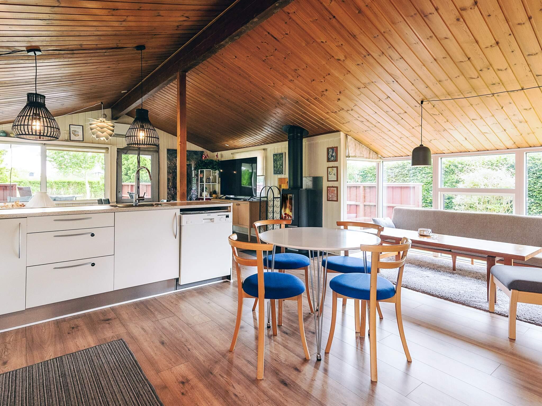 Im Ferienhaus gemütlich gestalteter Küchen-/Wohnbereich mit Essecke und Kaminofen, mit viel Platz für das Familienleben. Von dort hat man direkten Zugang zur Südterrasse davor. Zudem zwei Schlafzimmer und Bad im Haus.