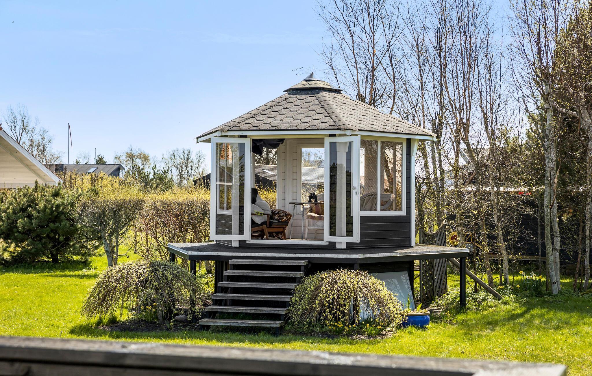 Charmantes Ferienhaus in Frederikshavn mit Meerblick, großem Gartenpavillon und gemütlichem Kaminofen für entspannte Urlaubstage.