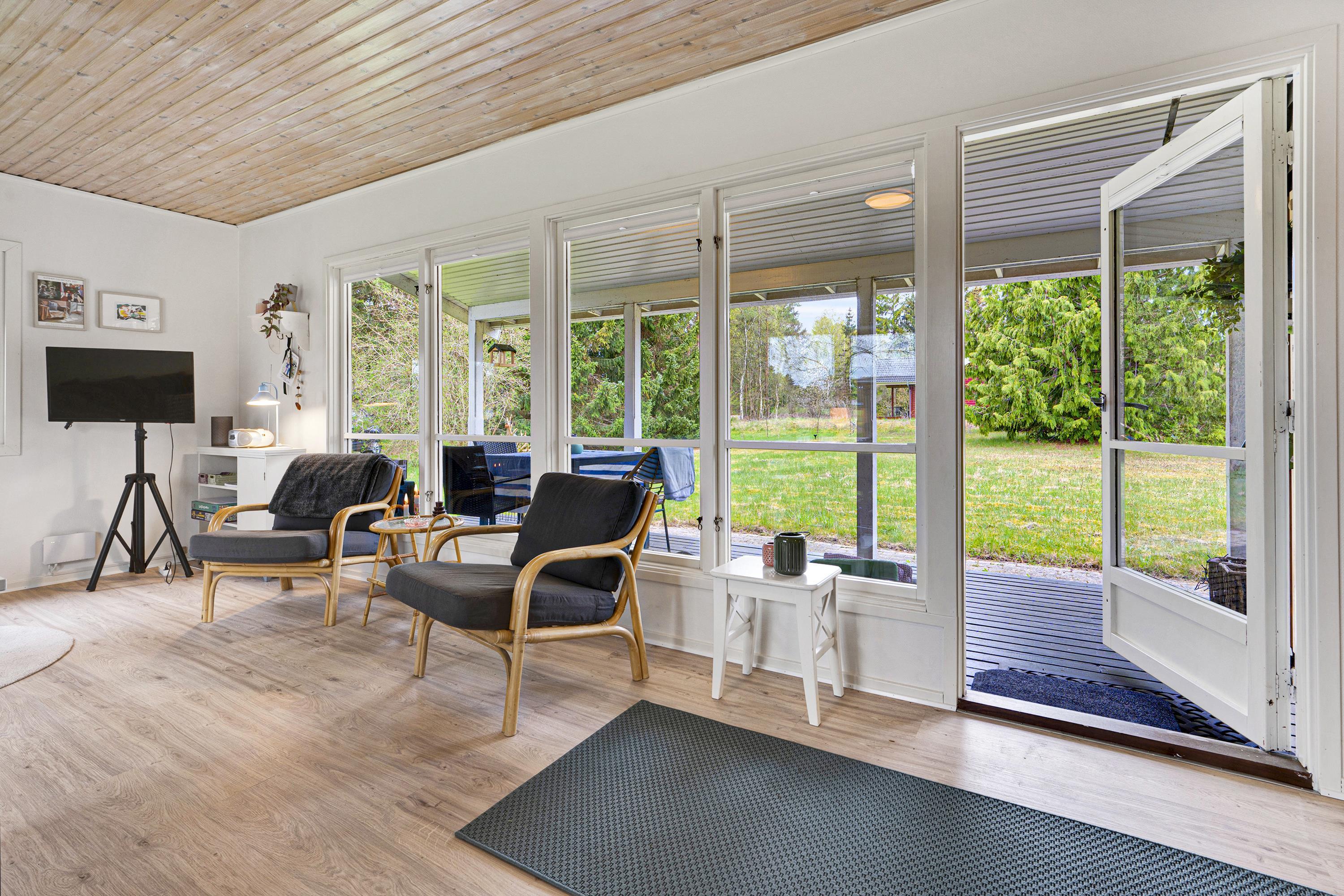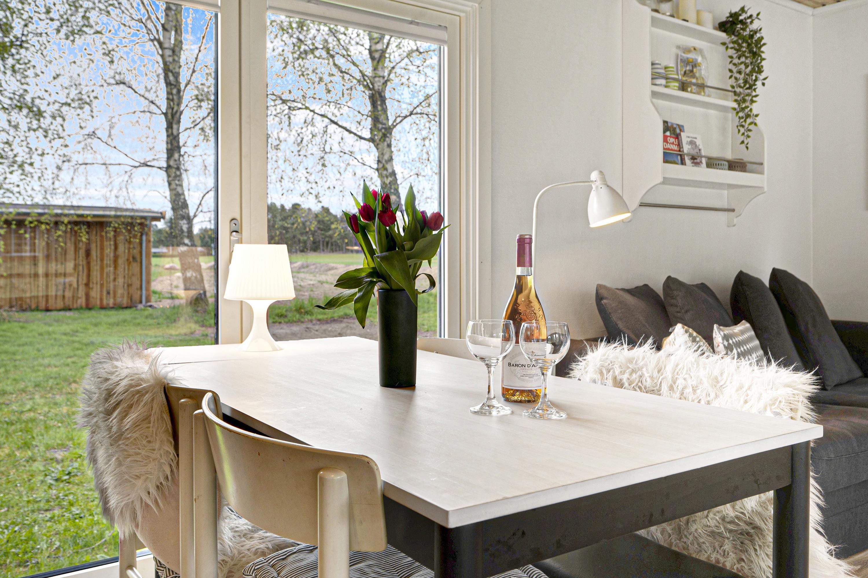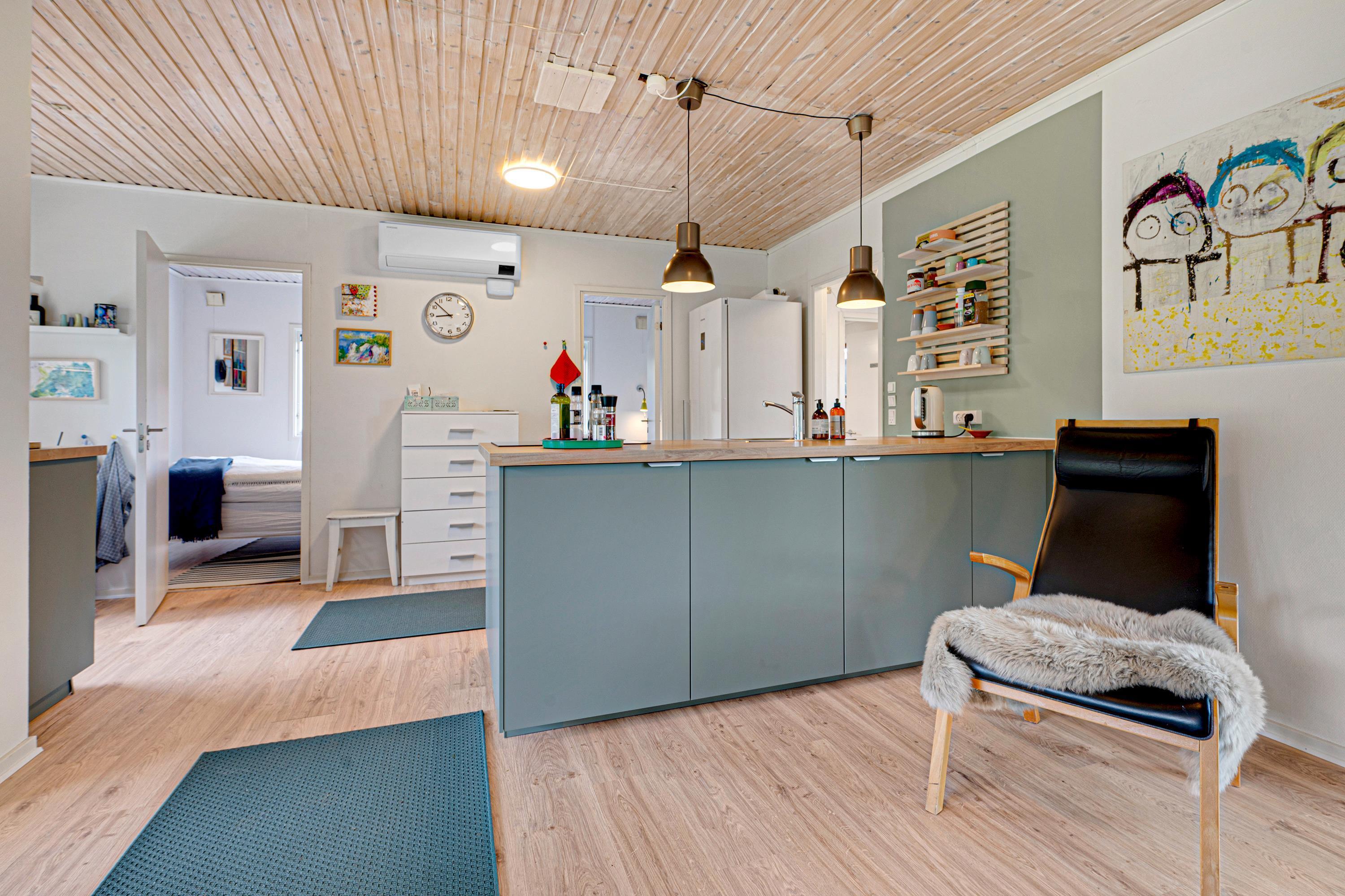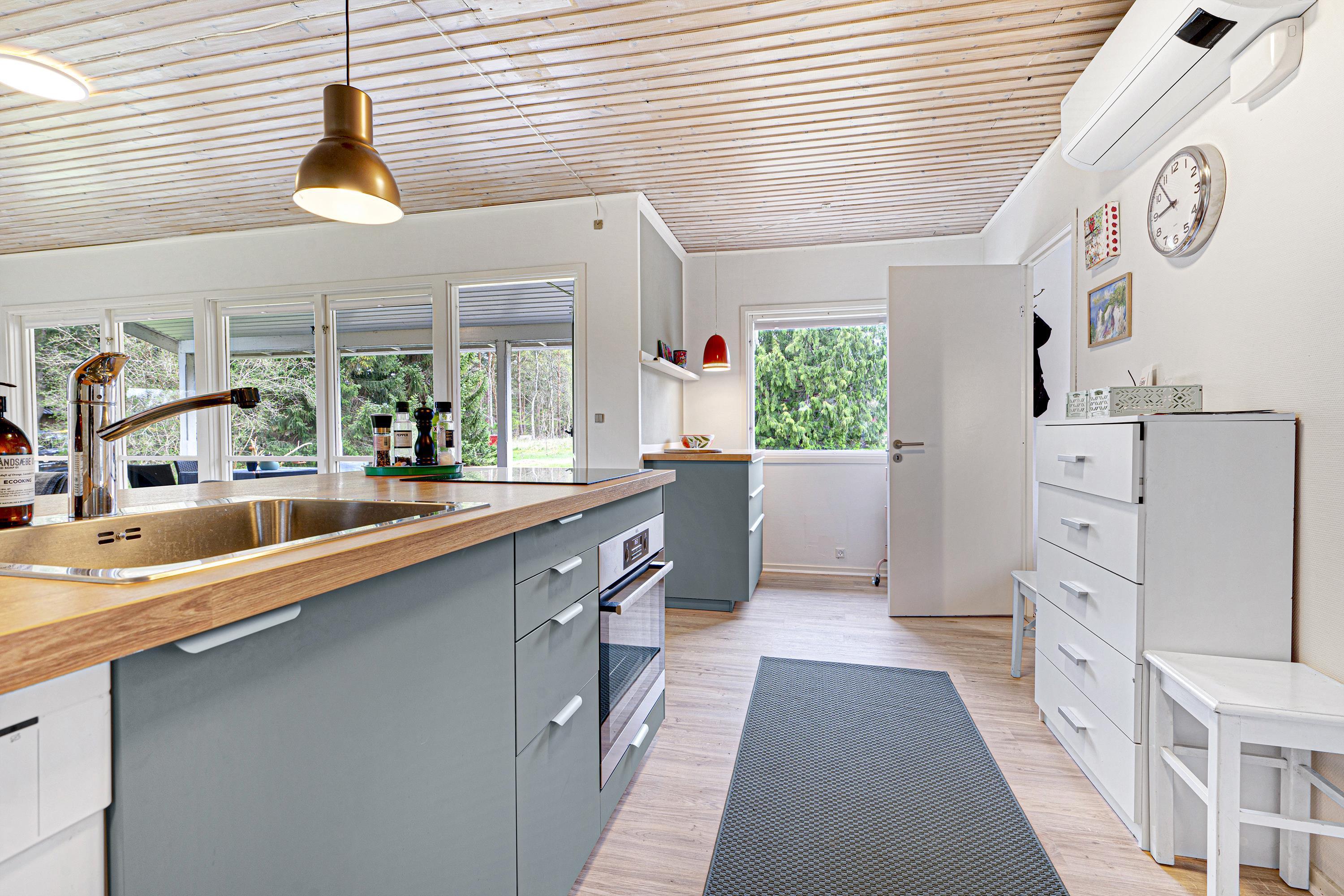 Das helle Wohnzimmer in offener Verbindung zur Küche hat Panoramafenster und Zugang zur Terrasse. Es gibt einen Essbereich für 6 Personen, Sofamöbel, Sessel und einen Flachbildfernseher mit Chromecast - beachten Sie, dass keine Kanäle angeschlossen sind, alle Inhalte müssen von einem PC oder anderen Medien gestreamt werden. Es gibt auch einen CD-Player und ein Radio. Neue, kleine, aber gut ausgestattete Küche mit Cerankochfeld, Backofen, Kühl-/Gefrierkombination und Geschirrspüler. Gutes, neues Badezimmer mit Dusche und Schrankeinrichtung. Die 6 Schlafplätze des Hauses verteilen sich auf 2 helle Schlafzimmer mit einem Doppelbett und einer Doppelschlafcouch im Wohnzimmer. Für die Kleinen gibt es einen Hochstuhl. Das Haus verfügt über eine Wärmepumpe mit Klimaanlage. Internet ist im Ferienhaus vorhanden.
