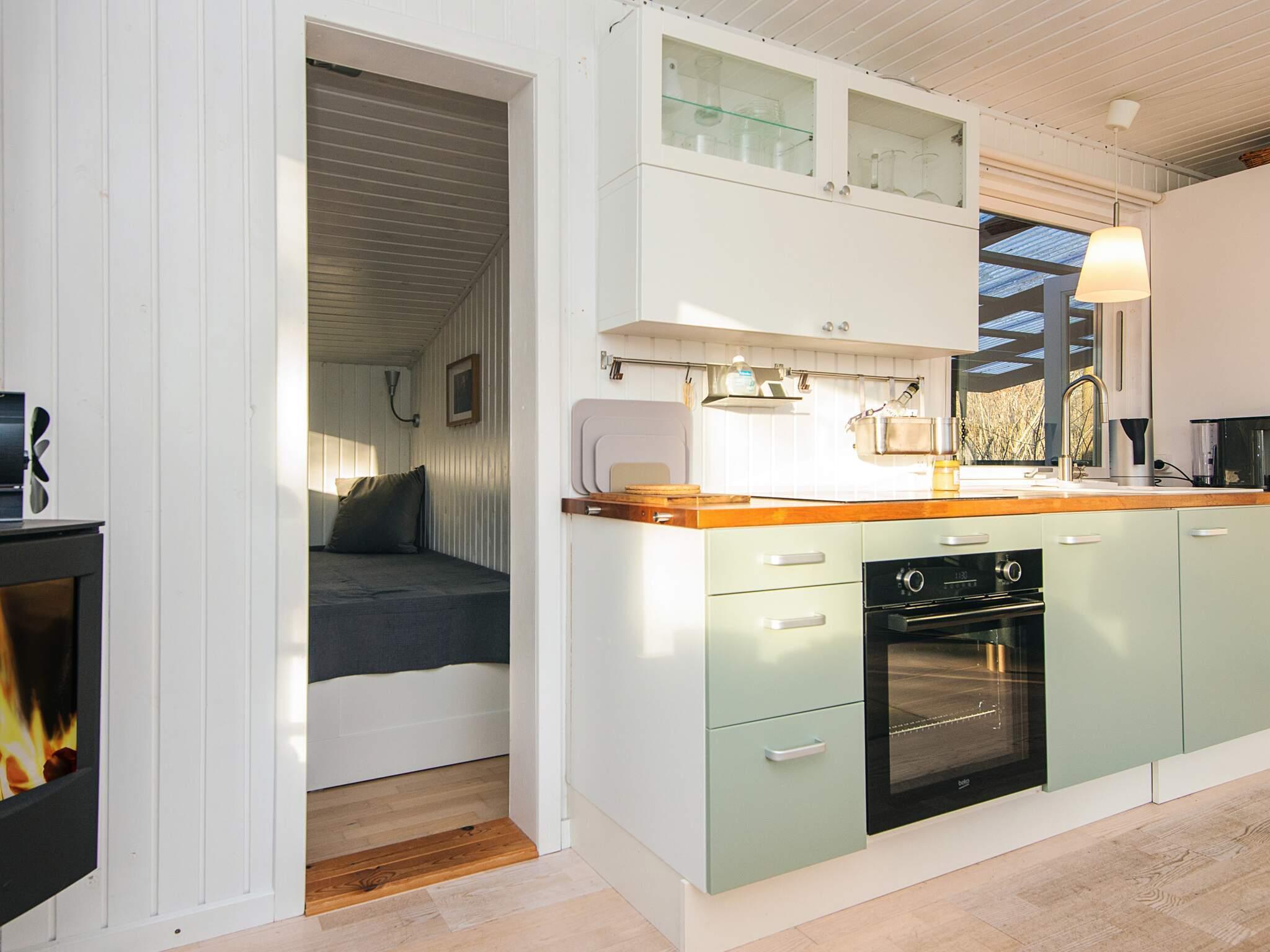 Das Innere des Hauses ist schlicht und minimalistisch eingerichtet. Es verfügt über einen Raum mit einem Etagenbett und einem Schlafsofa, das in ein Doppelbett umgewandelt werden kann, sodass es für ein Paar, eine kleine Familie oder enge Freunde geeignet ist. Das Fehlen eines Fernsehers betont die persönliche Interaktion und Gemütlichkeit und ermutigt die Gäste, Zeit miteinander zu verbringen, sich zu unterhalten oder ruhige Momente mit einem Buch zu genießen. Die Innenausstattung unterstreicht die Offenheit und Helligkeit und lässt die natürliche Umgebung draußen den Ton im Innenraum bestimmen.
