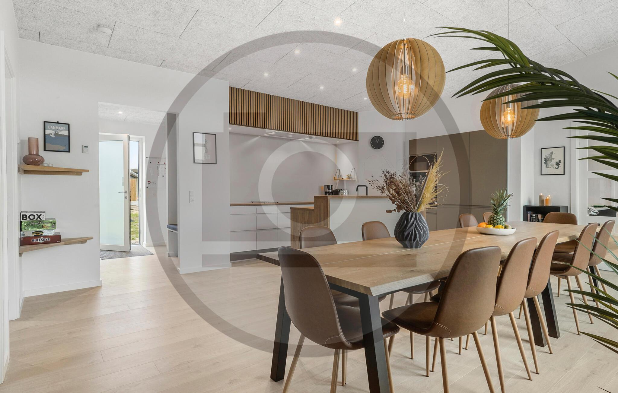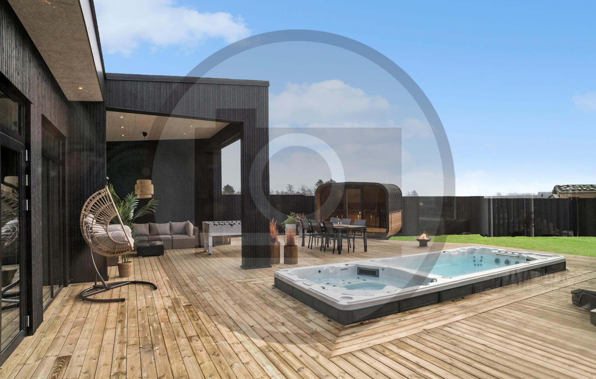 Erleben Sie Luxus im modernen Ferienhaus mit Pool, Whirlpool und Sauna, idyllisch im Wald bei Ebeltoft gelegen.