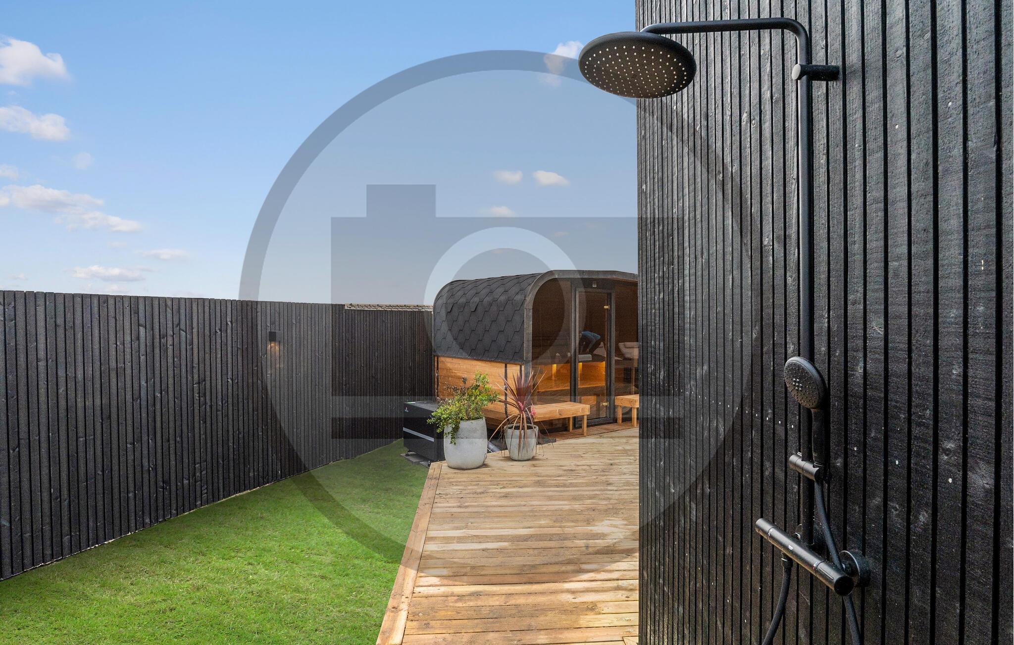 Die geräumige Terrasse mit dem überdachten Bereich wird Ihr Lieblingsplatz an Sonnentagen. Hier finden Sie sowohl Pool als auch Whirlpool sowie eine Außensauna, eine Warmwasserdusche und ein Kaltwasserbecken. Lassen Sie den Tag mit einem Grillabend ausklingen.